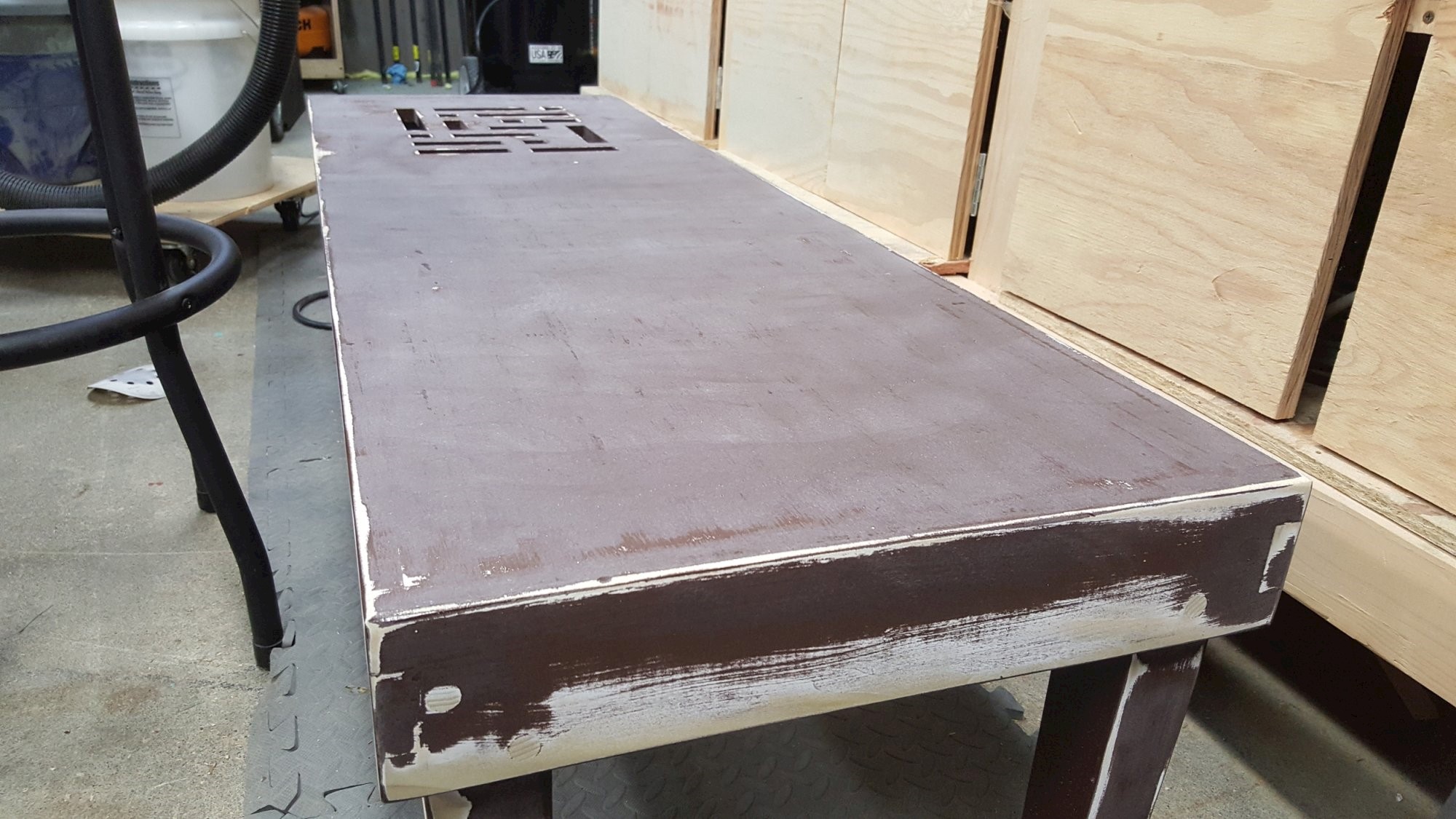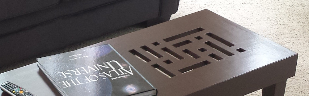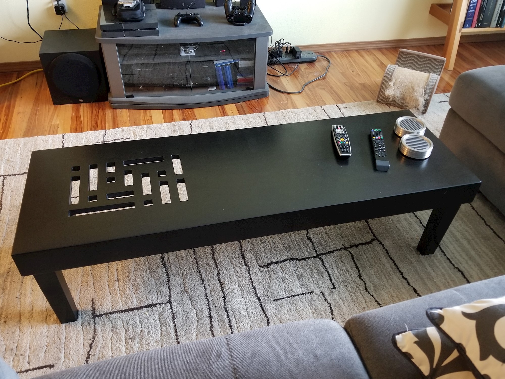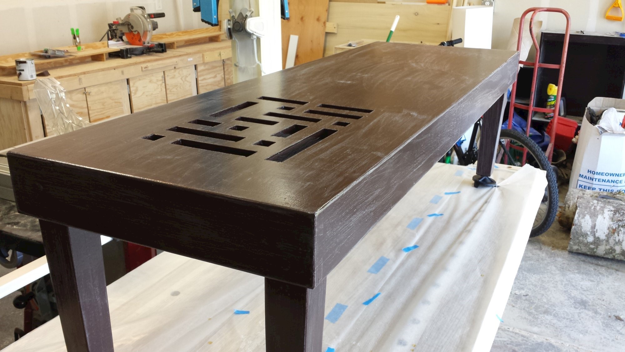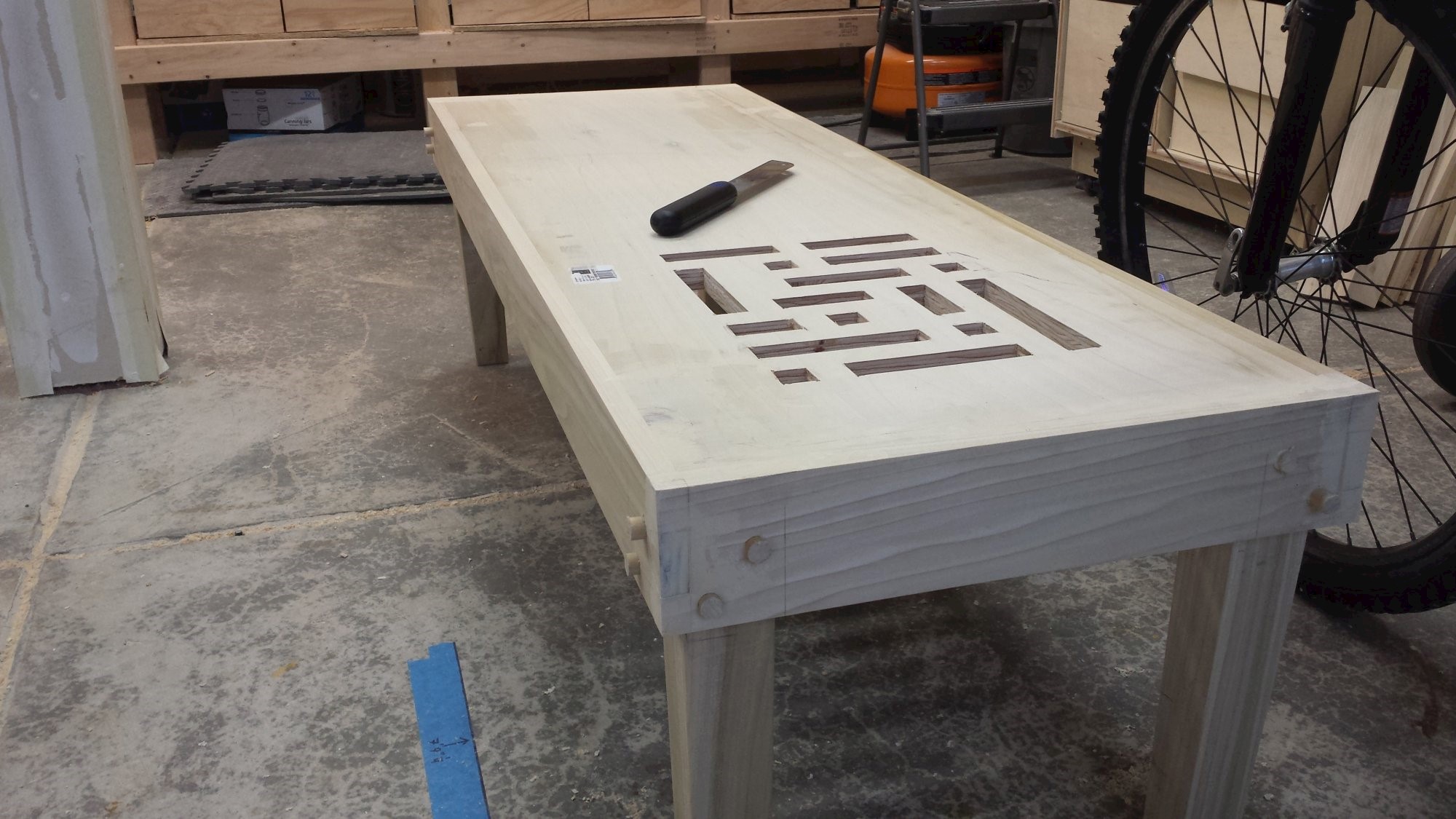 Low, long coffee table with a custom design cut into the top. Poplar plywood, rough poplar, and Java brown acrylic paint, finished with waterborne polyurethane.