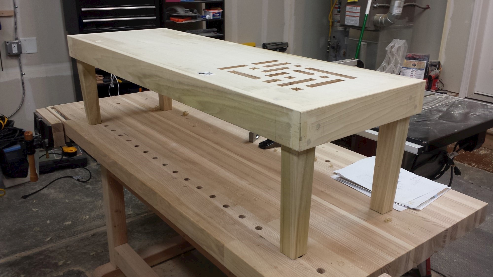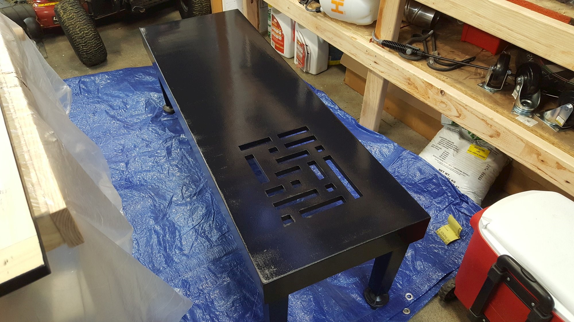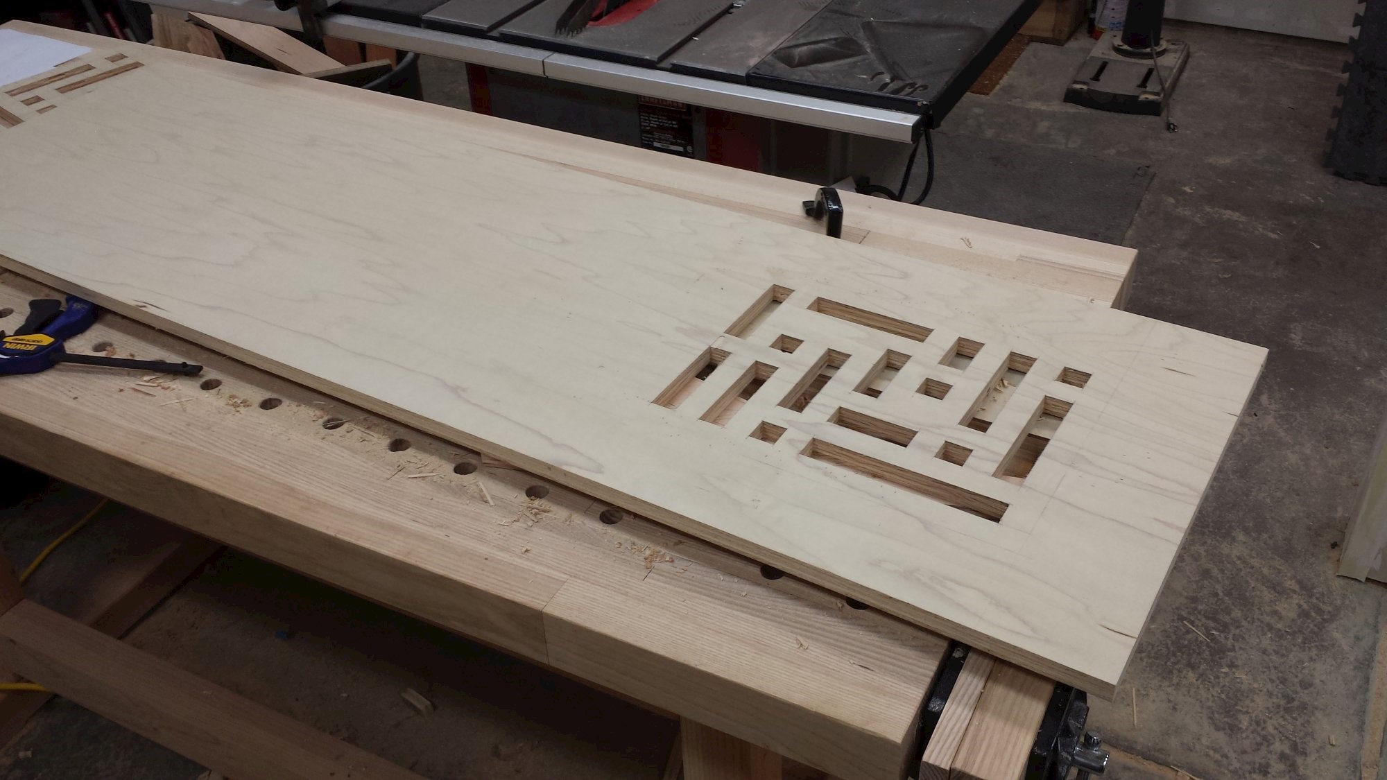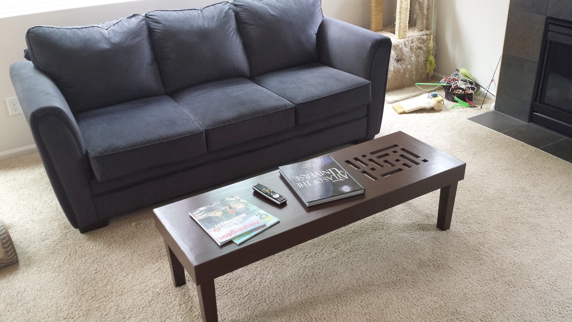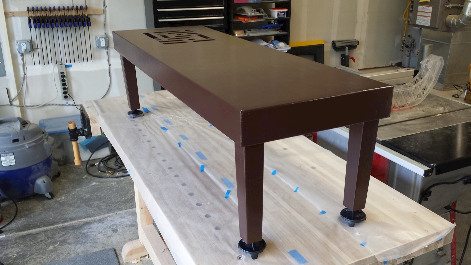 Low, long coffee table with a custom design cut into the top. Poplar plywood, rough poplar, and Java brown acrylic paint, finished with waterborne polyurethane.