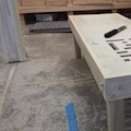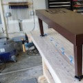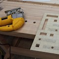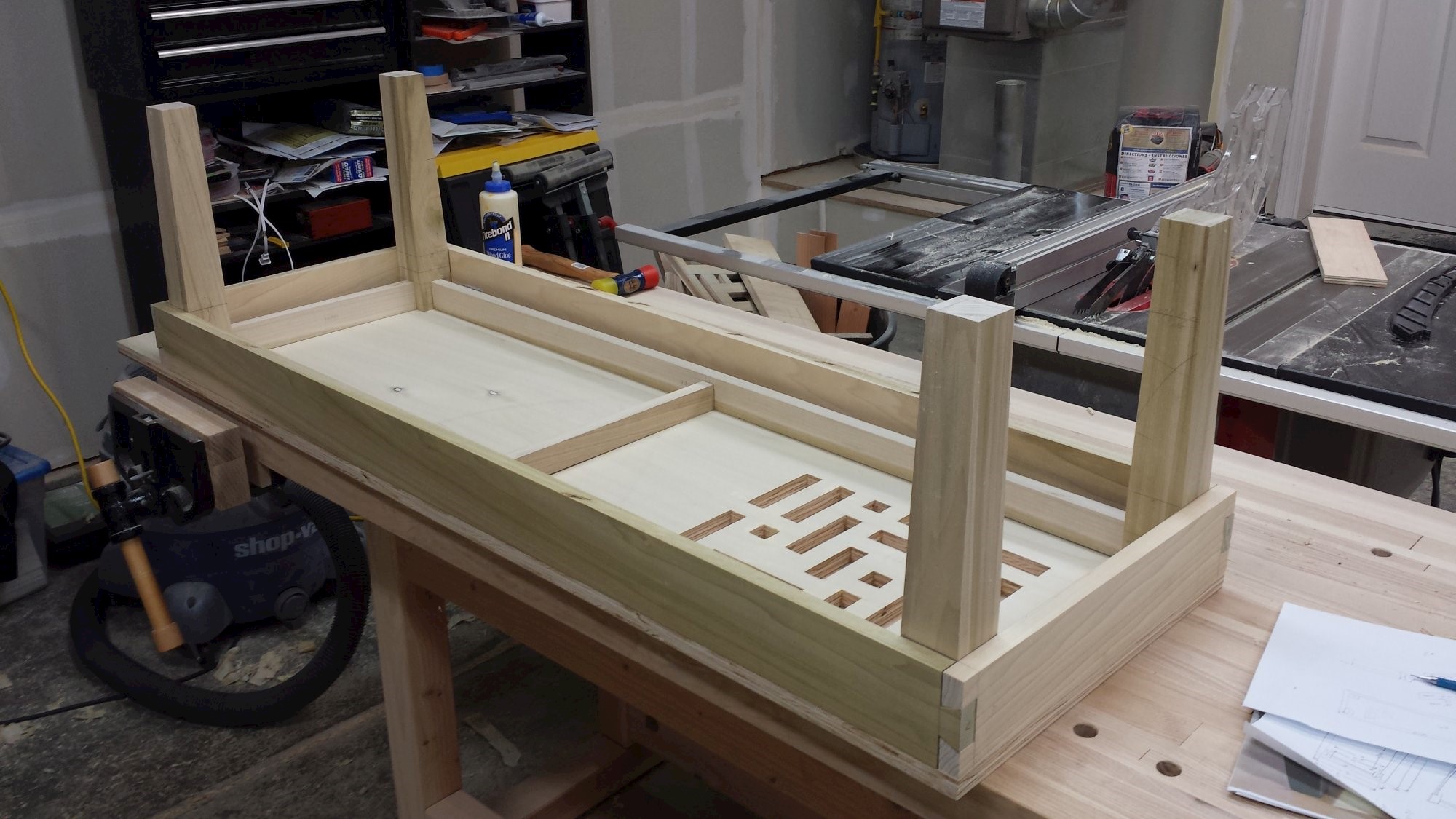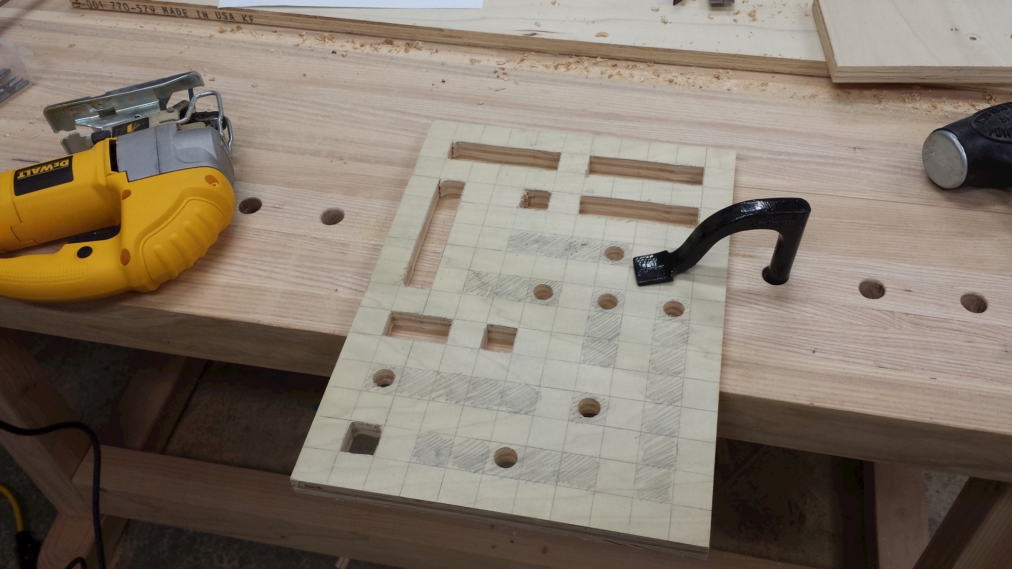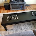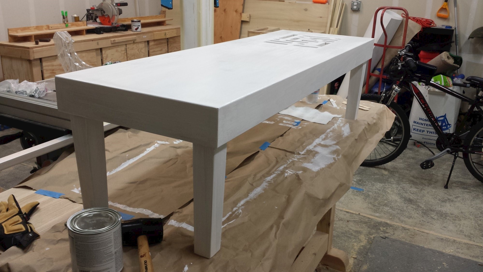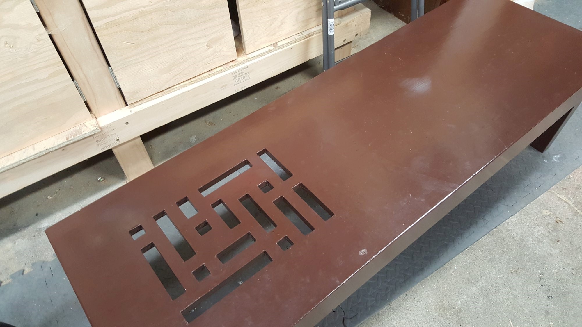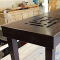 Low, long coffee table with a custom design cut into the top. Poplar plywood, rough poplar, and Java brown acrylic paint, finished with waterborne polyurethane.