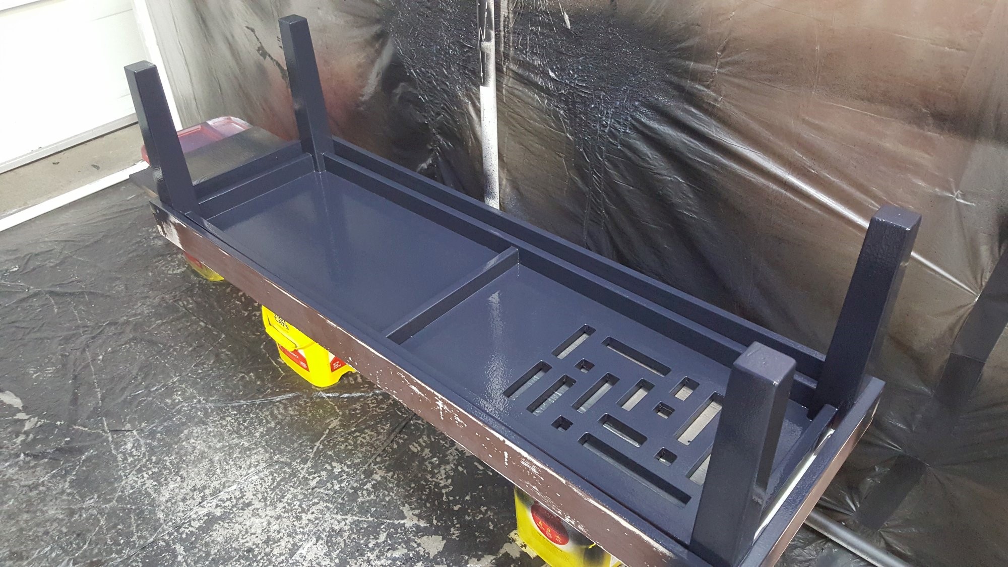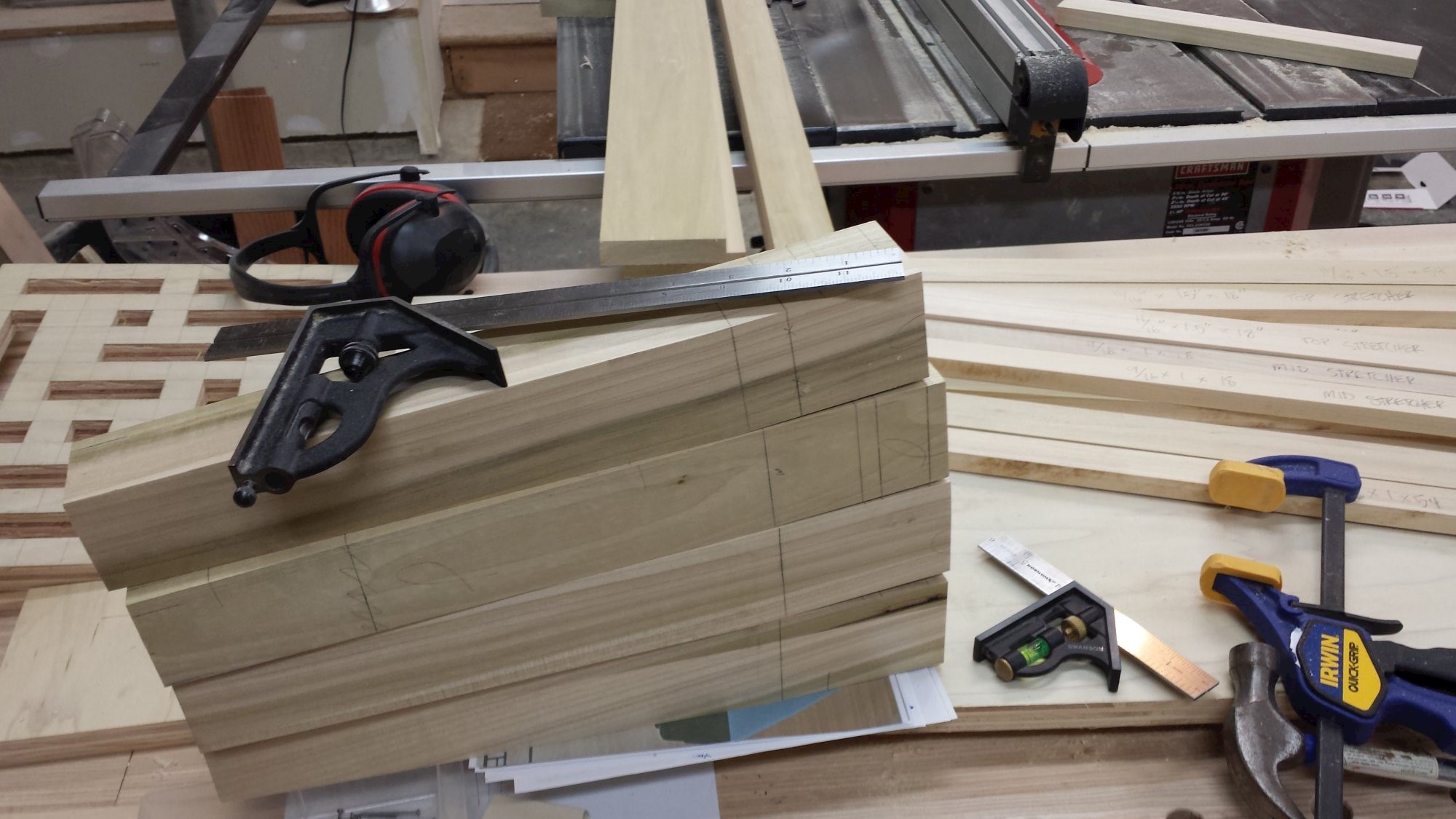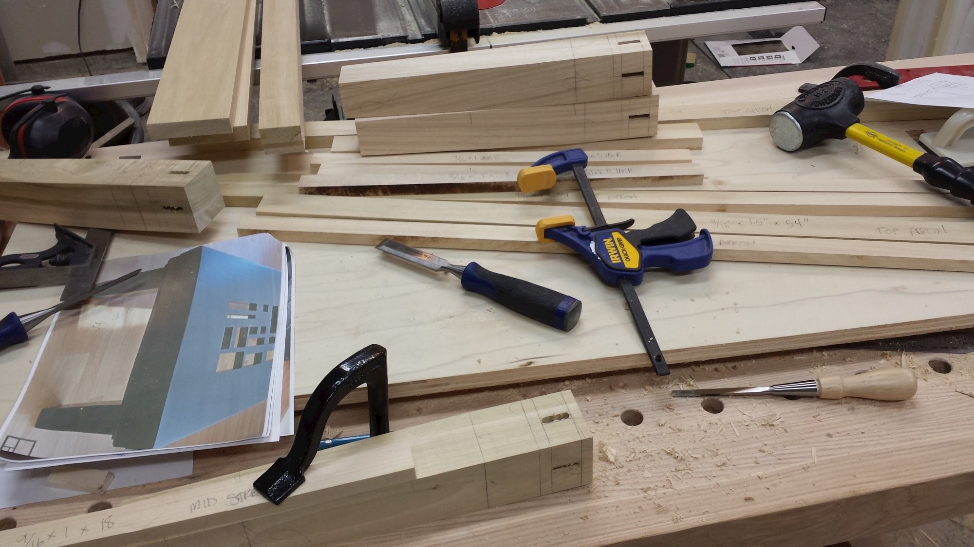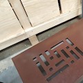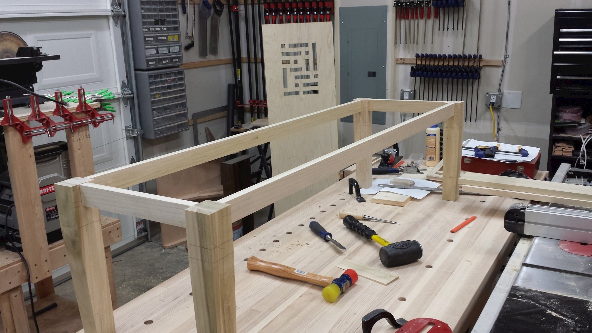 Low, long coffee table with a custom design cut into the top. Poplar plywood, rough poplar, and Java brown acrylic paint, finished with waterborne polyurethane.