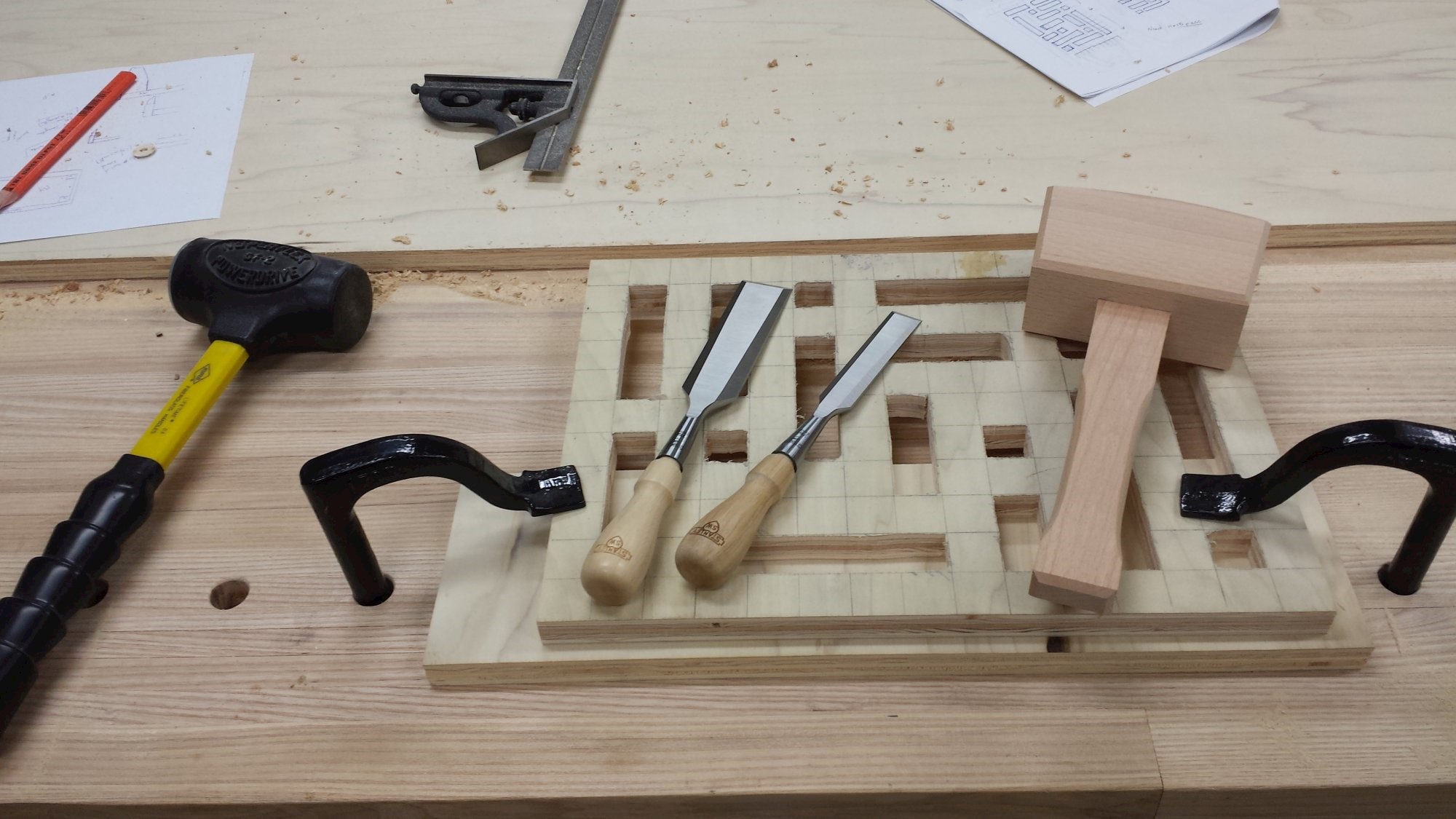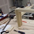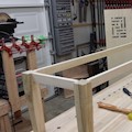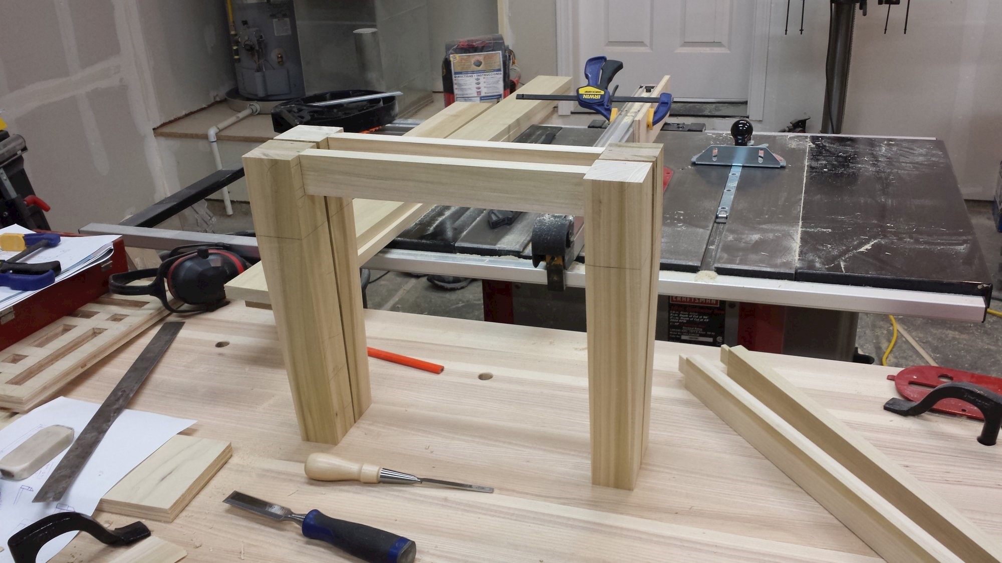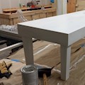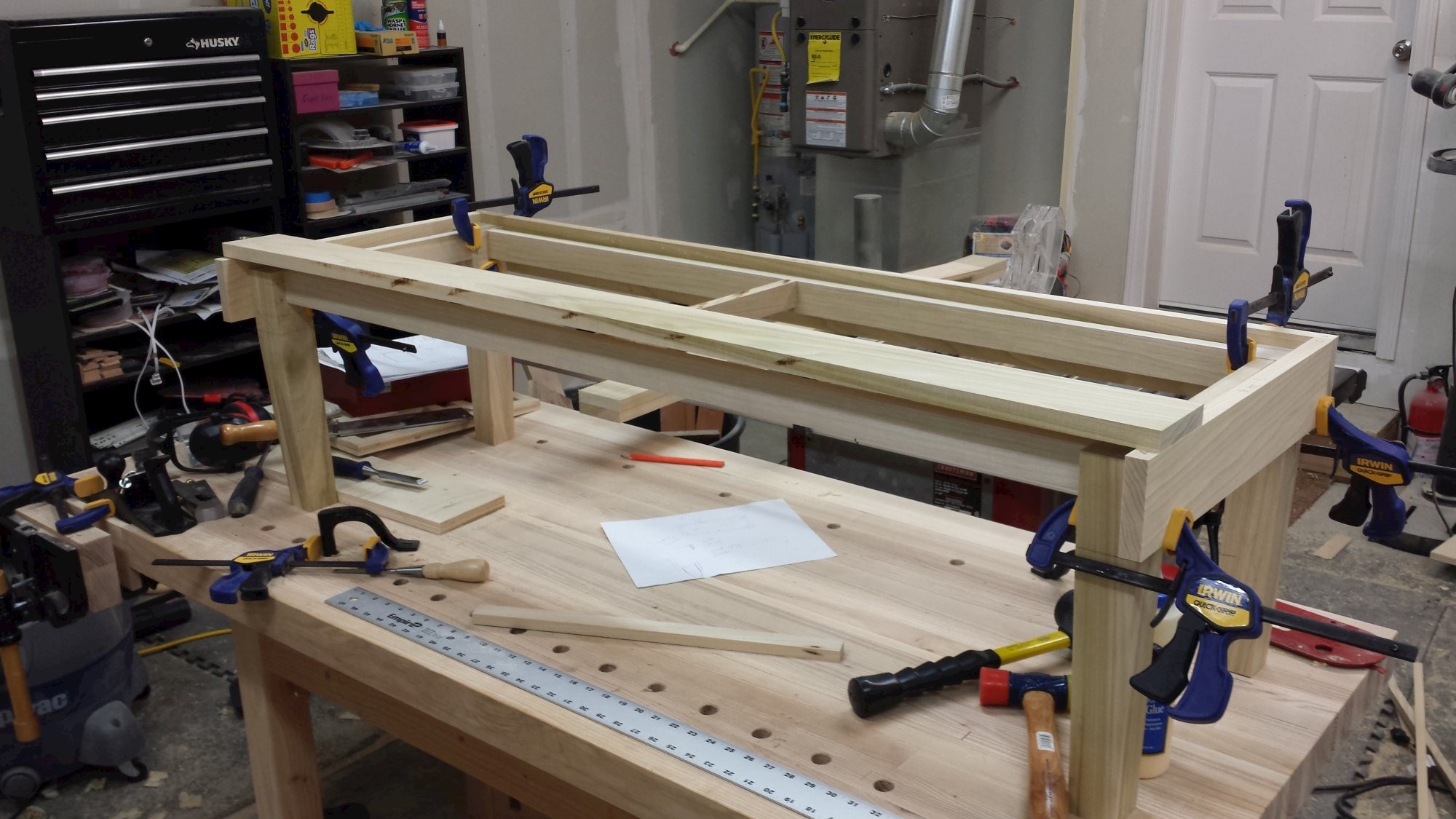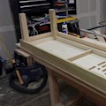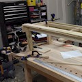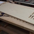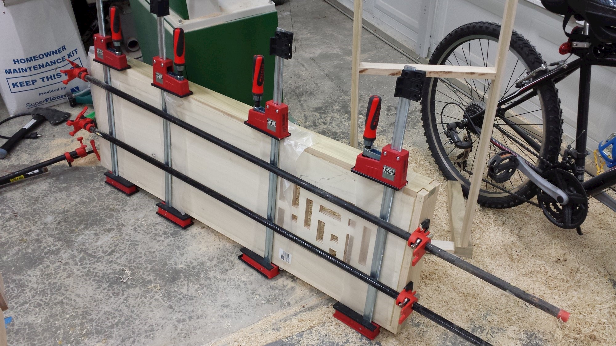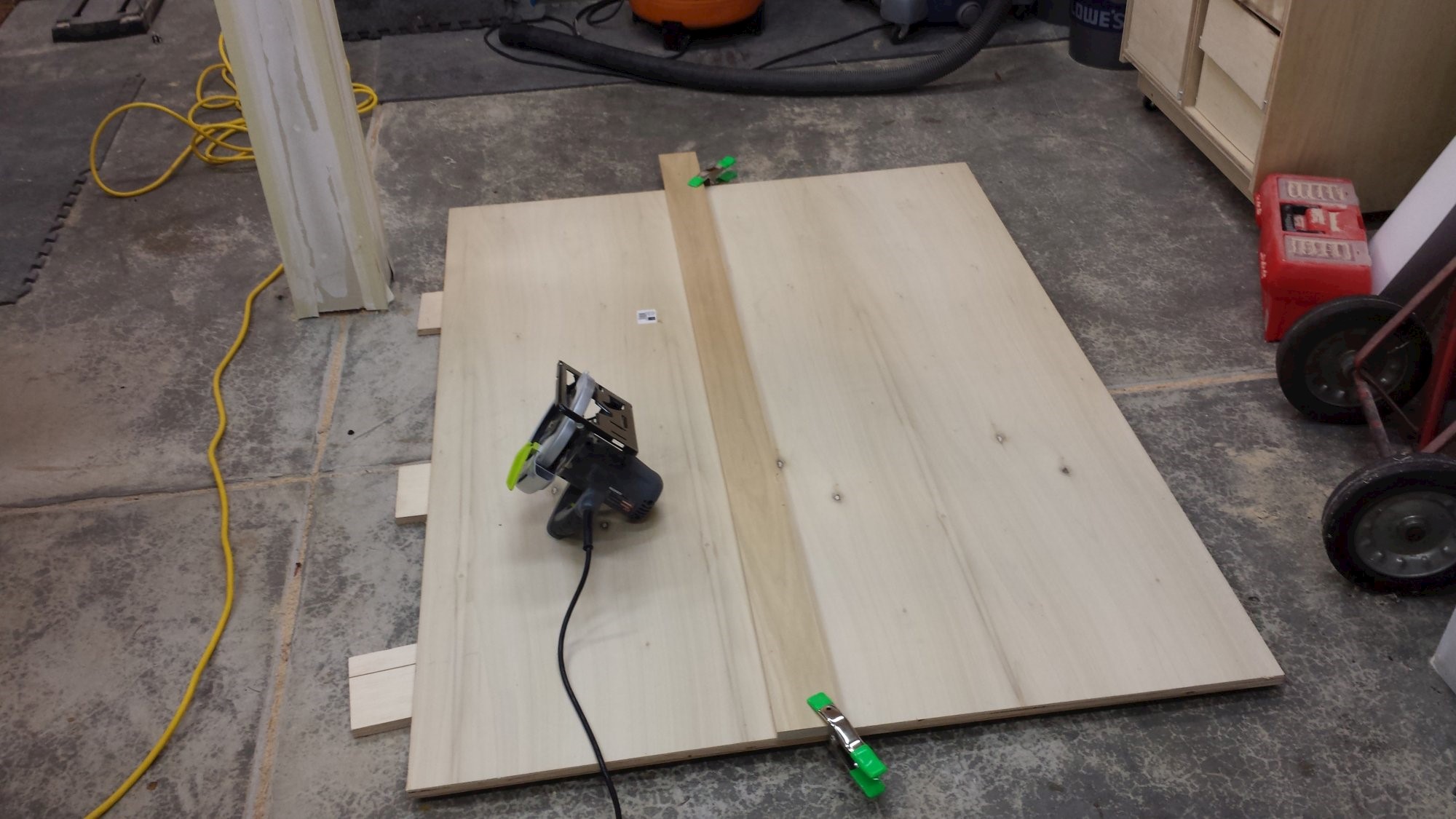 Low, long coffee table with a custom design cut into the top. Poplar plywood, rough poplar, and Java brown acrylic paint, finished with waterborne polyurethane.