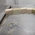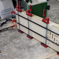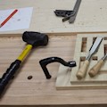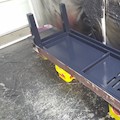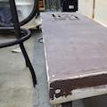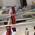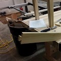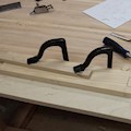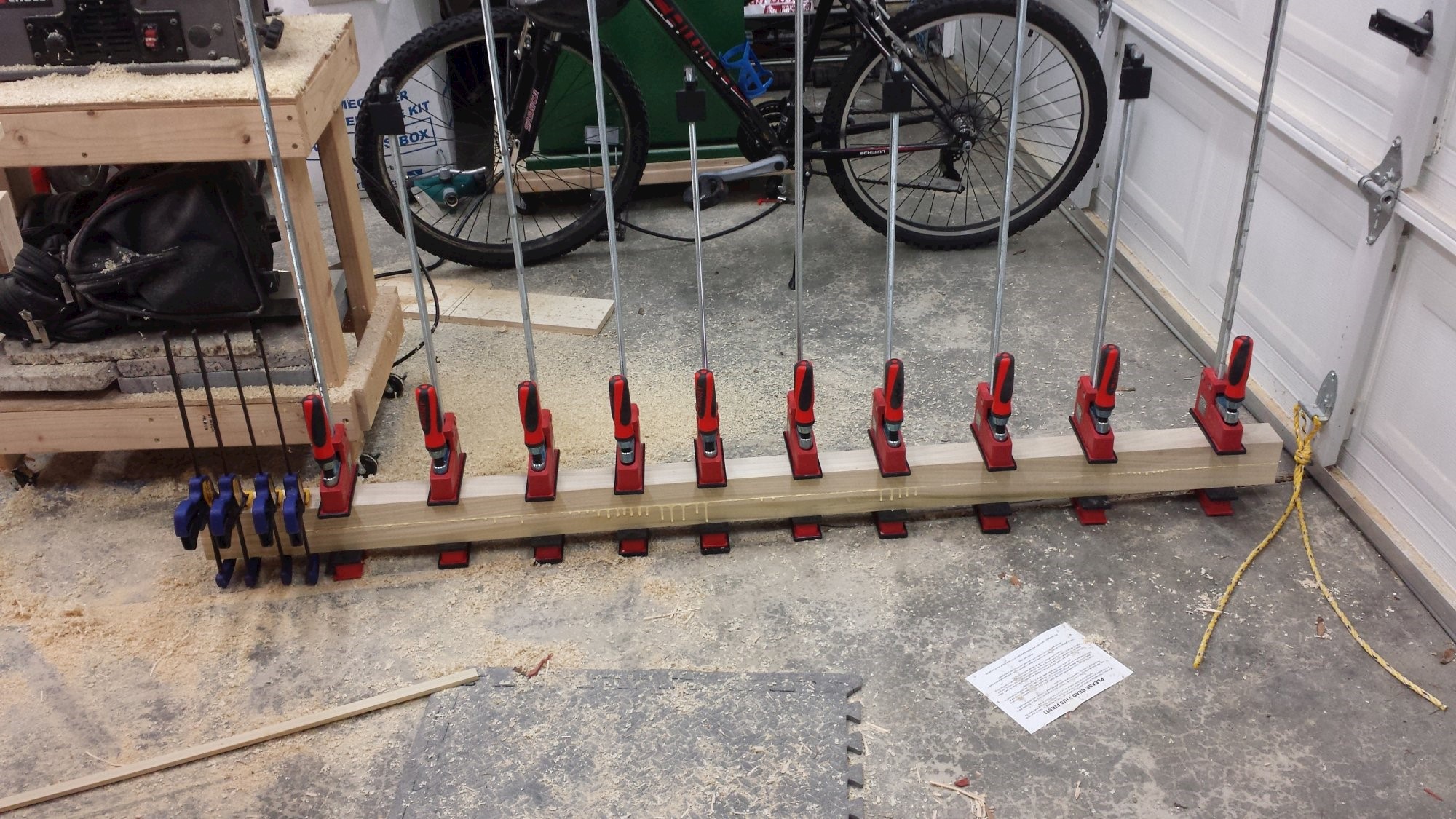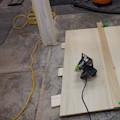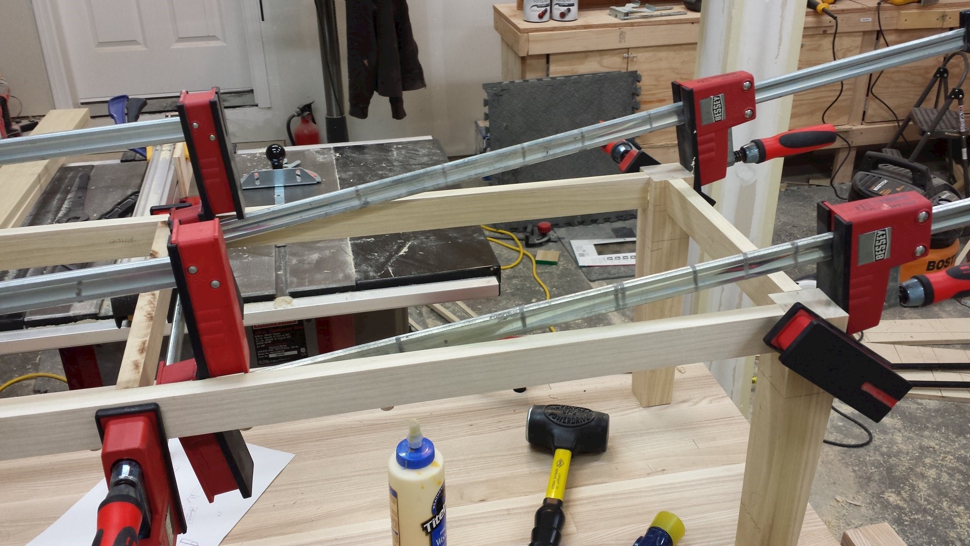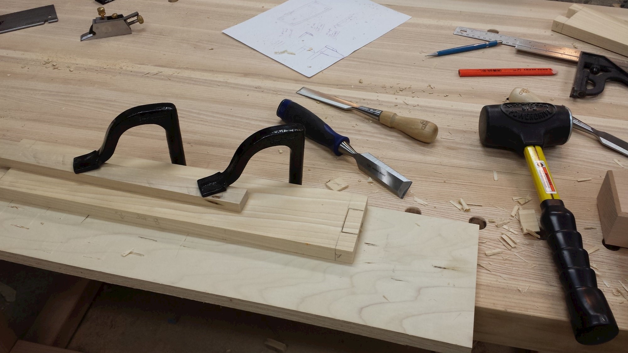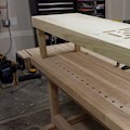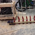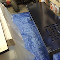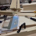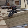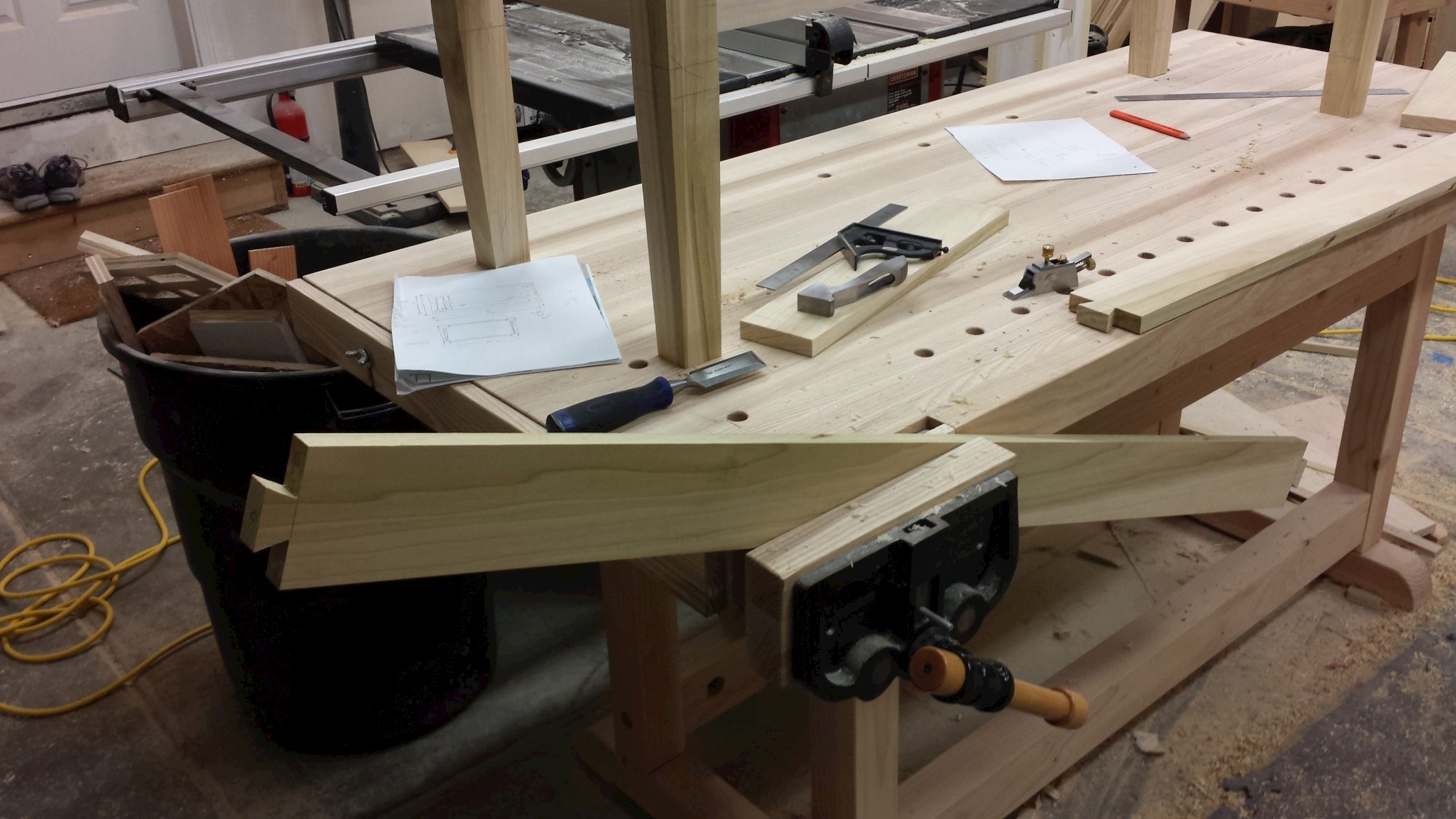 Low, long coffee table with a custom design cut into the top. Poplar plywood, rough poplar, and Java brown acrylic paint, finished with waterborne polyurethane.