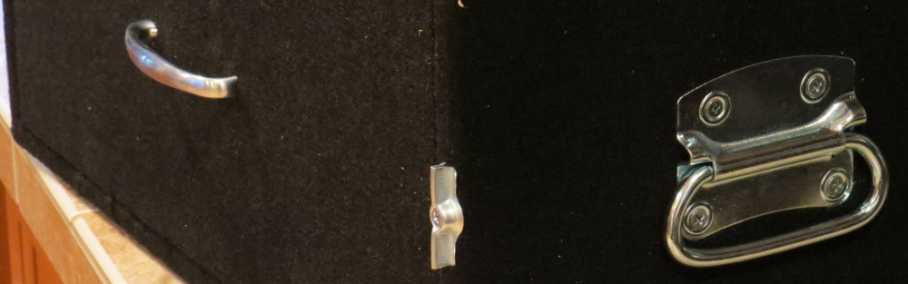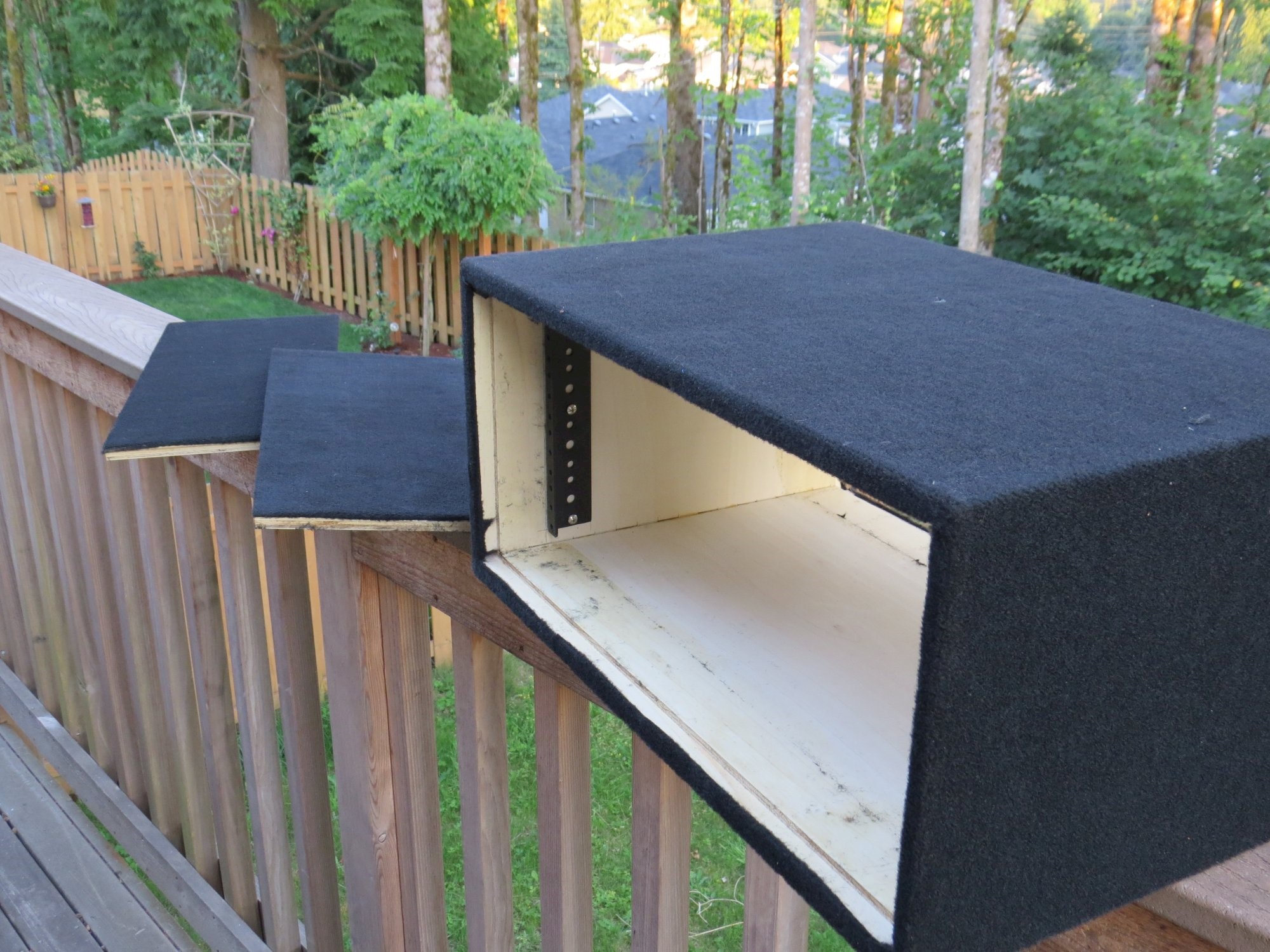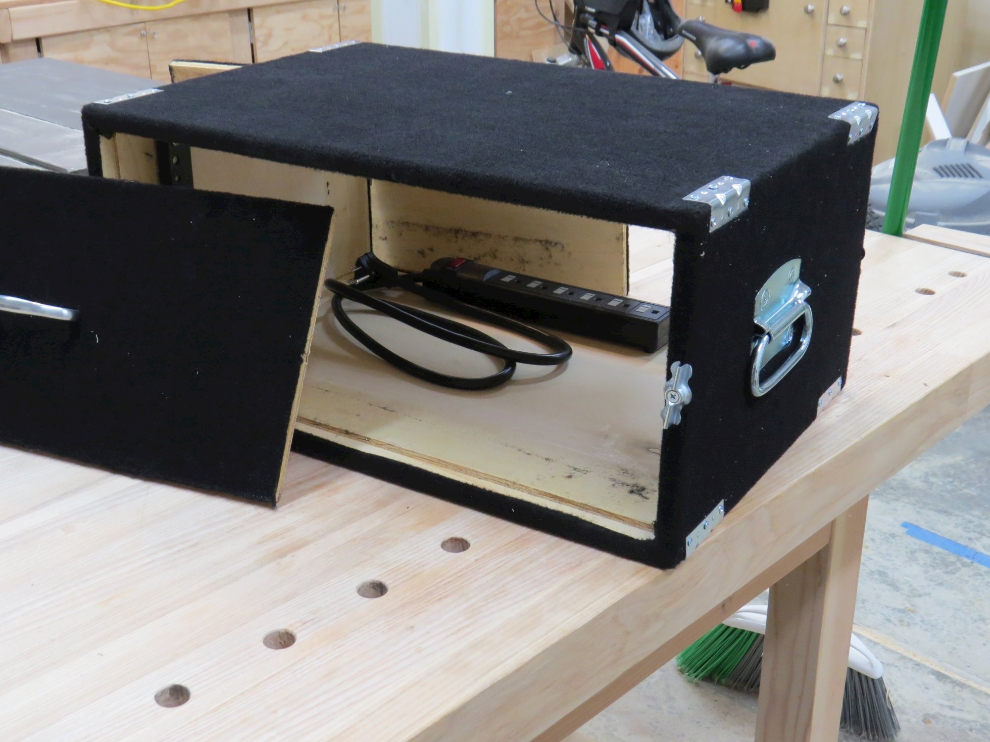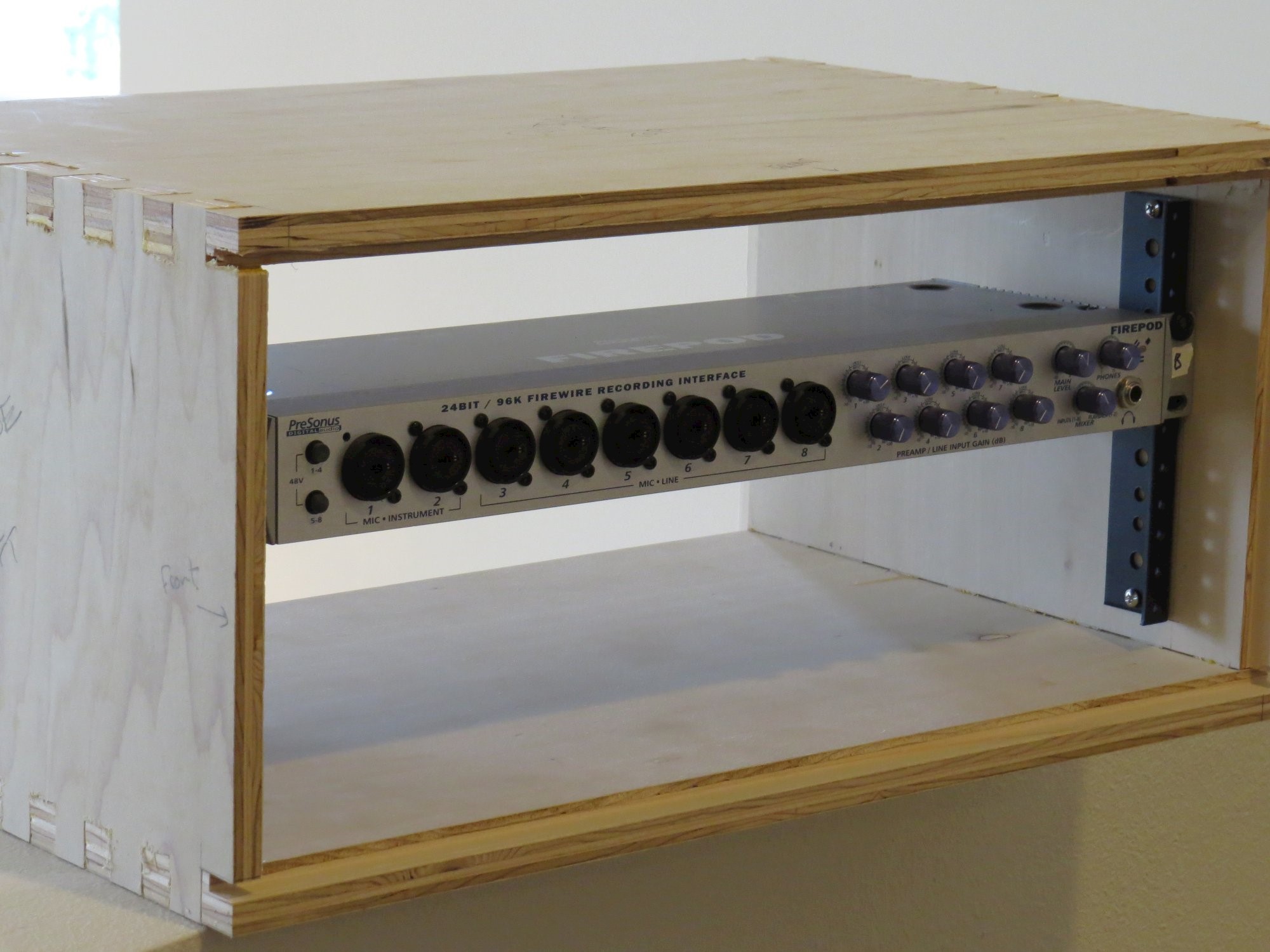Portable 4U rack for audio equipment. Plywood, 4U rails, cabinet hardware, and automotive carpeting.