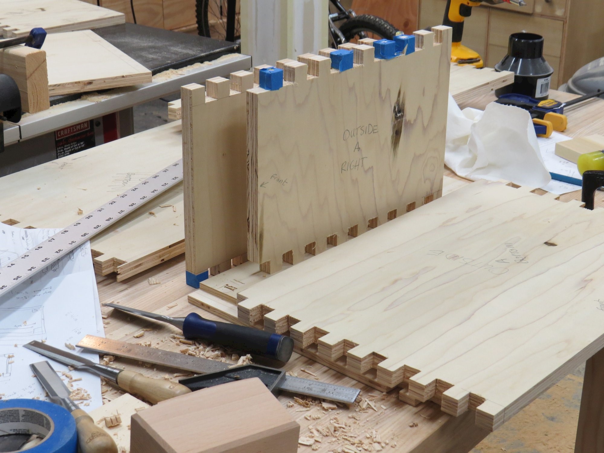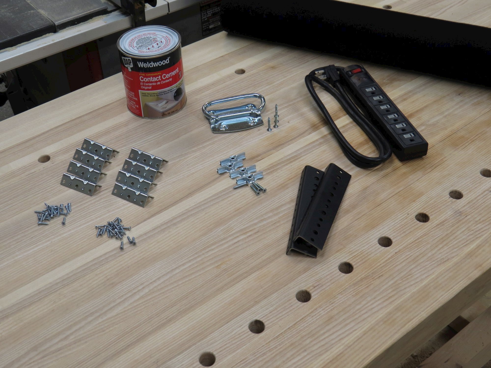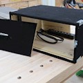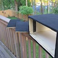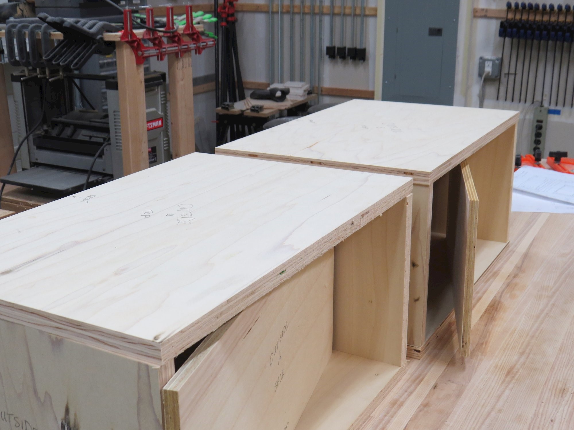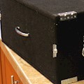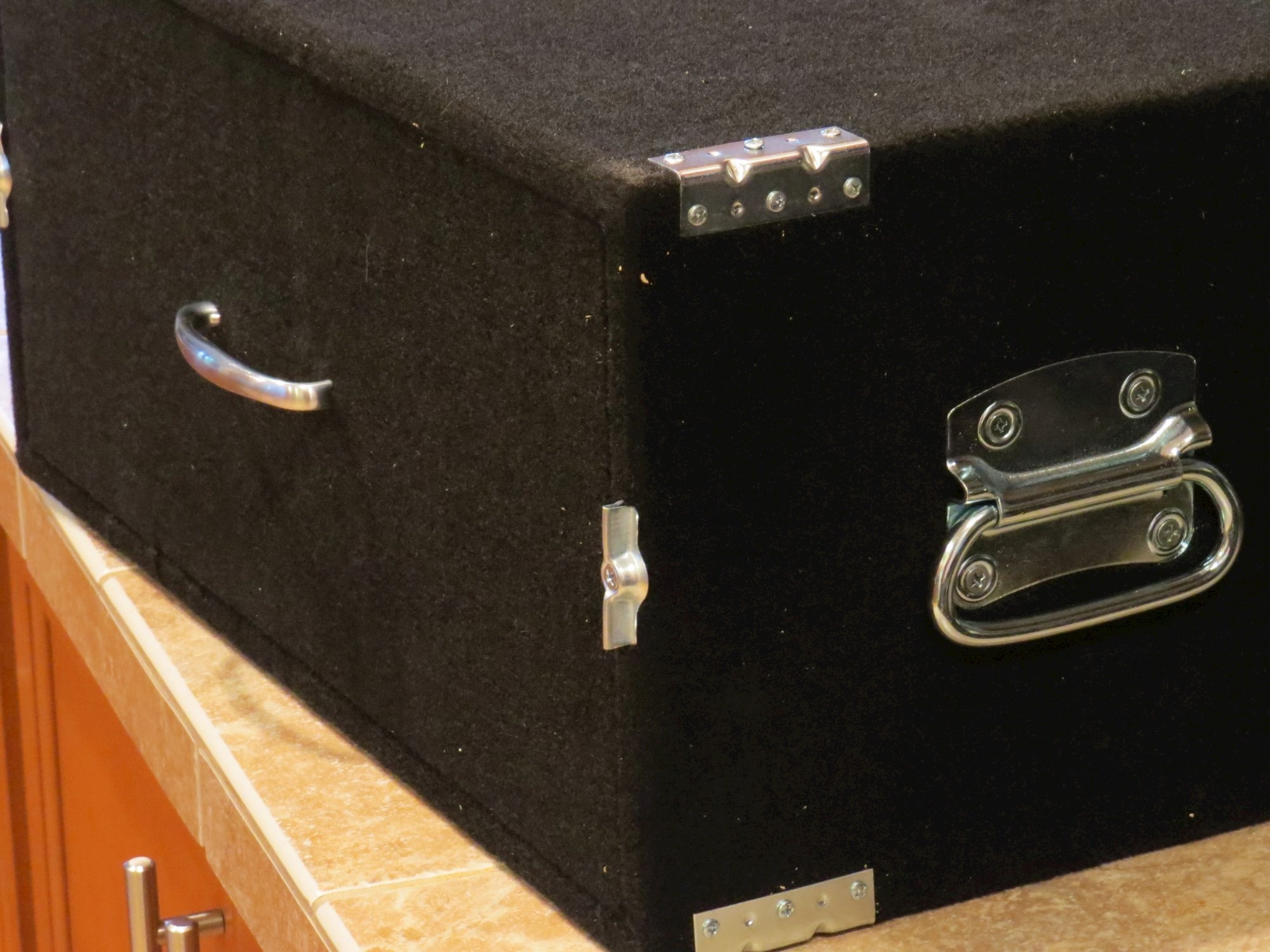 Portable 4U rack for audio equipment. Plywood, 4U rails, cabinet hardware, and automotive carpeting.