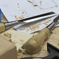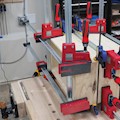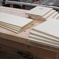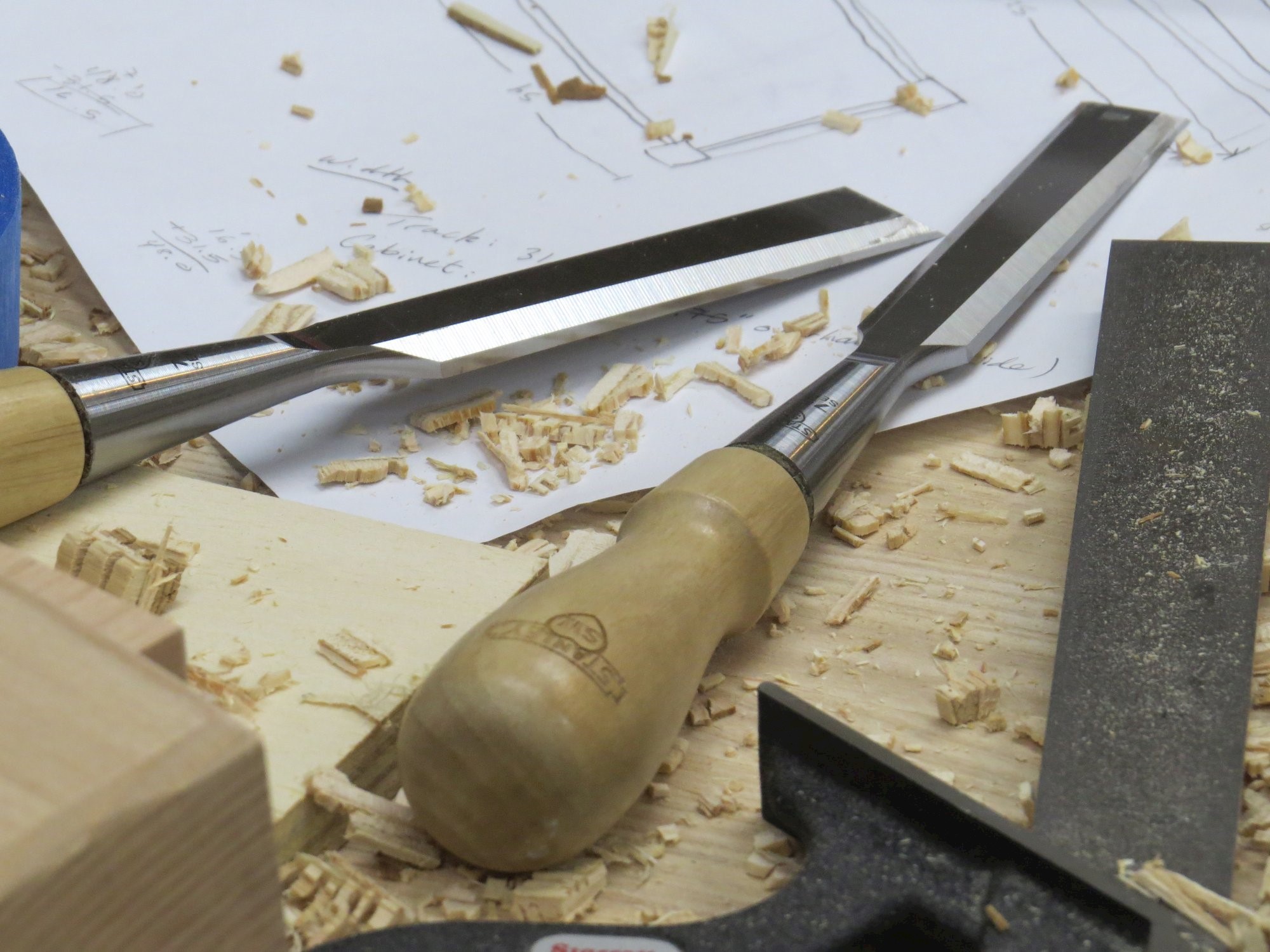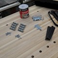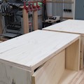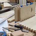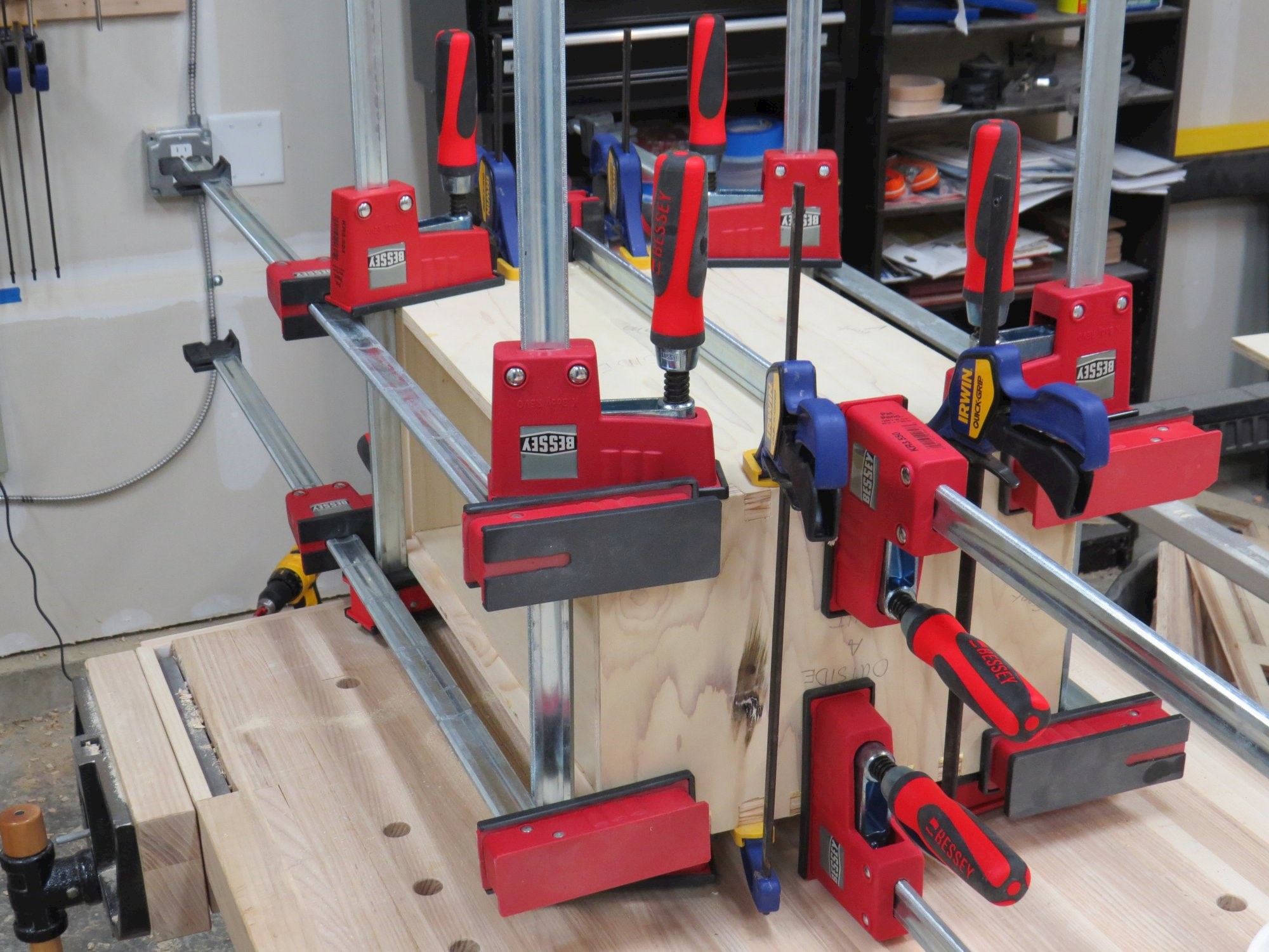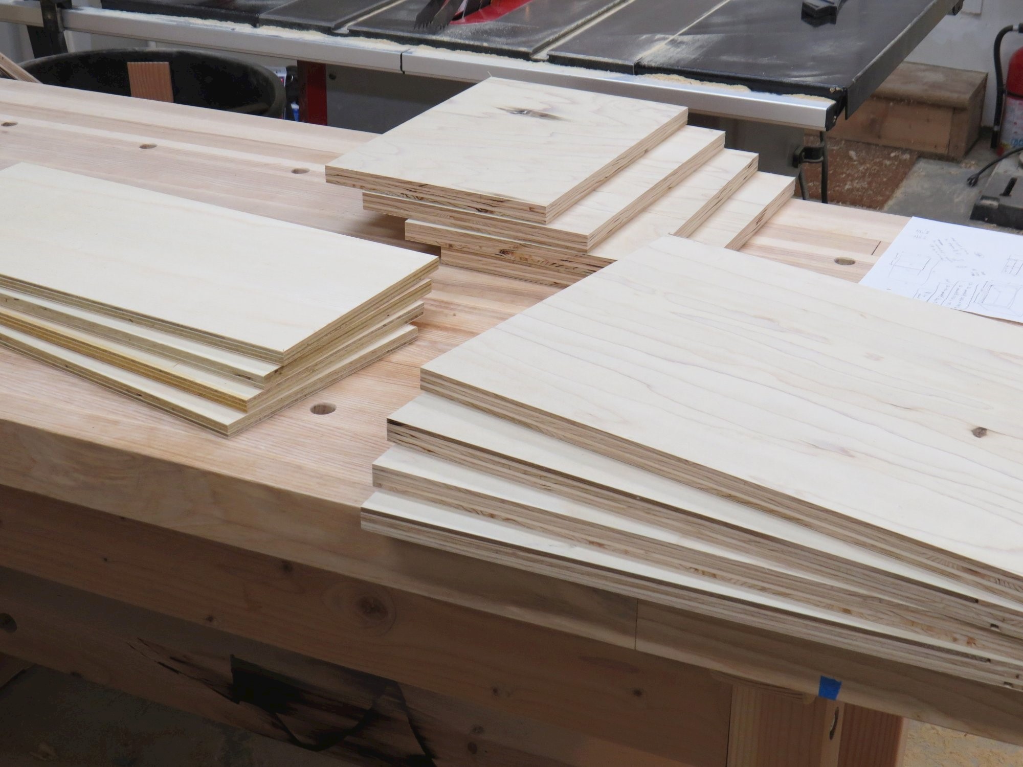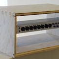 Portable 4U rack for audio equipment. Plywood, 4U rails, cabinet hardware, and automotive carpeting.