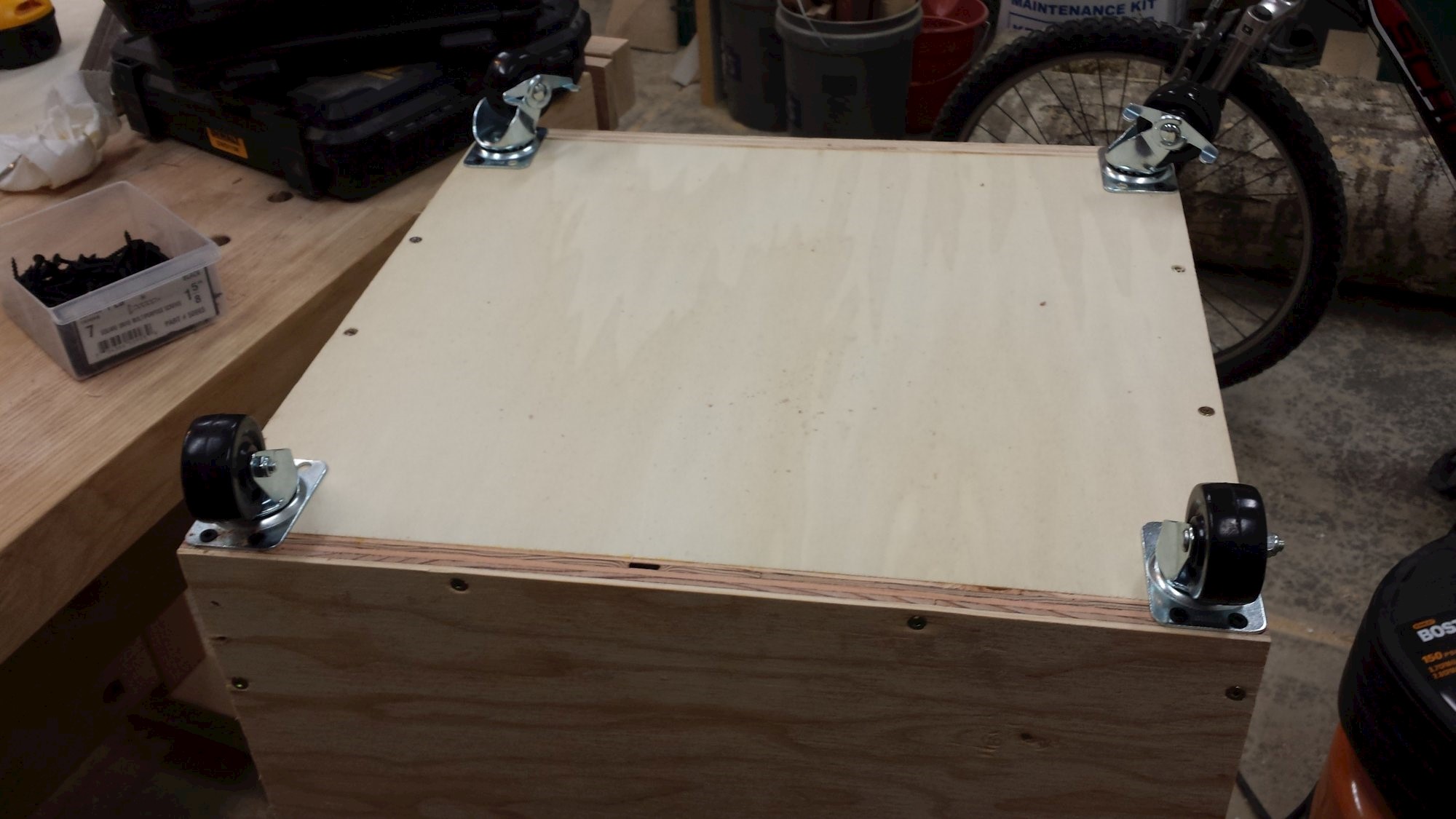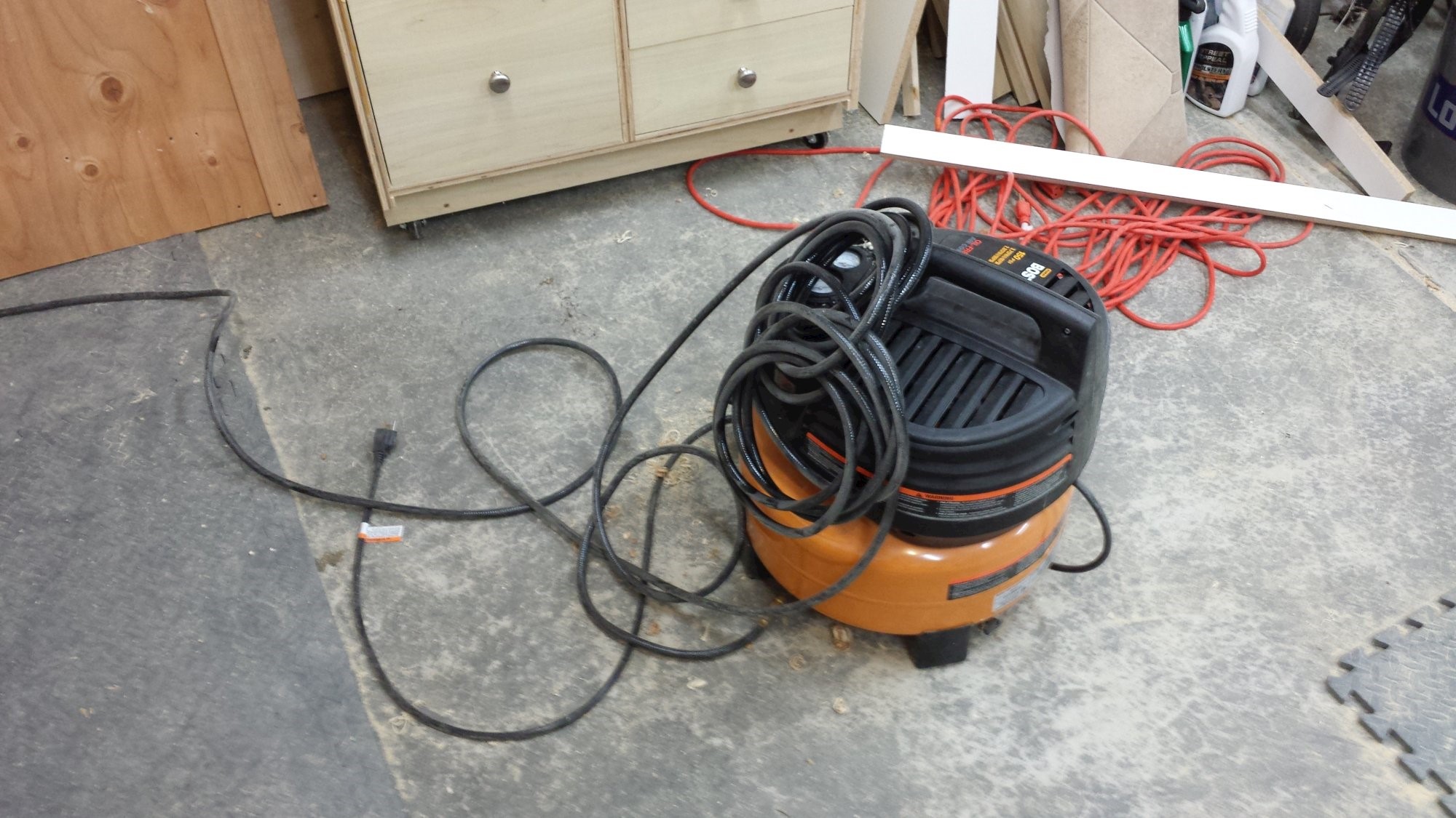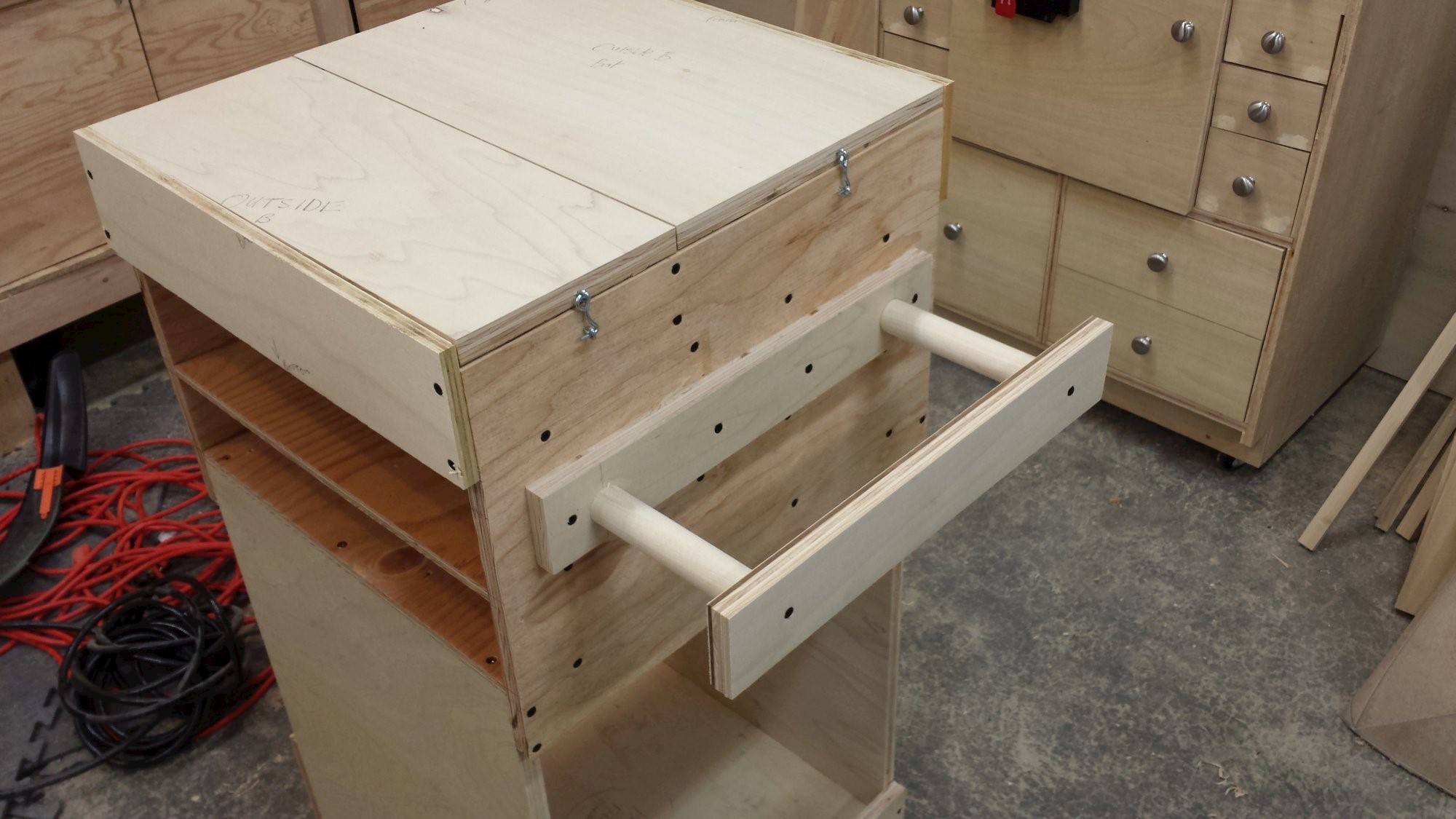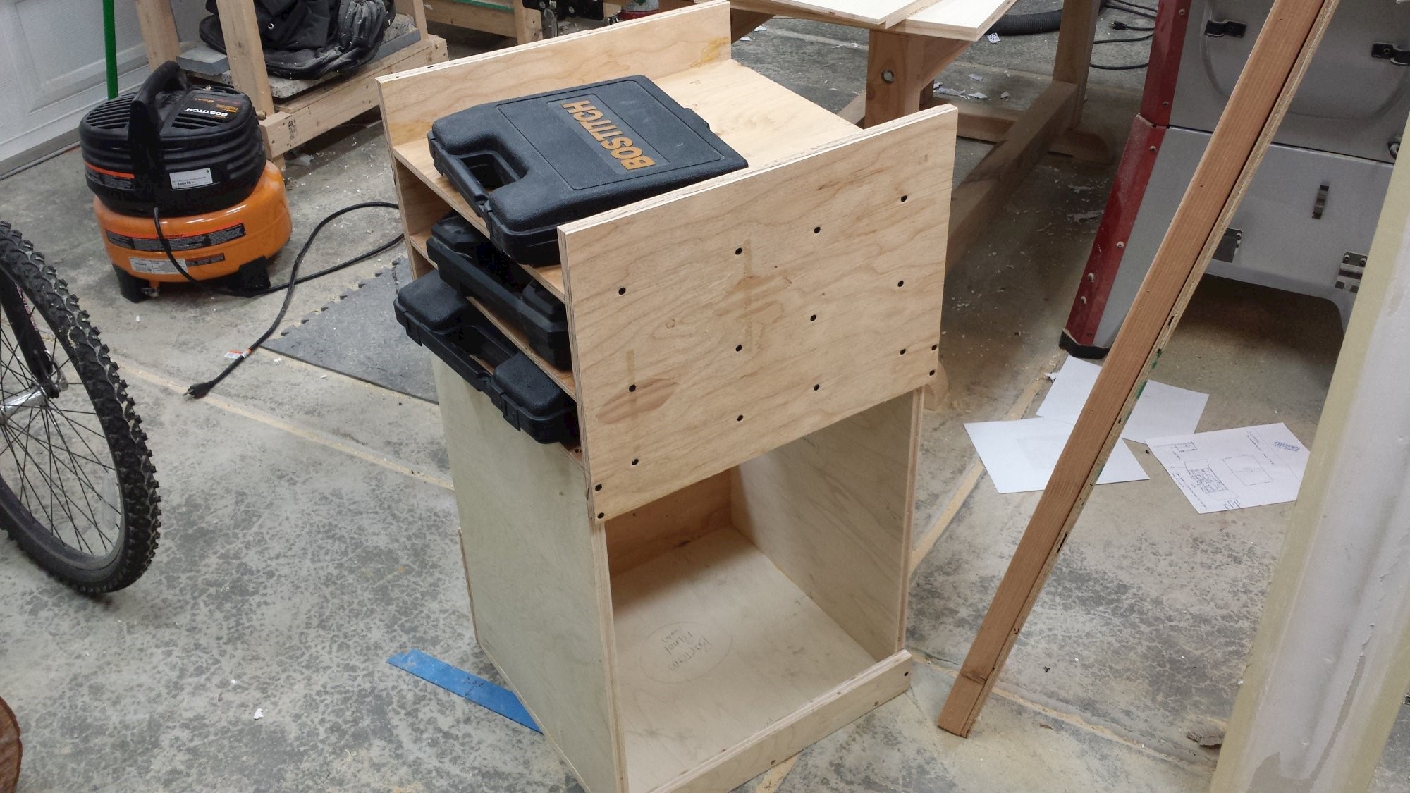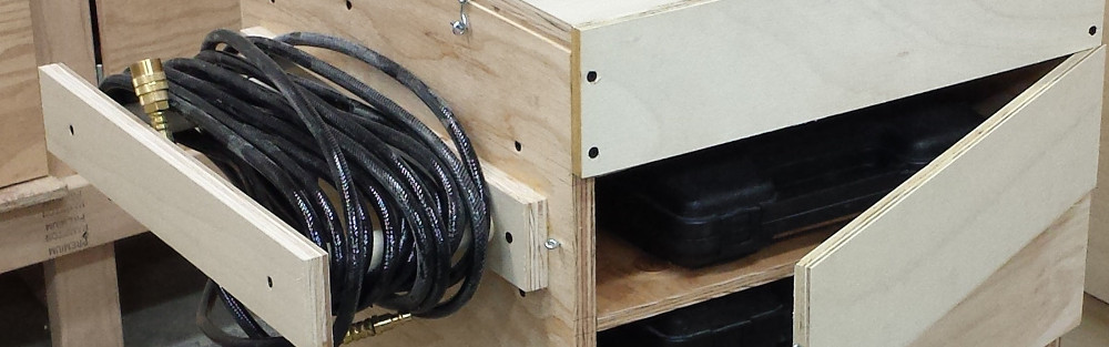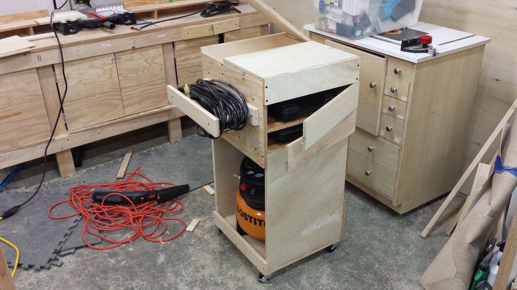 Cart to keep the compressor and its accessories all in once place. Plywood, dowels, and cabinet hardware.
