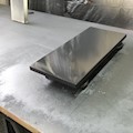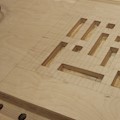 Low entertainment center with component and media storage. Custom design cut into the top. Maple plywood, dimensional Poplar, ball-bearing drawer slides, fall flap hinges, and cabinet hardware.