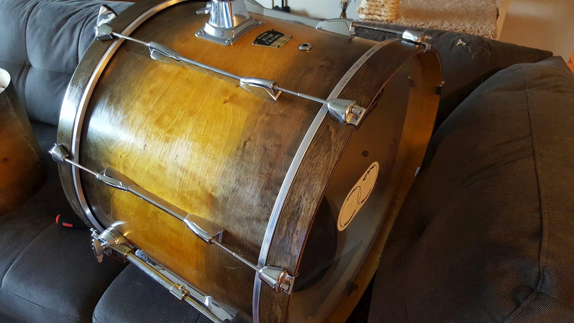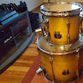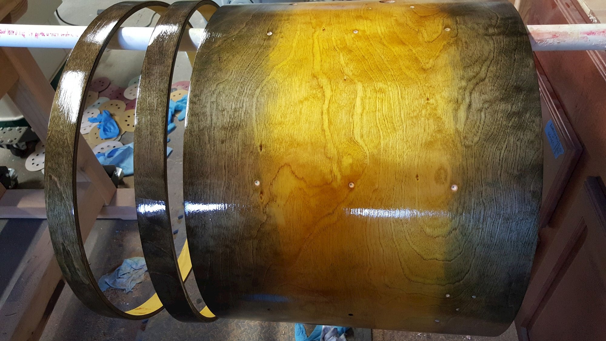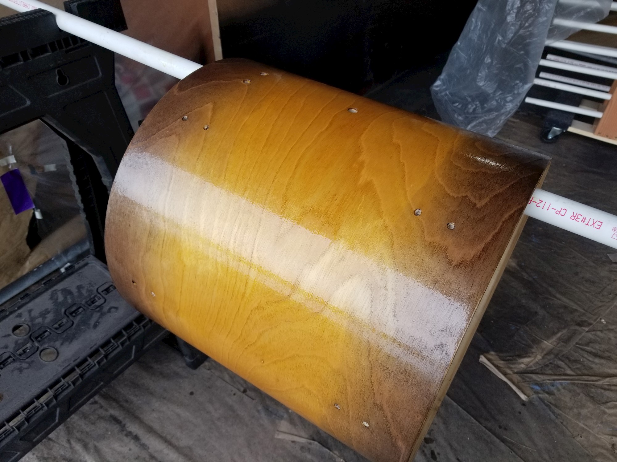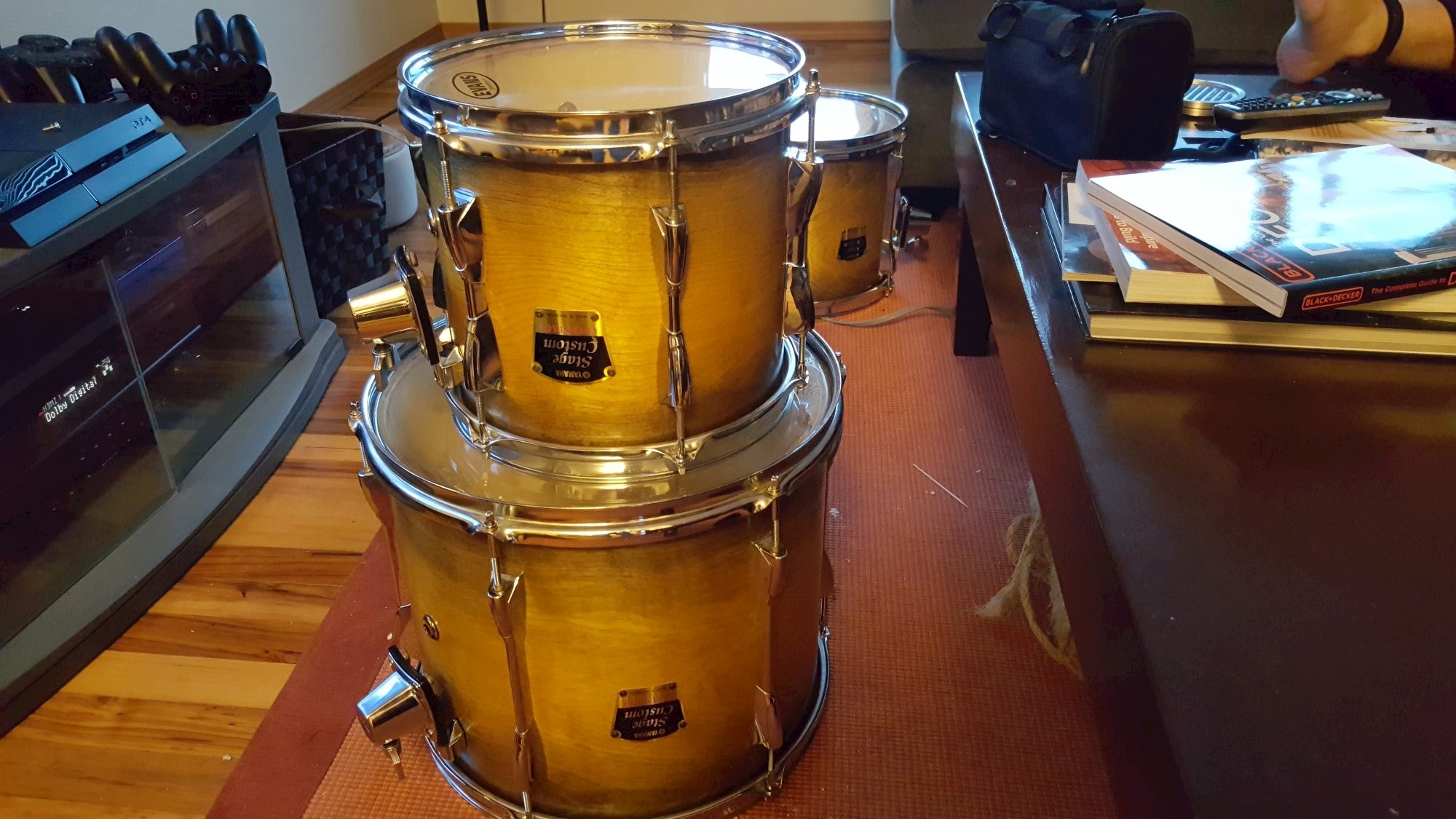 15-year-old Yamaha Stage Custom Advantage stripped, dyed with an amber and black burst, and finished with lacquer.