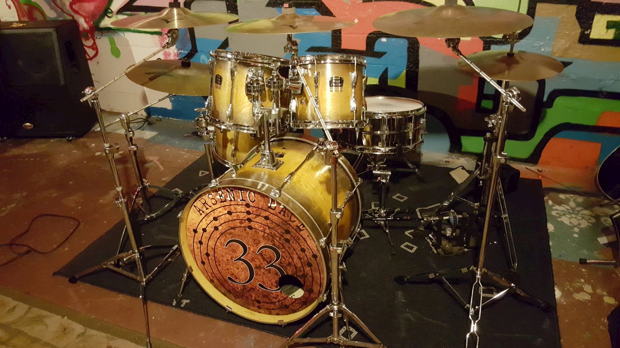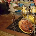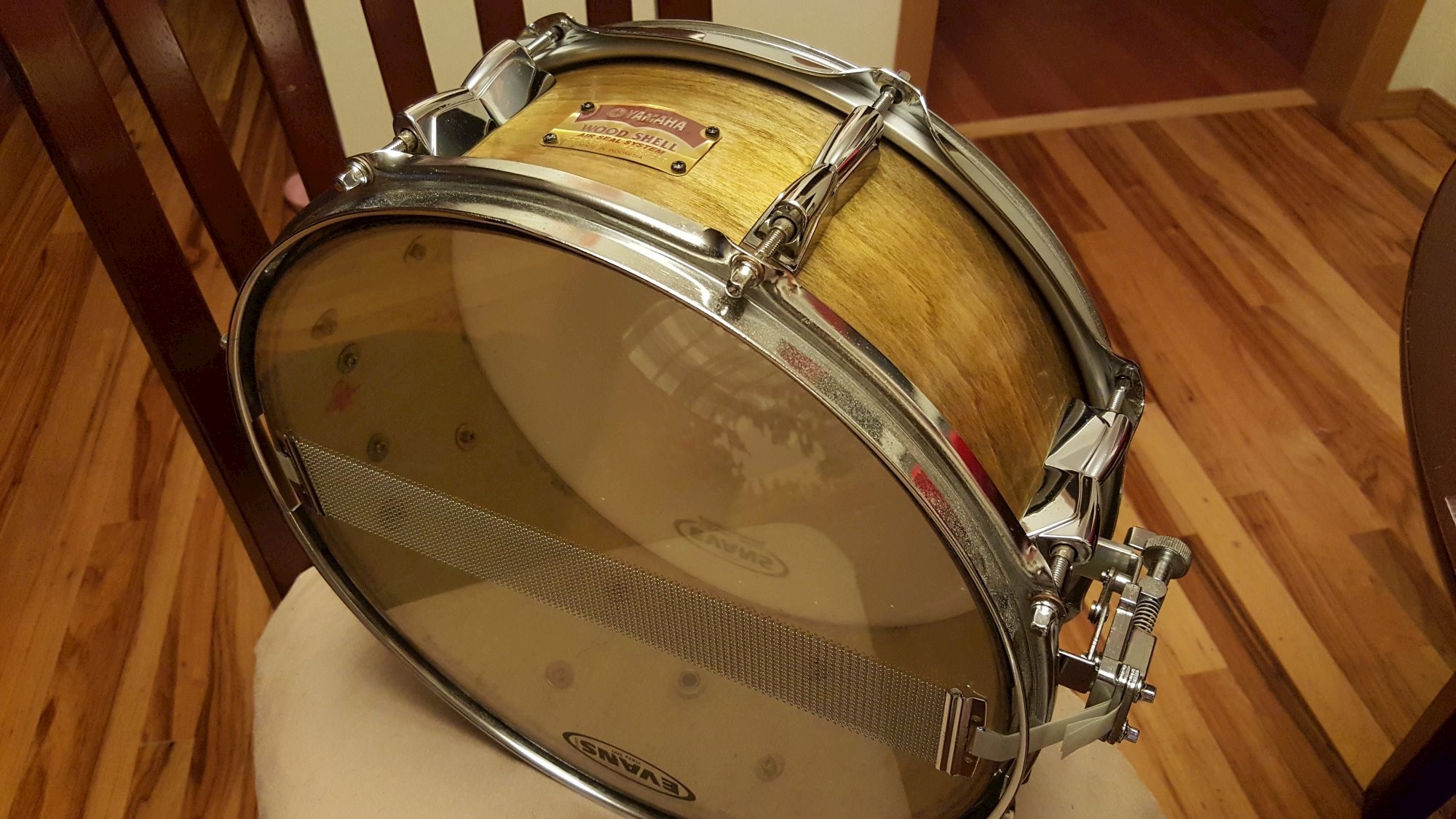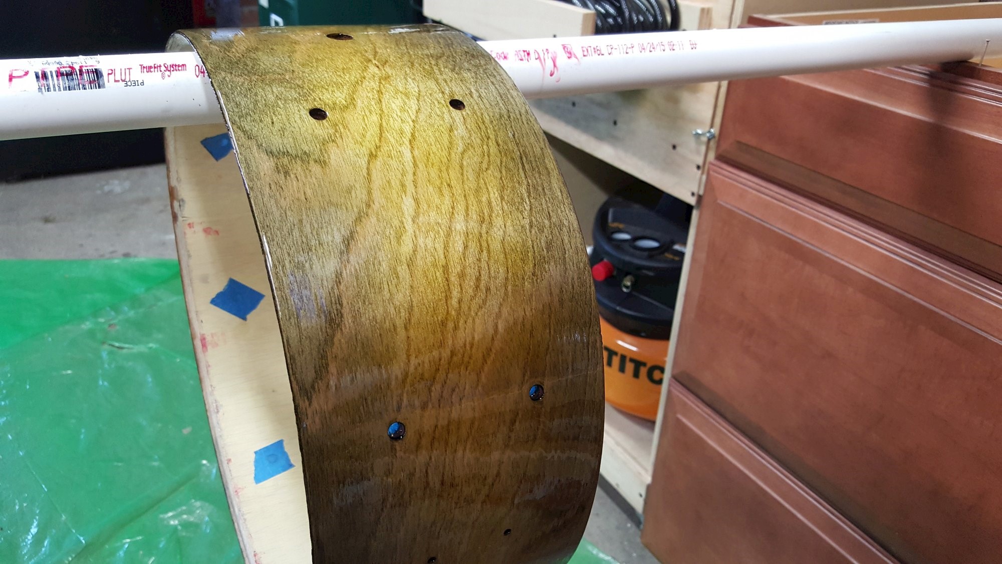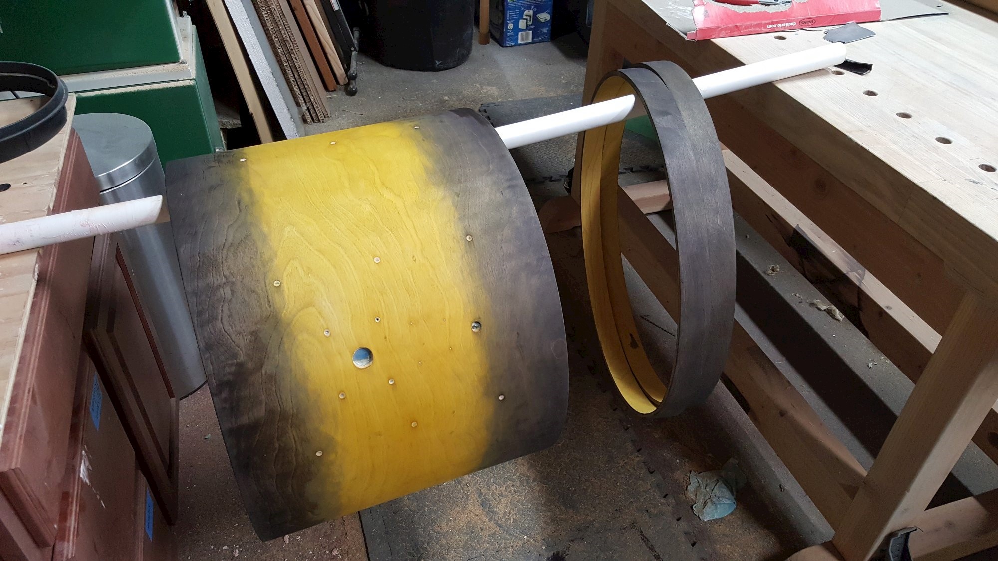 15-year-old Yamaha Stage Custom Advantage stripped, dyed with an amber and black burst, and finished with lacquer.