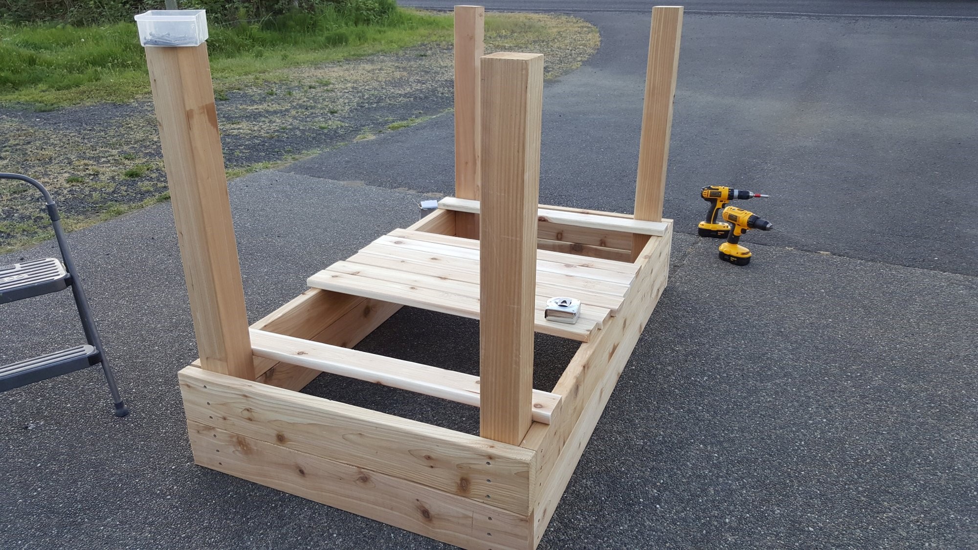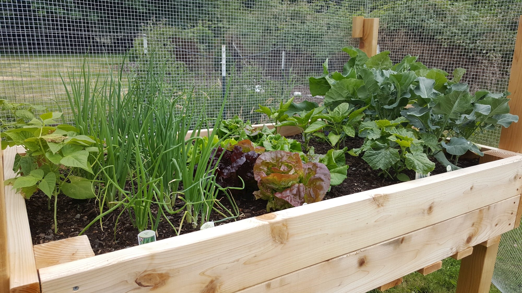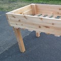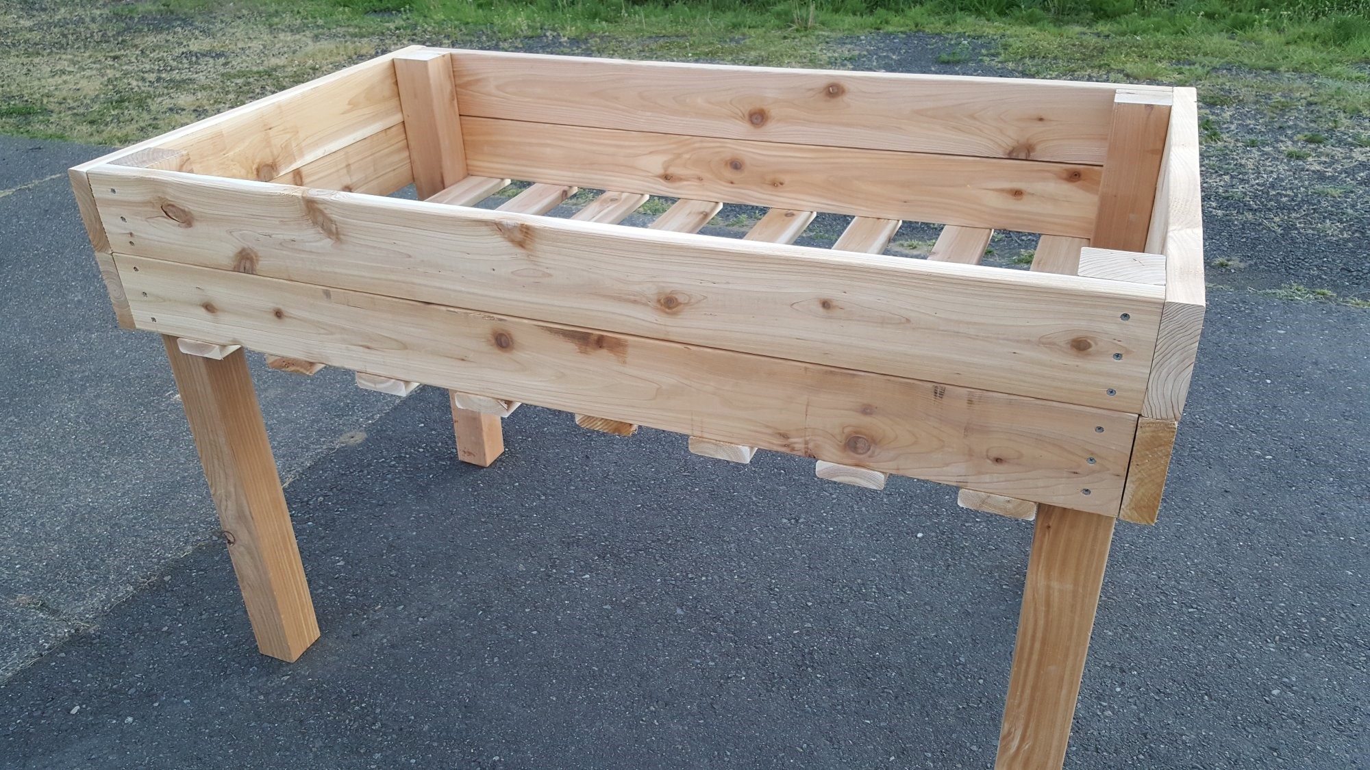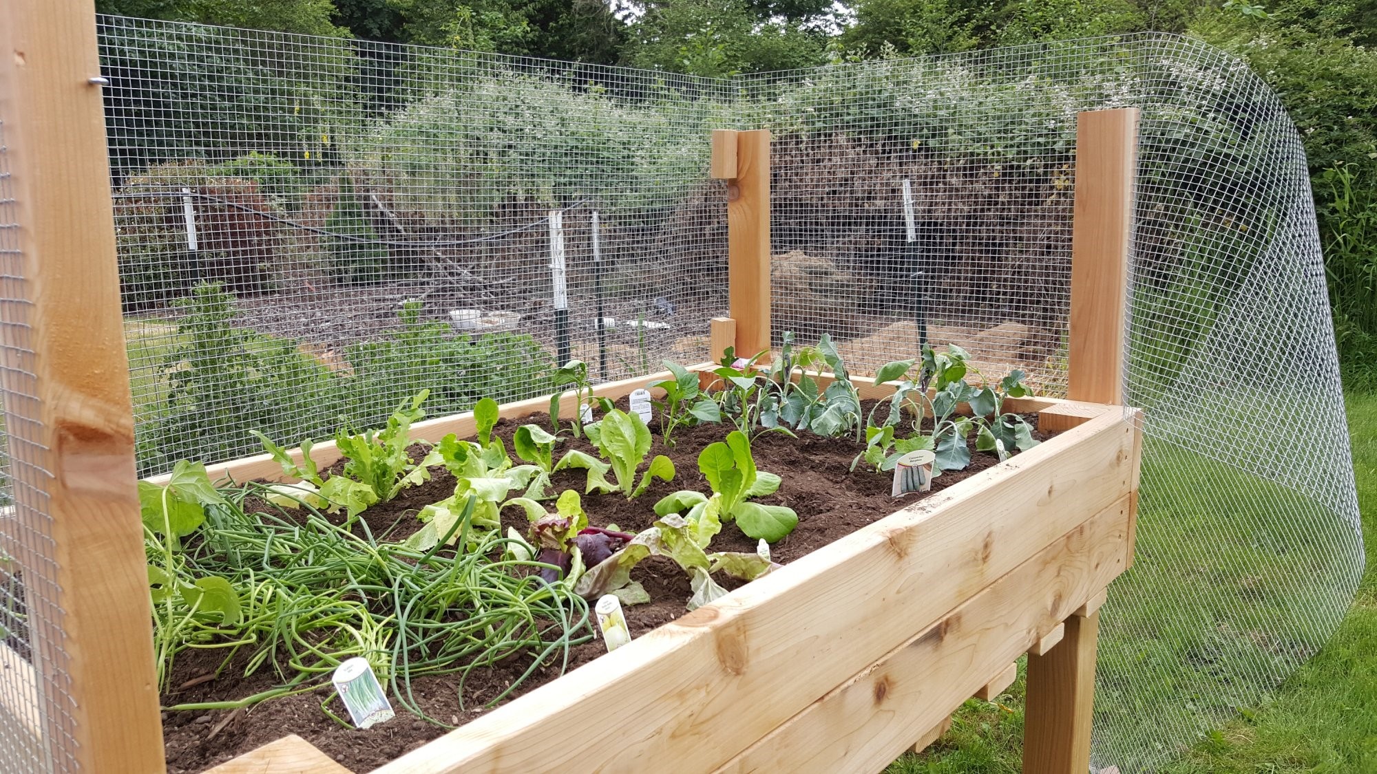 Counter-height garden beds with deer fencing. Dimensional cedar, deck boards, galvanized steel mesh, and gate hardware.