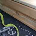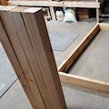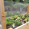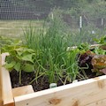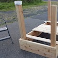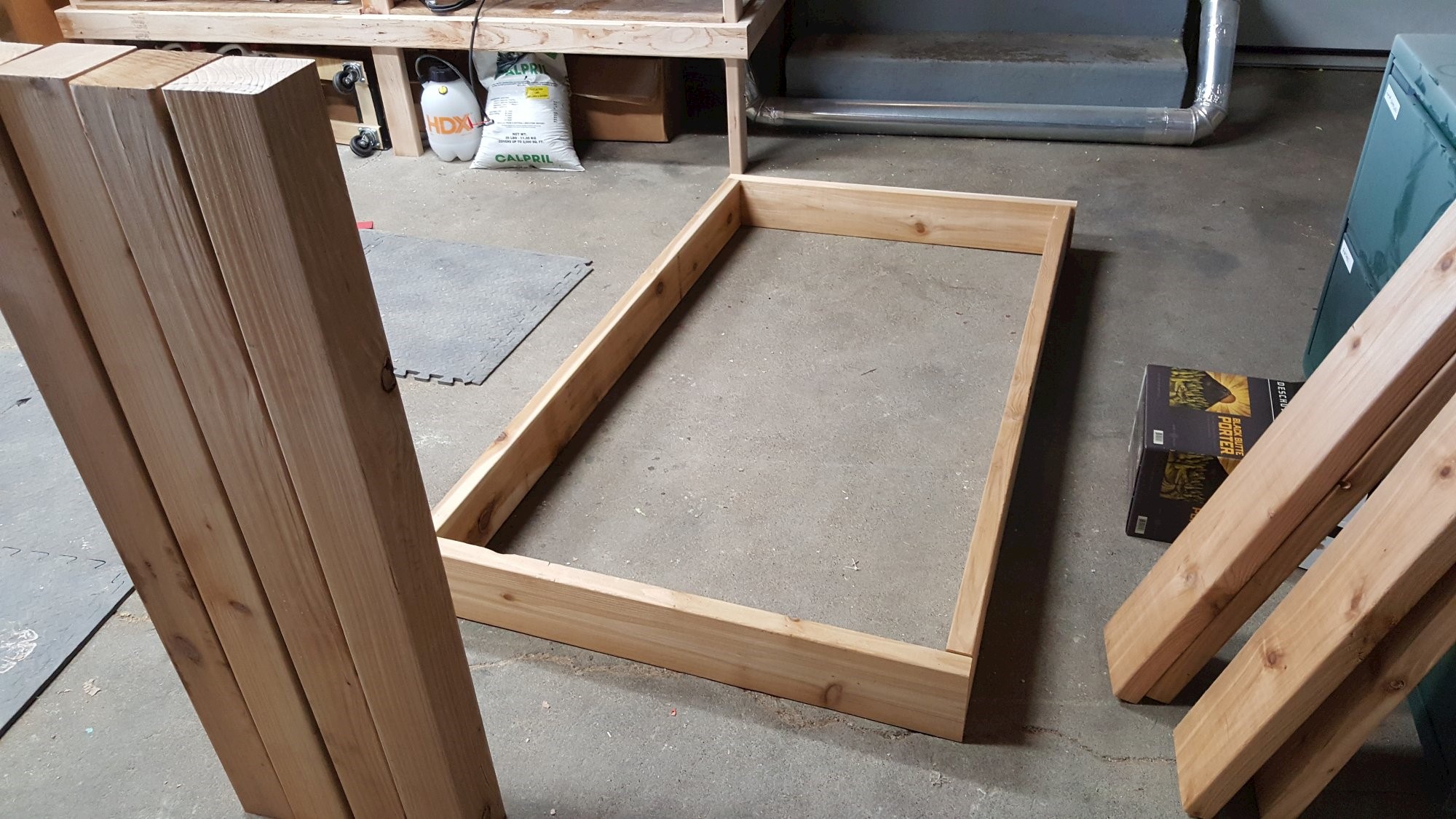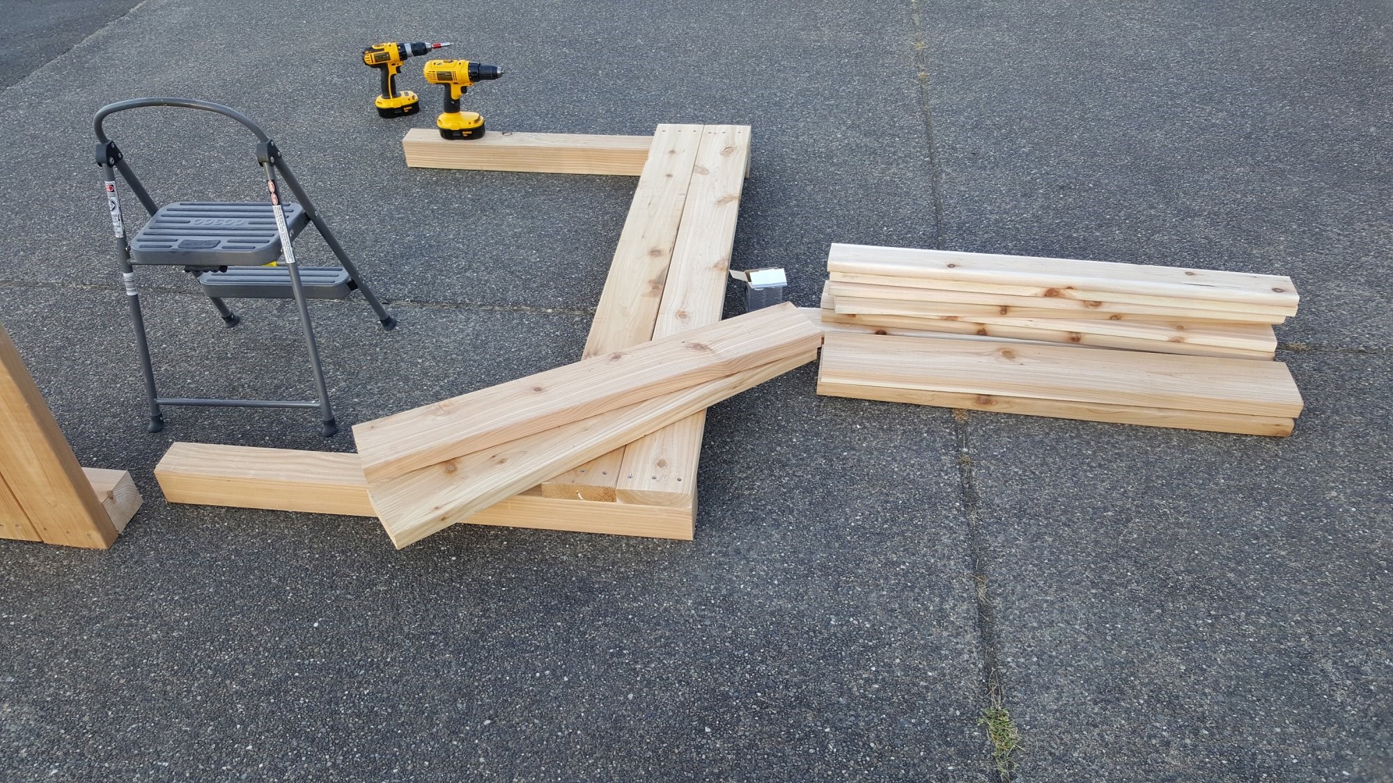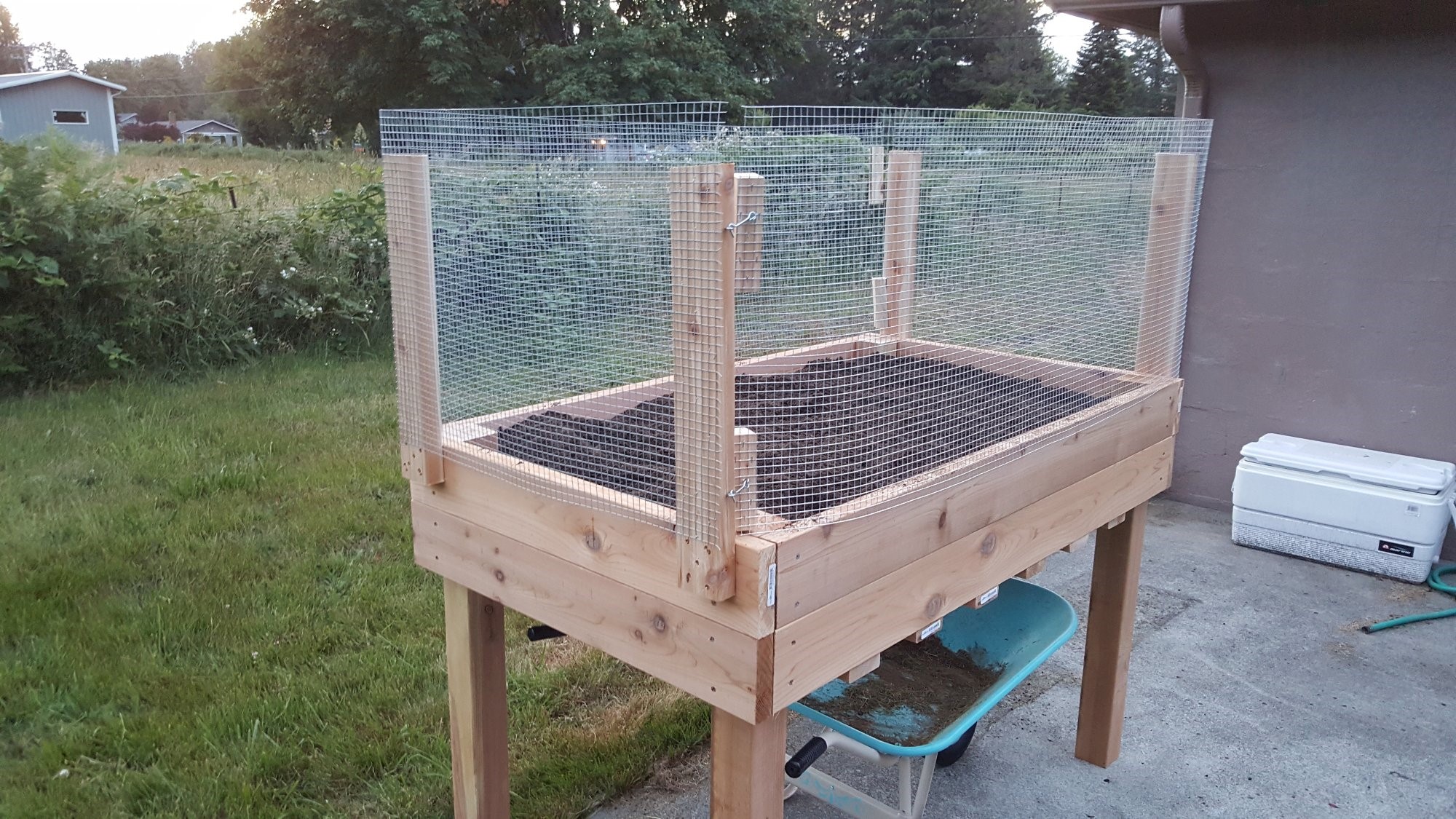 Counter-height garden beds with deer fencing. Dimensional cedar, deck boards, galvanized steel mesh, and gate hardware.