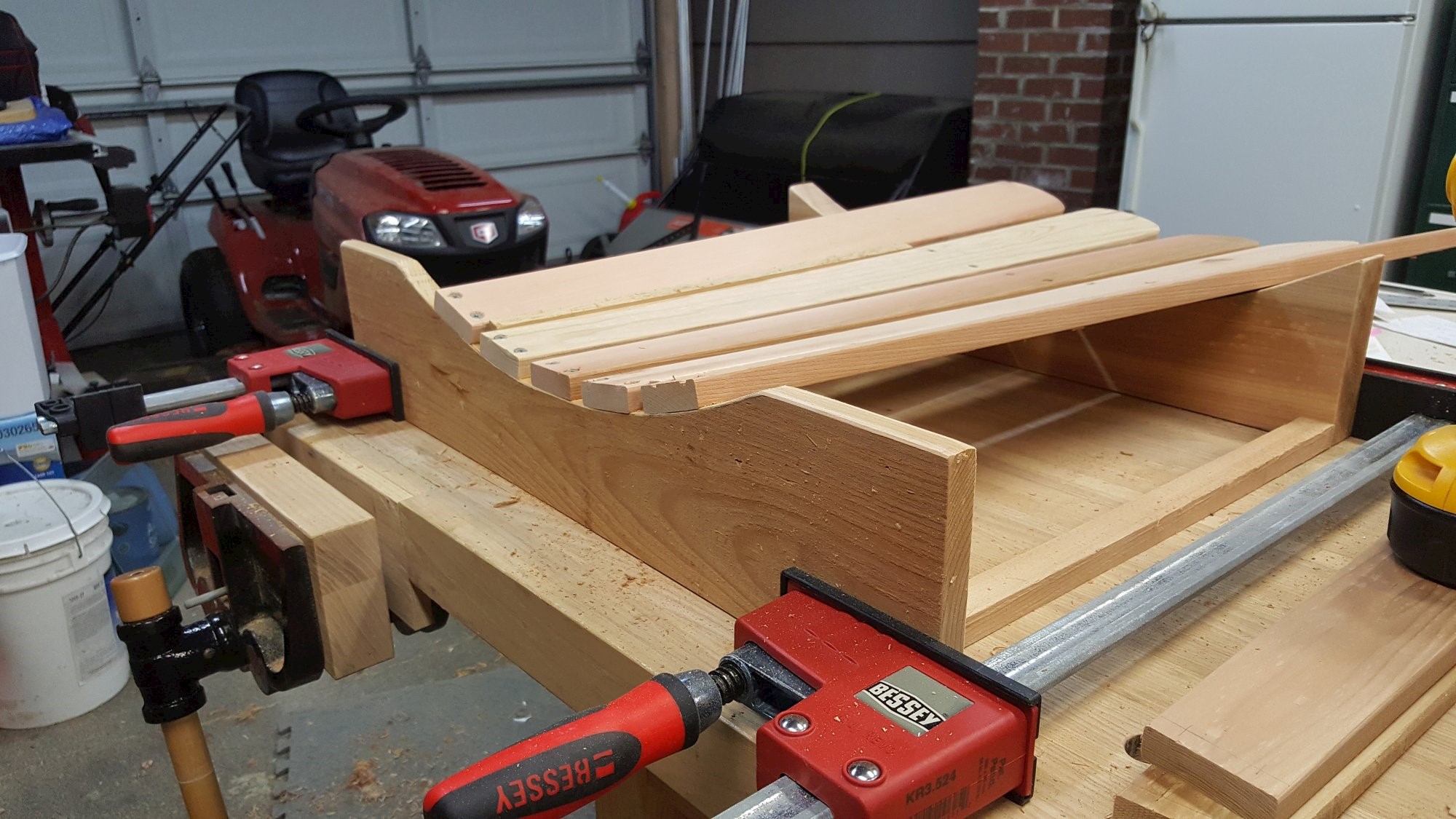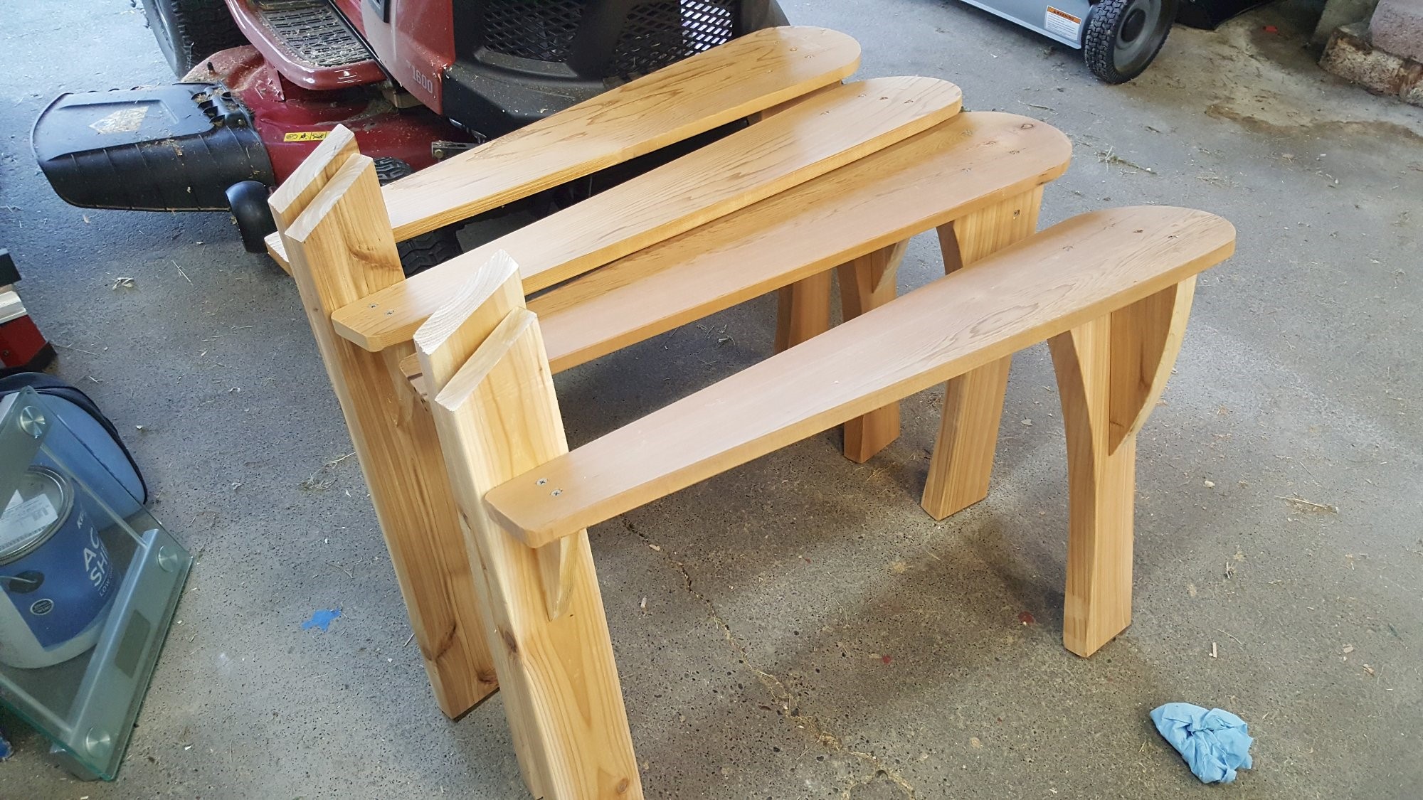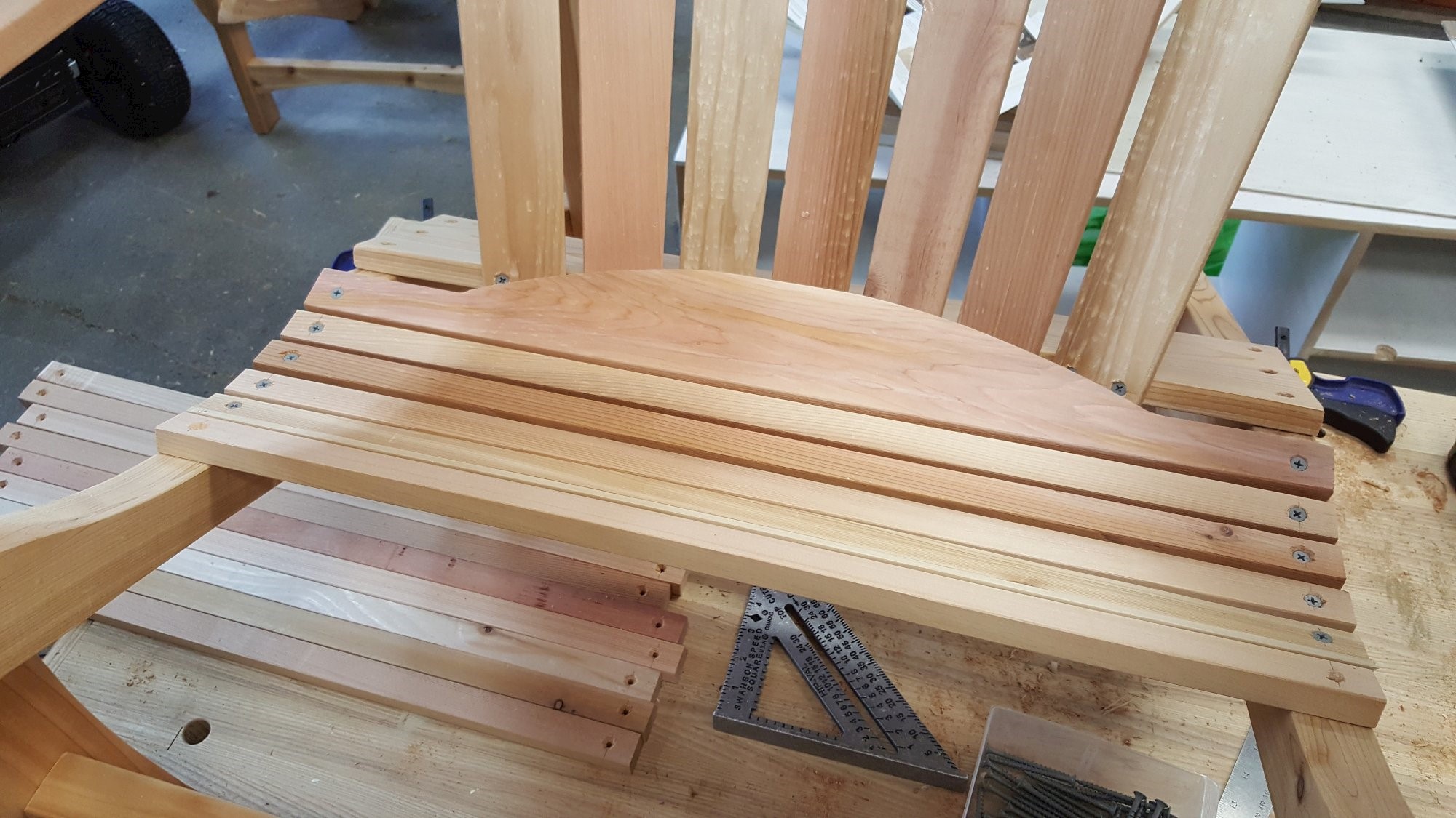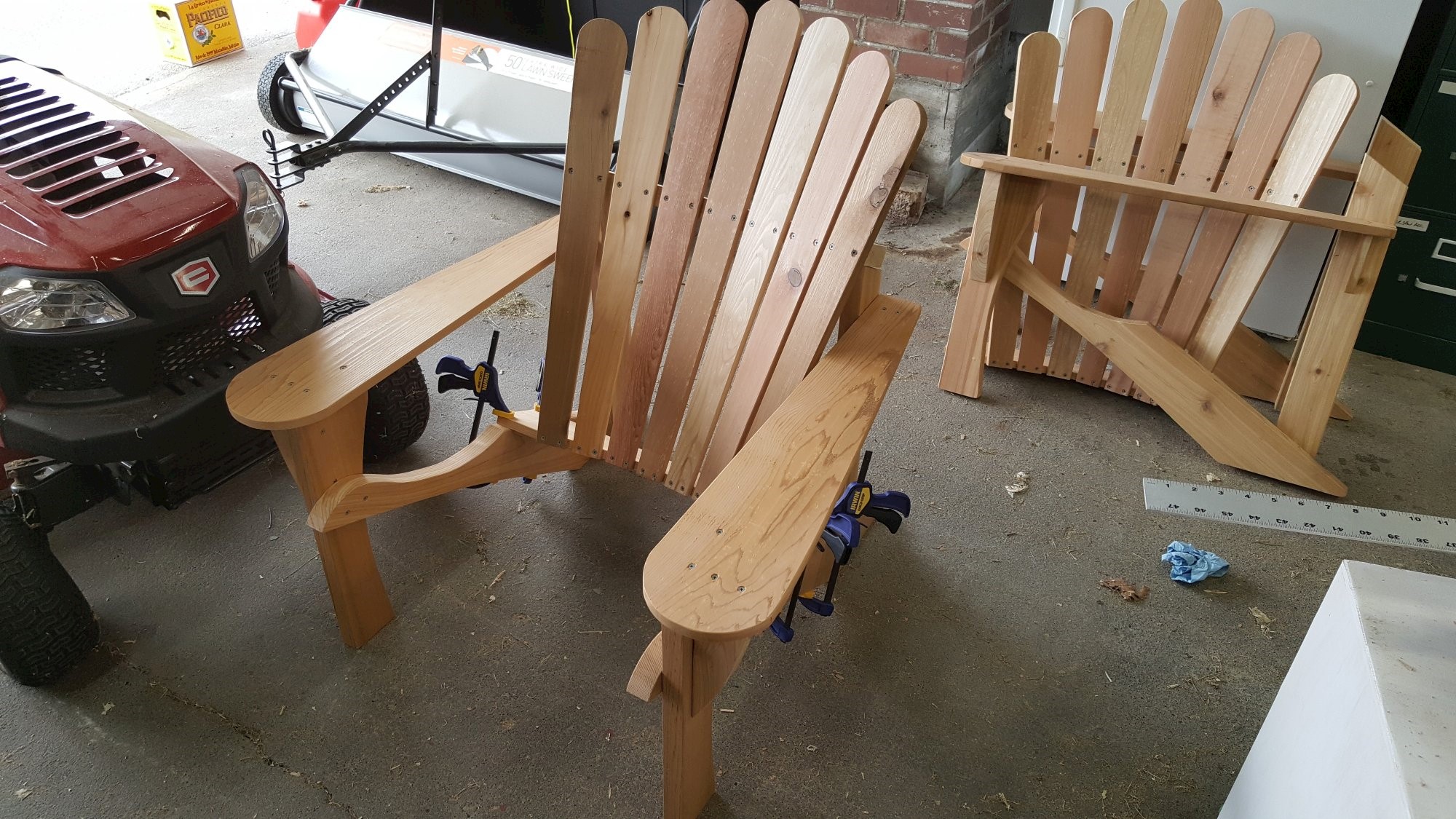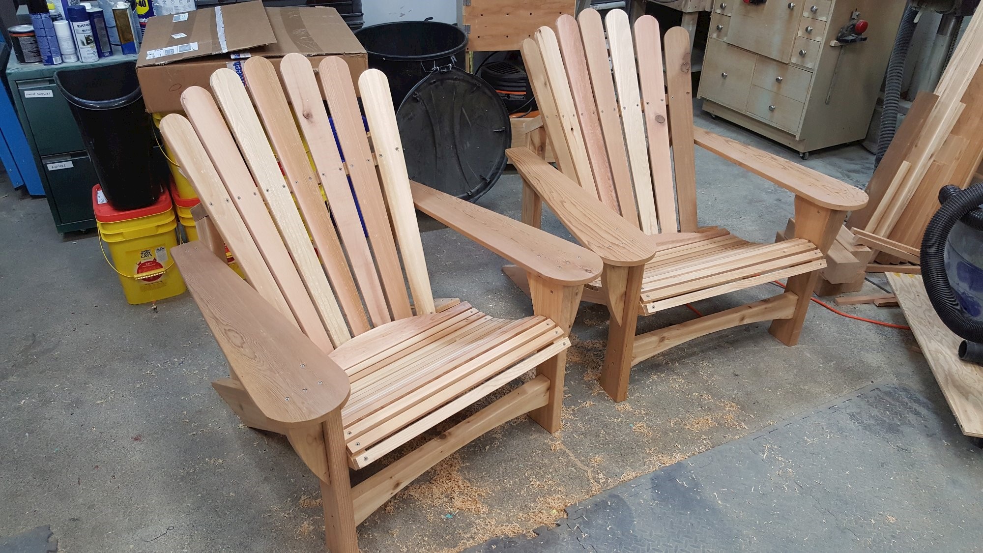 New Adirondack chairs with improved weather resistance and more consistent build quality. Dimensional cedar lumber and weatherproof deck screws.