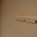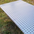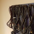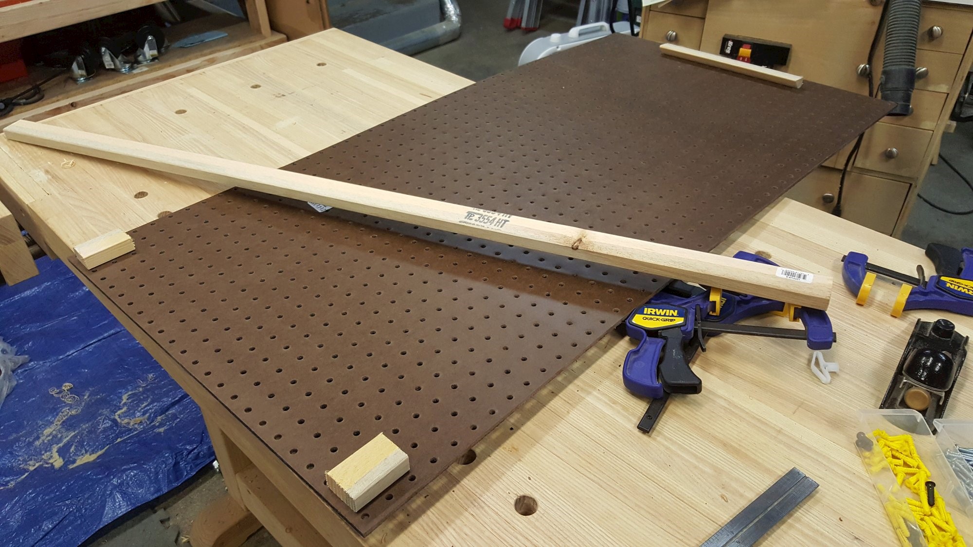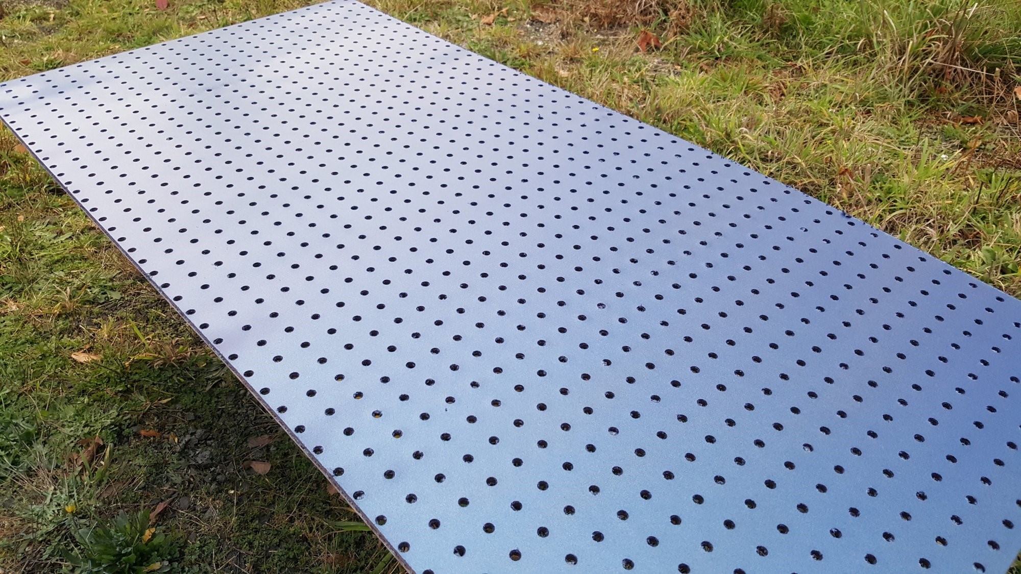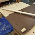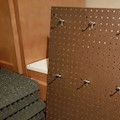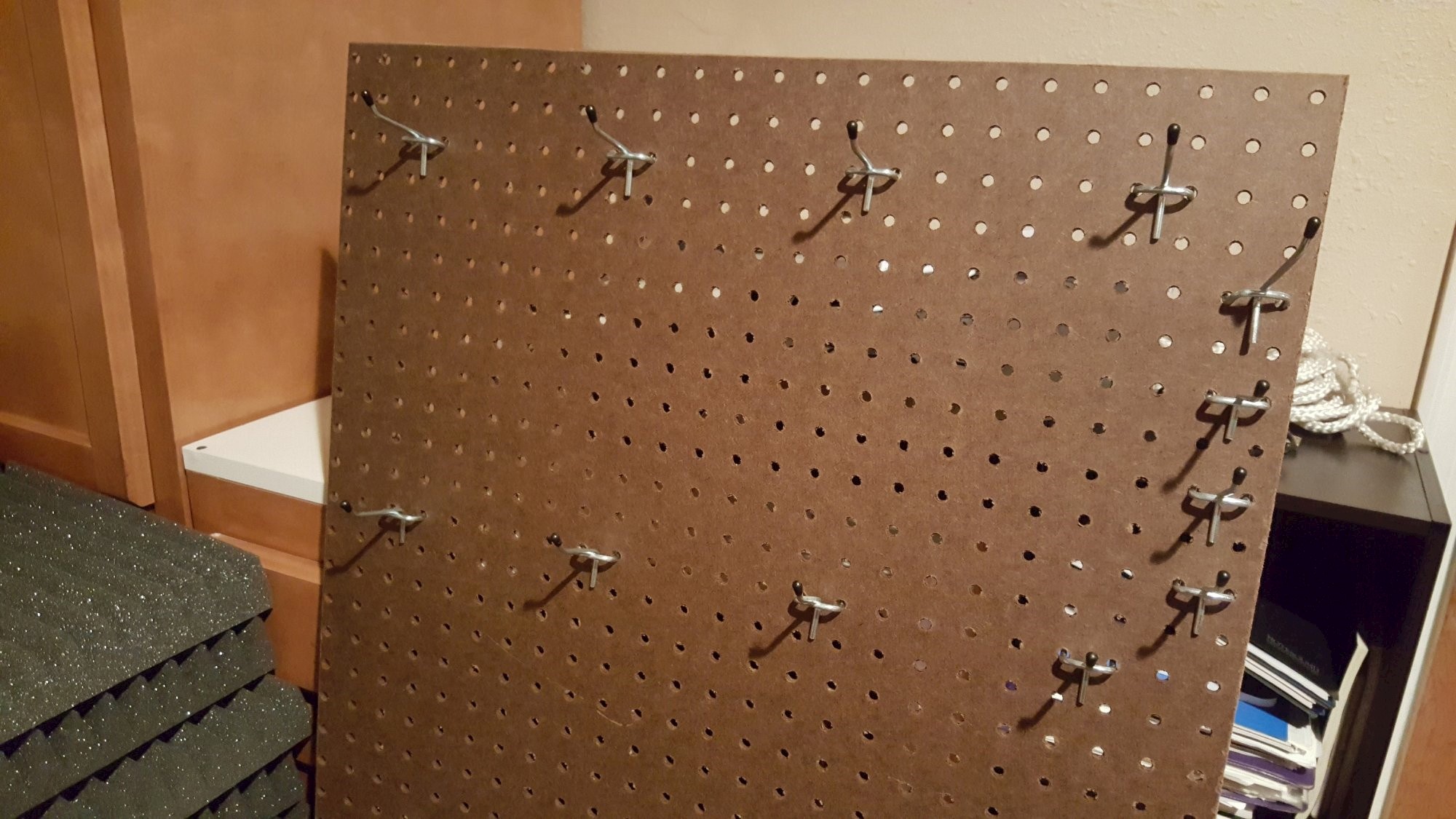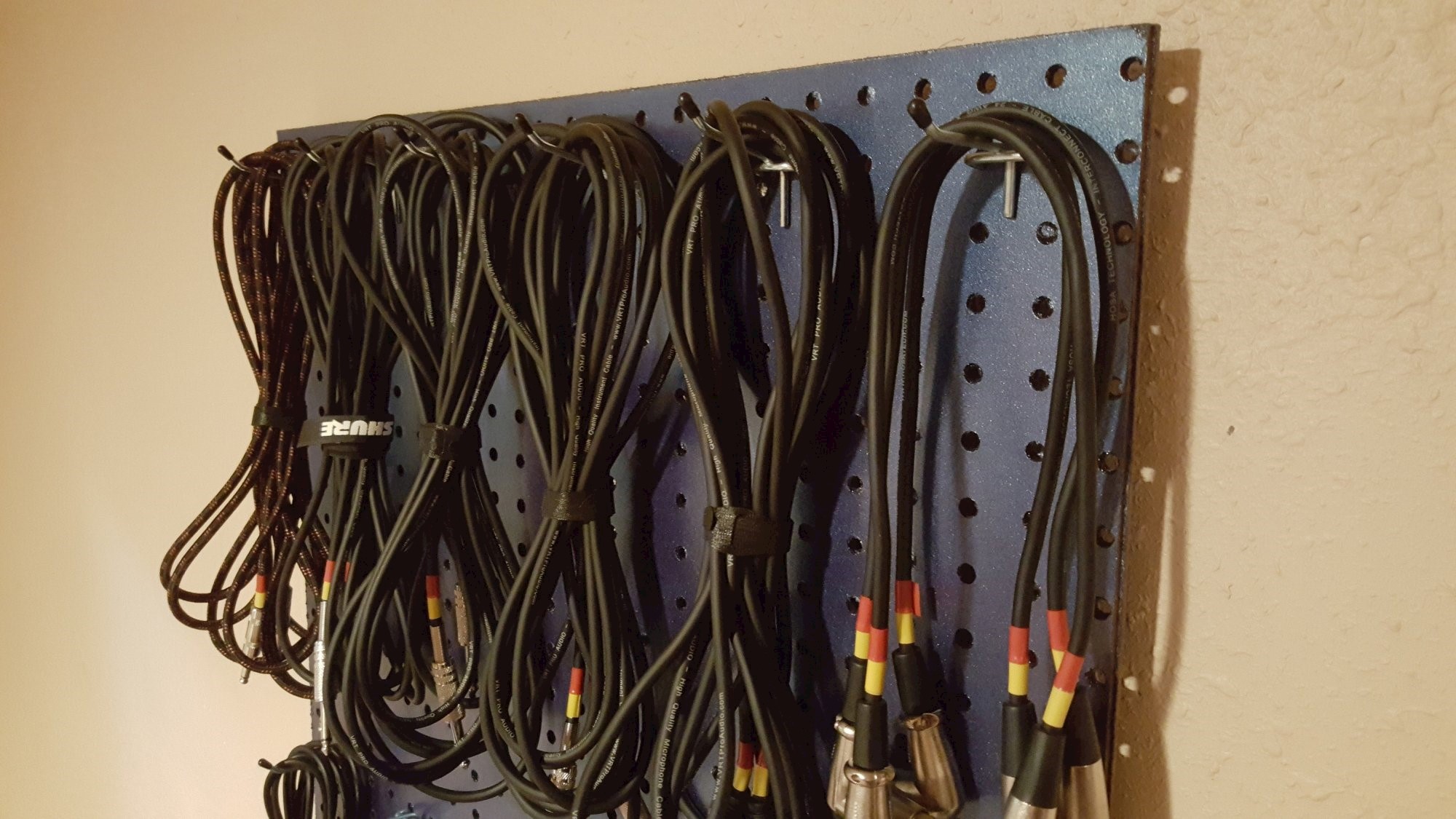 Wall-mounted unit for managing microphone cables in the studio. 1/4" pegboard, garage tool hooks, and blue metallic paint.