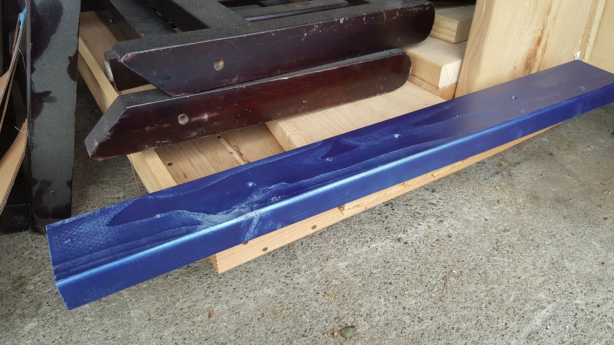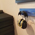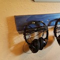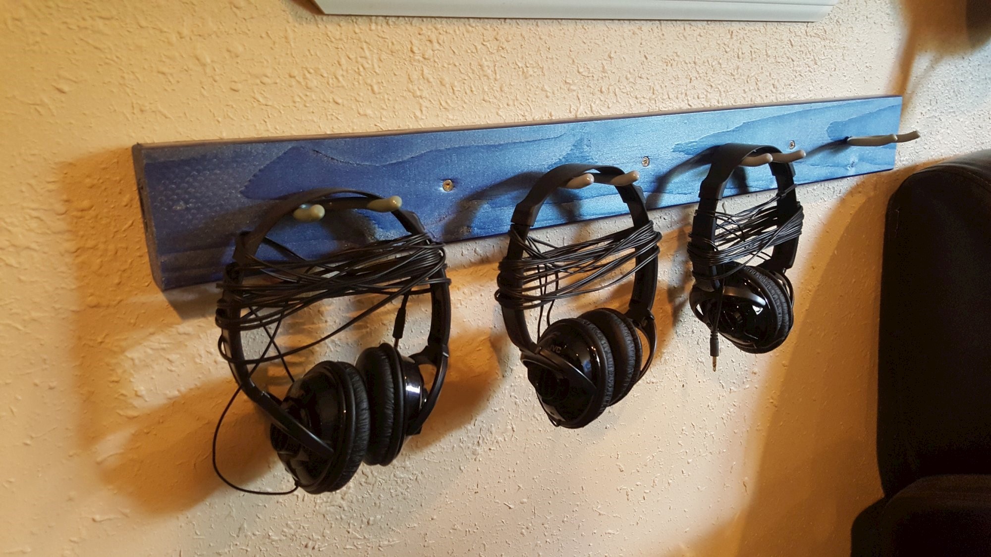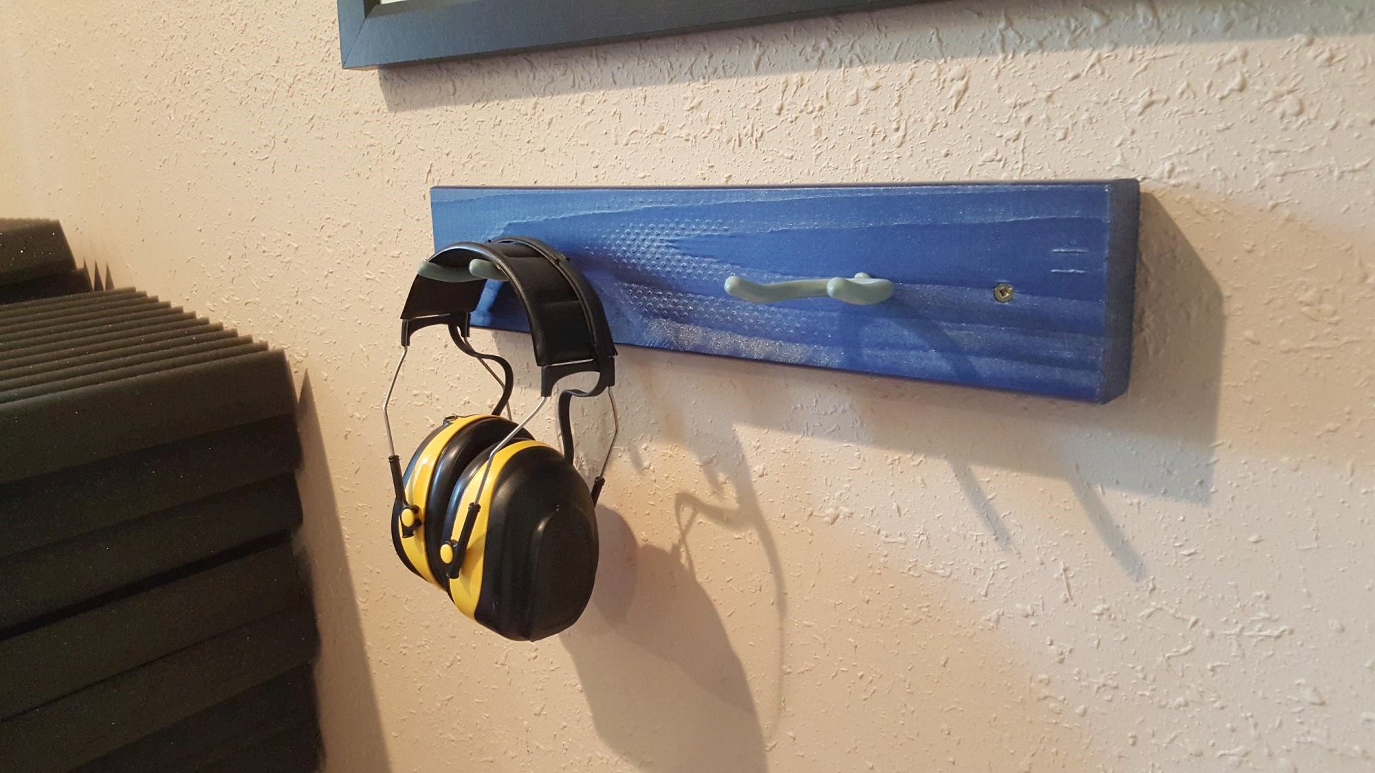 Quick-and-dirty wall mounting brackets for headphones throughout the studio. 2×4 Douglas Fir studs, garage tool hooks, and blue metallic paint.