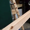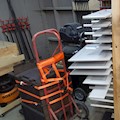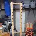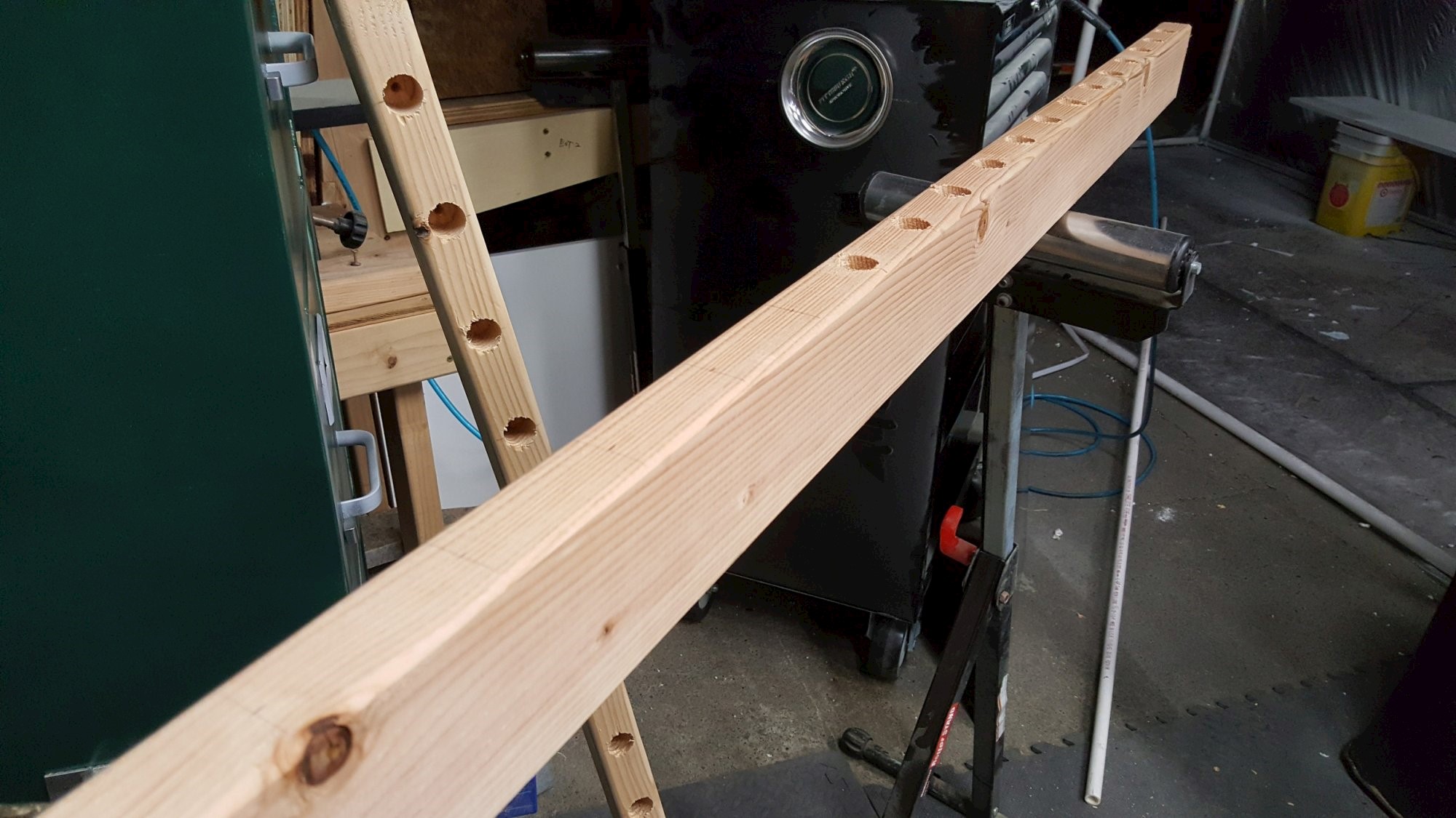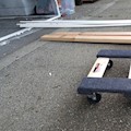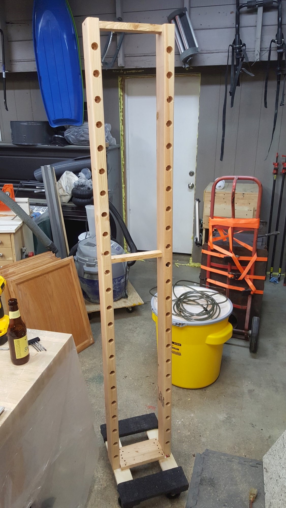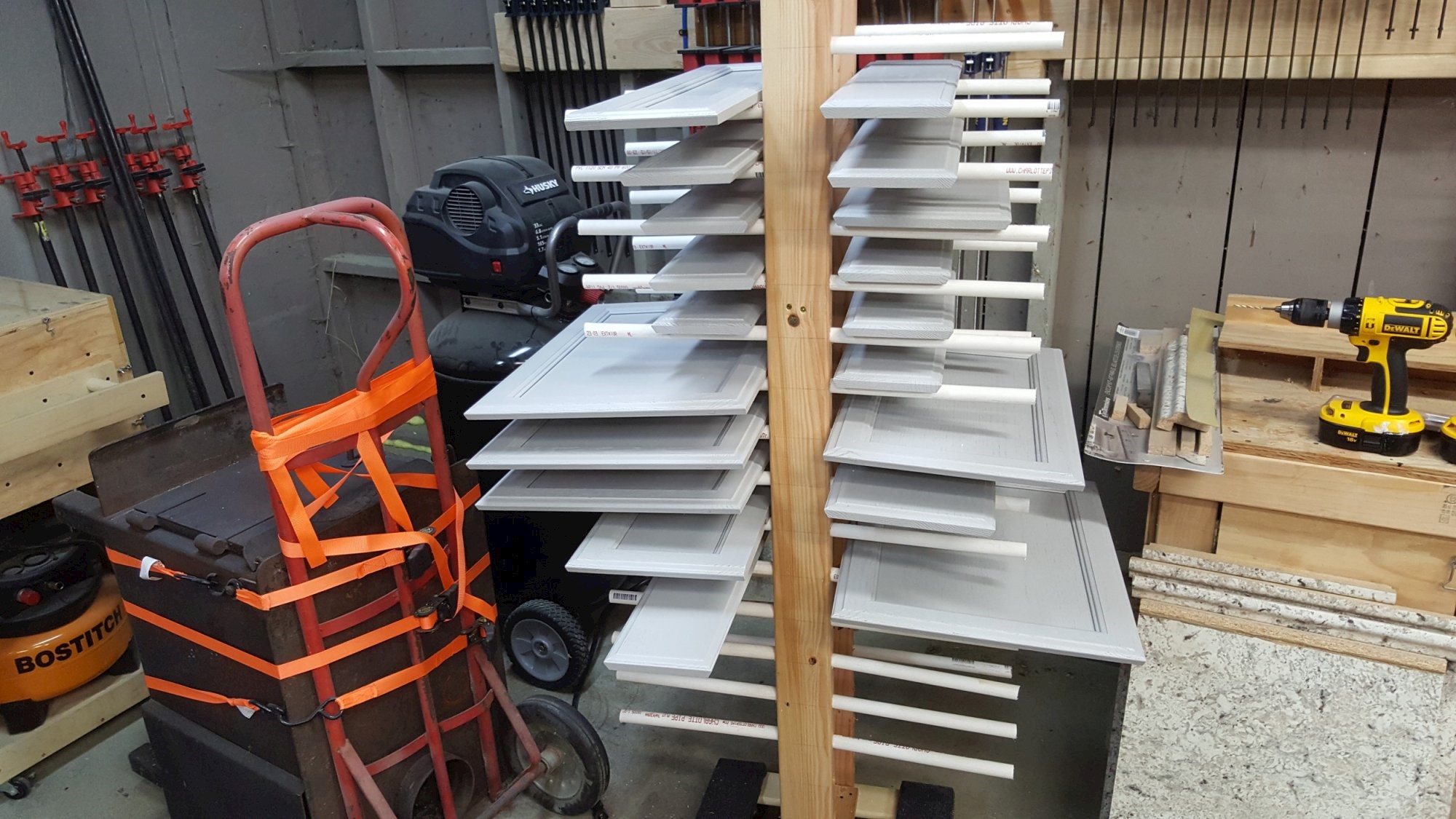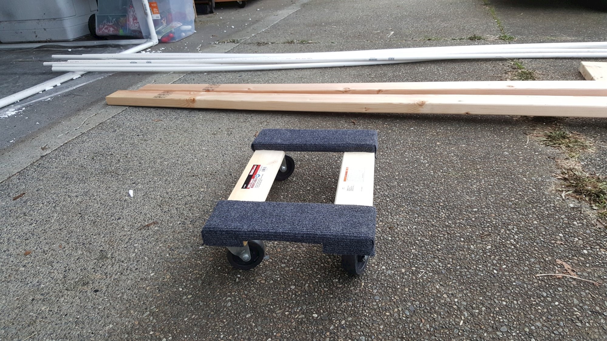 2x23-tier rack for storing finished furniture parts while drying. 2x4 Douglas Fir studs, 1x2 Douglas Fir furring strip, furniture moving dolly, 1/2" PVC pipe, and screws.