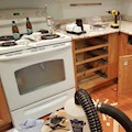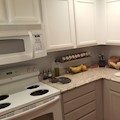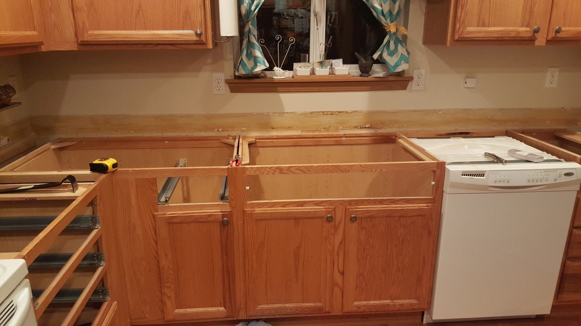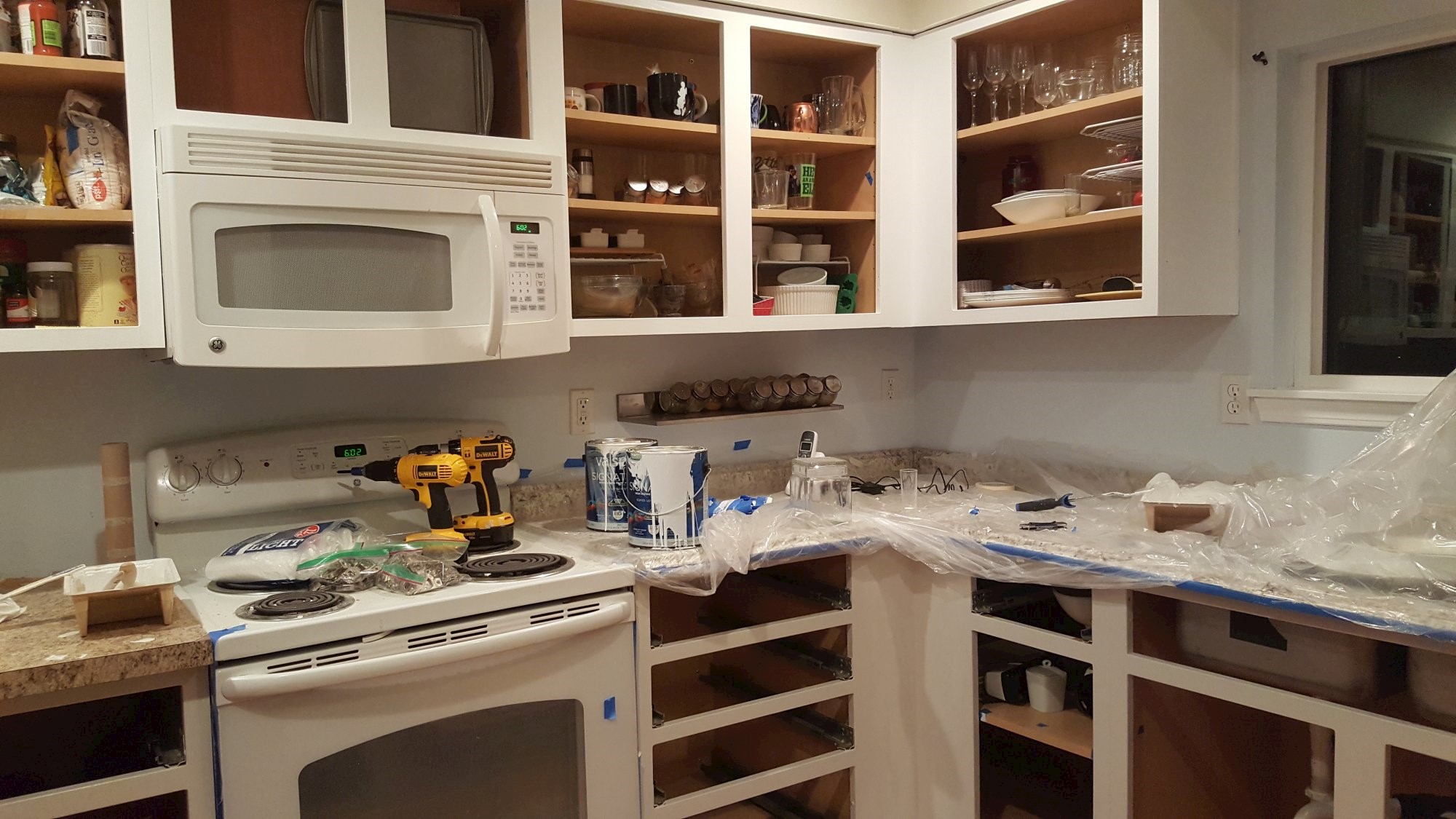 While the counter tops were off, I thought it was a good idea to also paint the wall behind them an accent color, and the cabinets themselves to cover up the god-awful Golden Oak color.