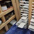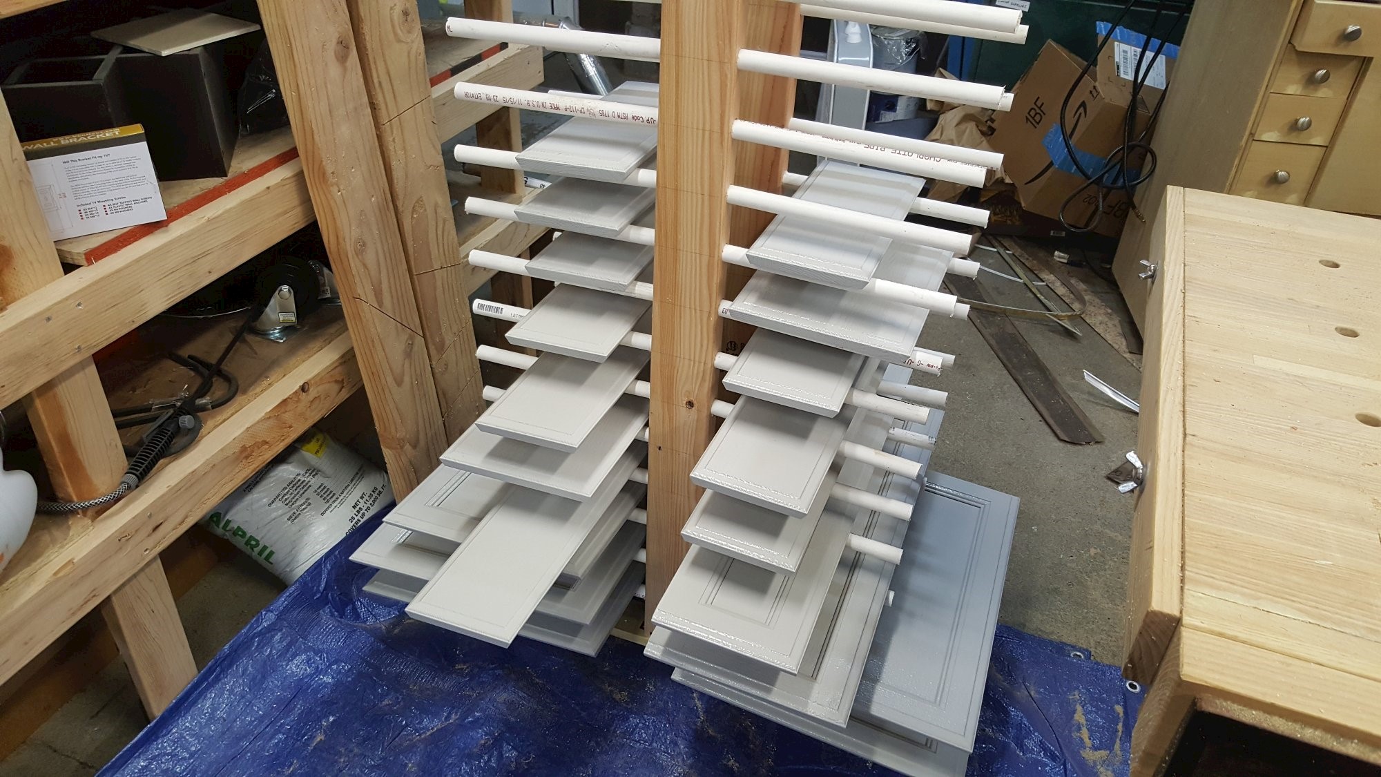 On the verge of painting about 40 cabinet doors and drawer fronts, I thought it would be a good idea to build a spray booth and finishing rack in the garage to expedite the process.