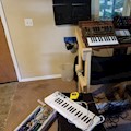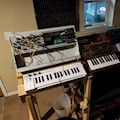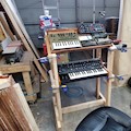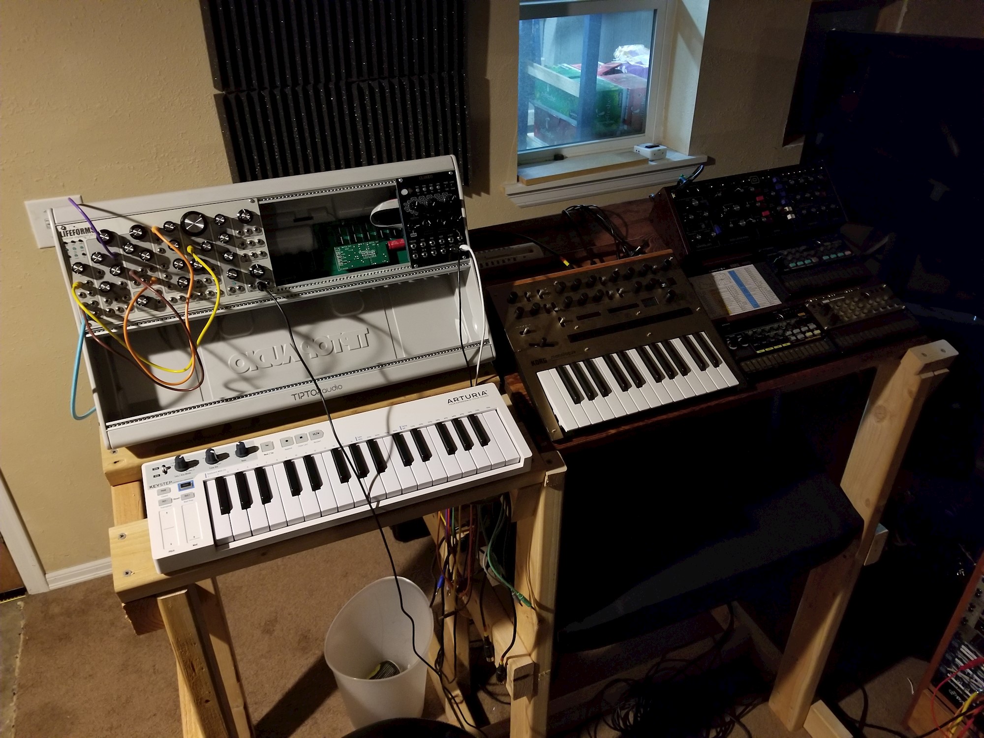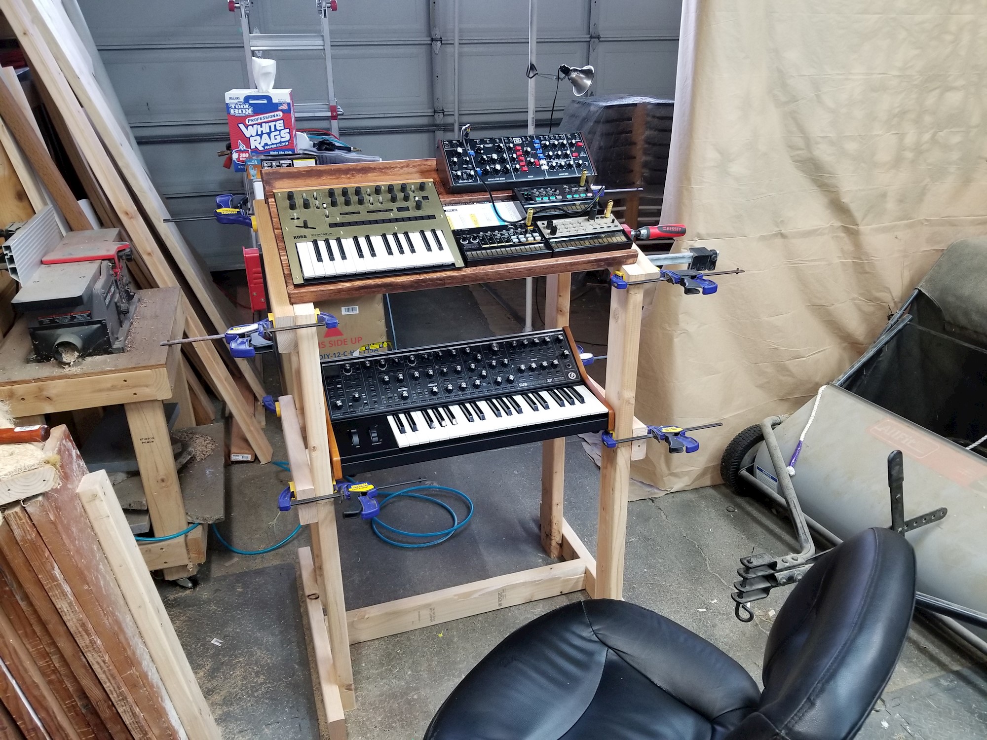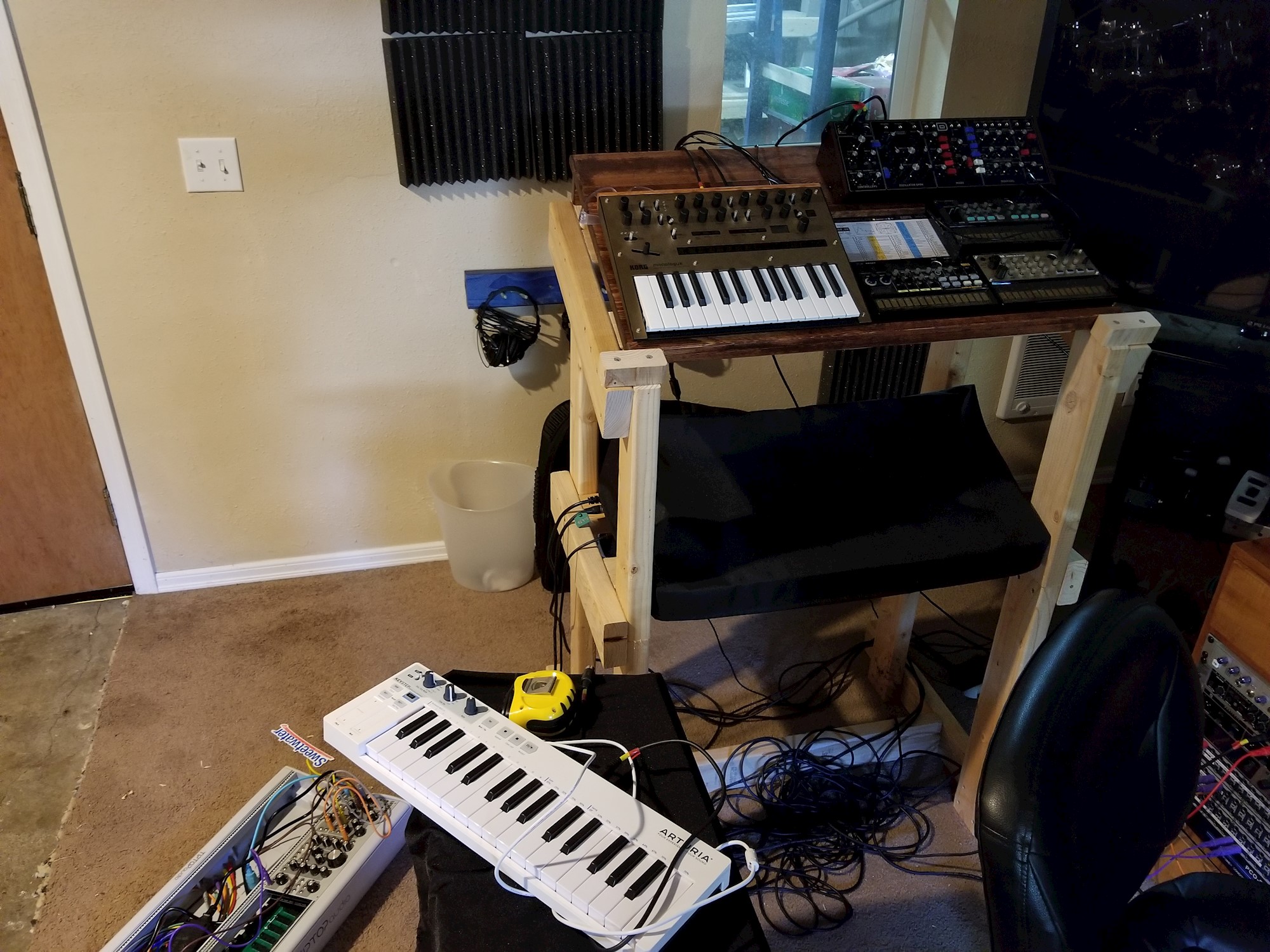 Shelves for the various synthesizers I've been collecting. Ran out of room on my desk, so I had to expand to the side. Stayed really simple for the moment to solve some urgent storage needs.