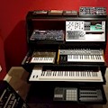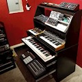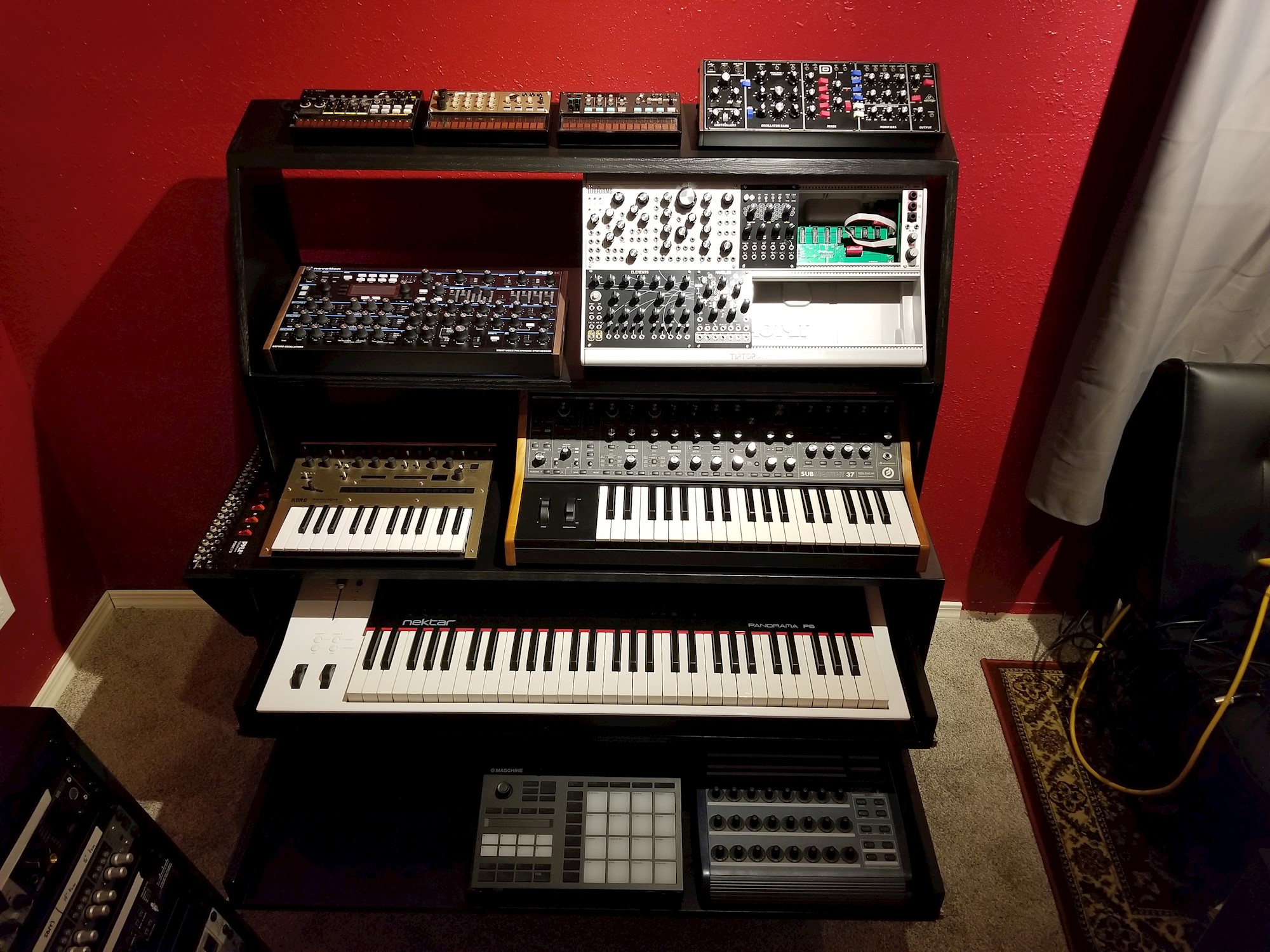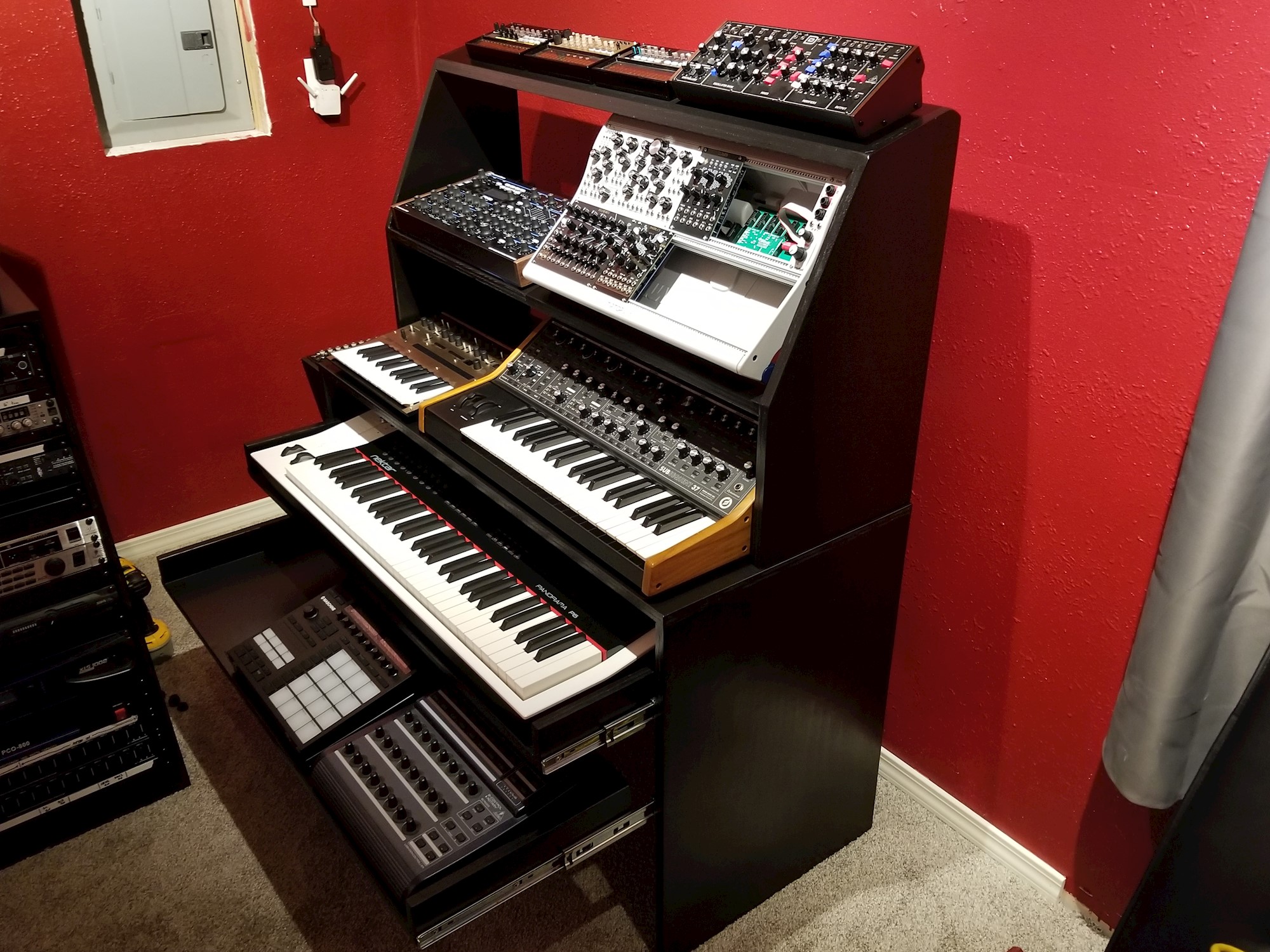 The 2x4 synth shelving was temporary. Built a modular unit with angled shelves to get everything in one spot, and finished it to match Mixing Desk #2.