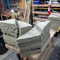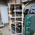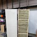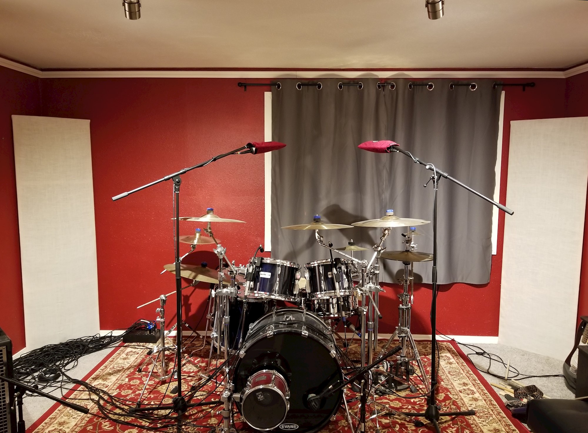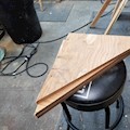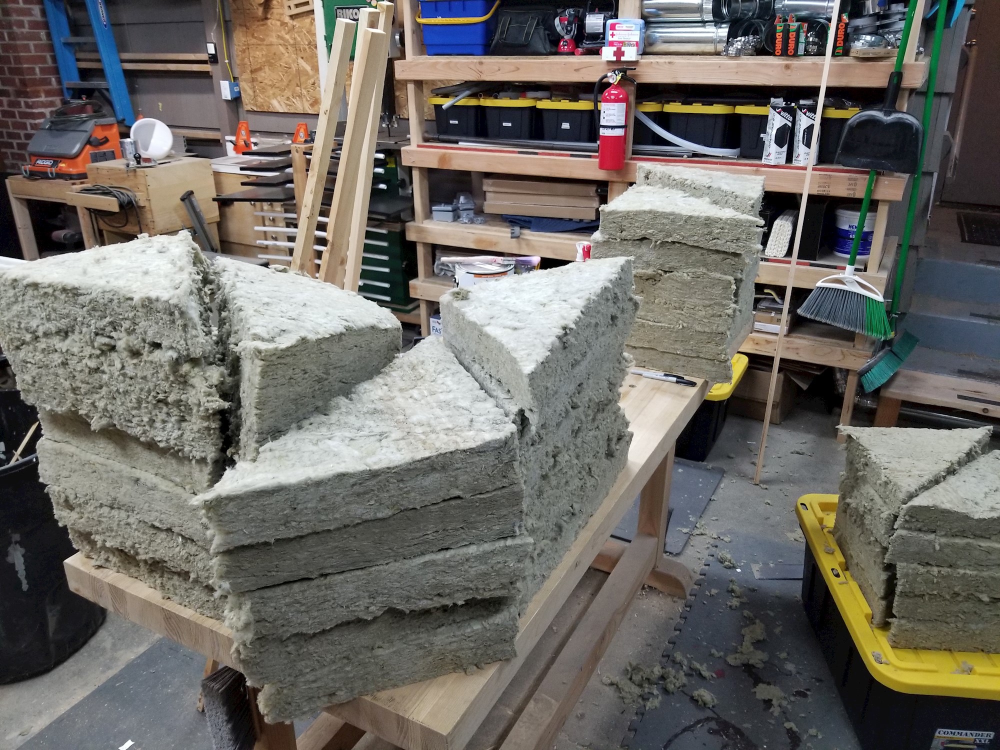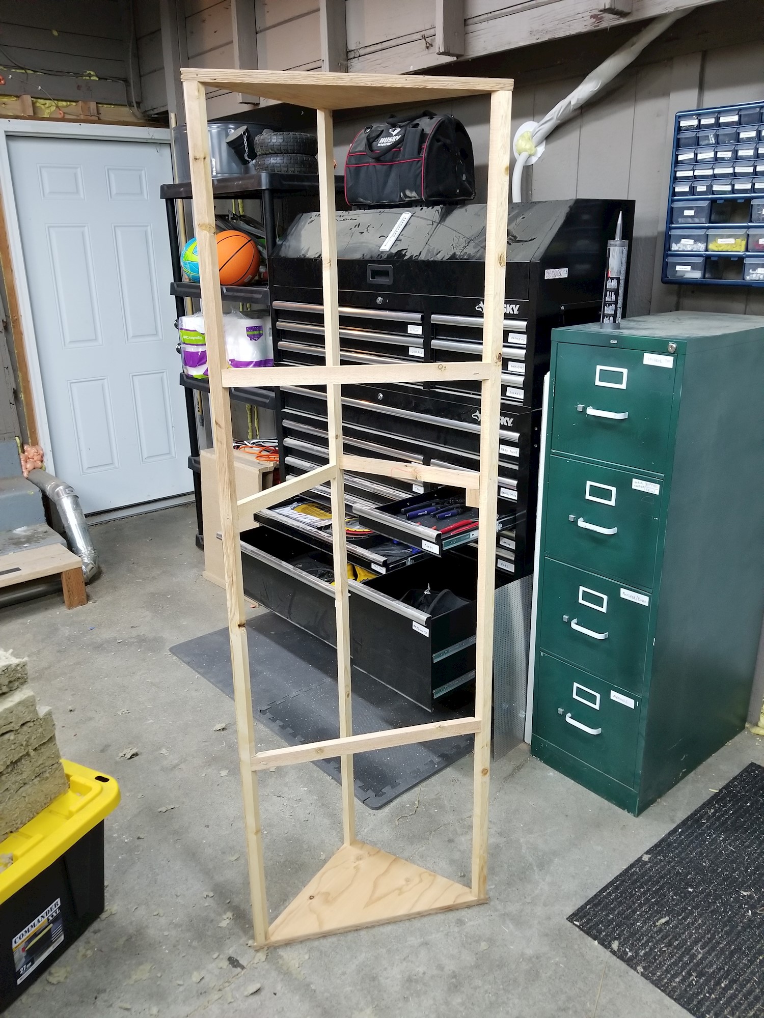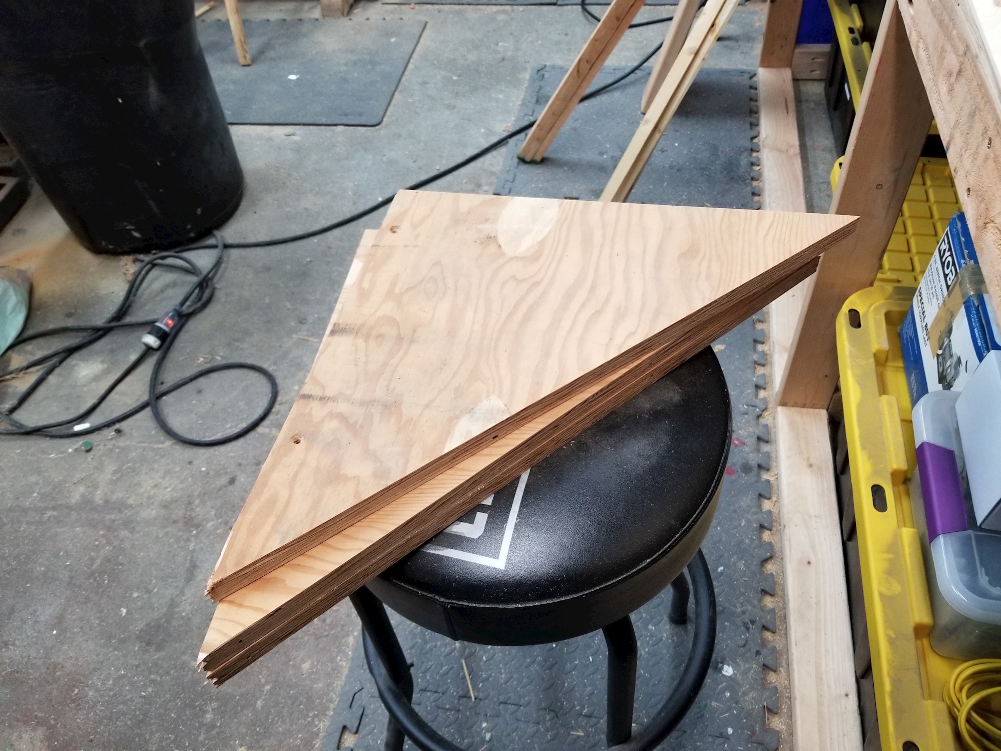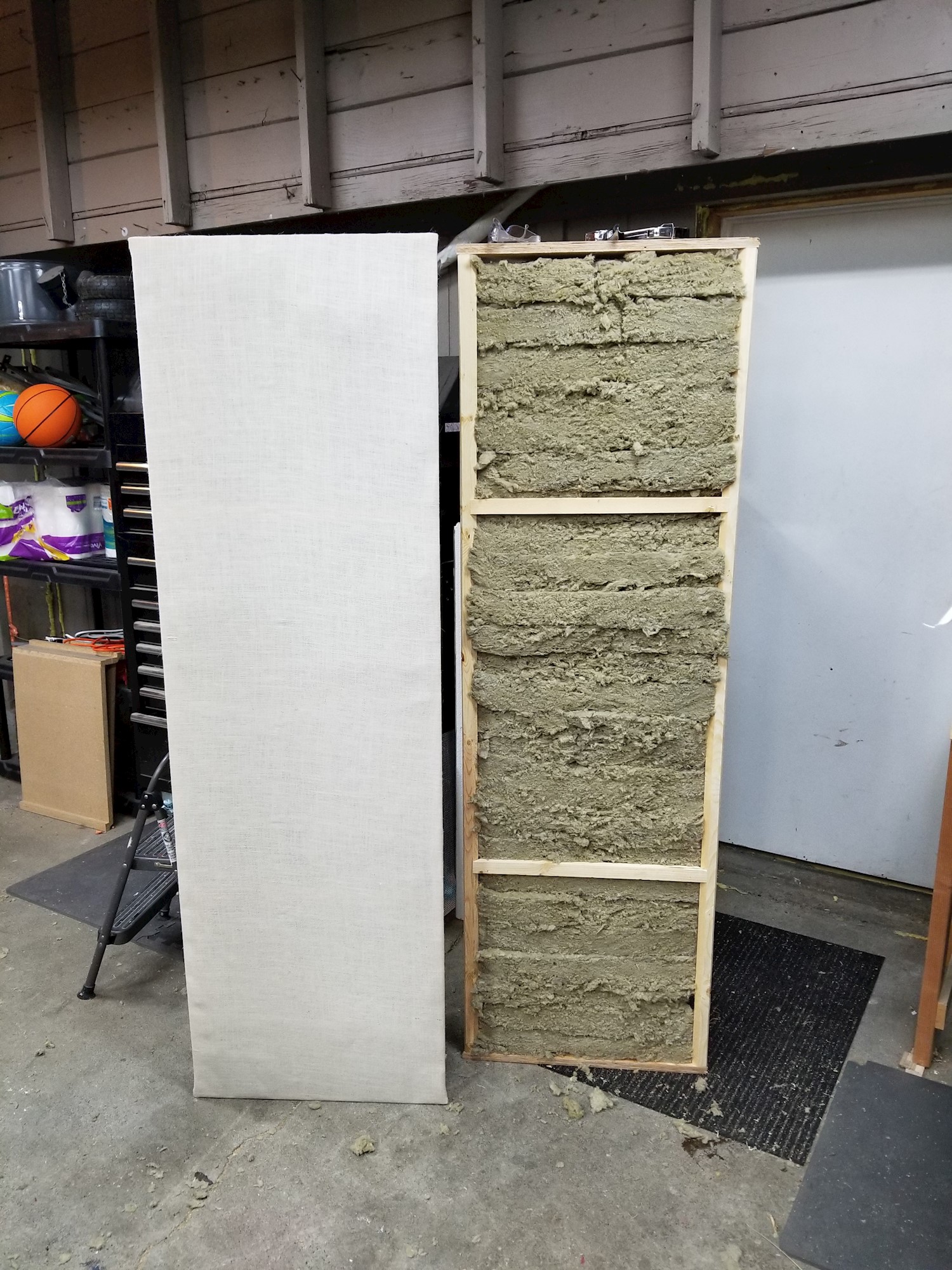 Using up the rest of the leftover materials from the acoustic panels I built a few years back, I made some corner bass traps. 1 bag of Roxul, my remaining fabric, plywood bases, and 1x3 boards as framing members.