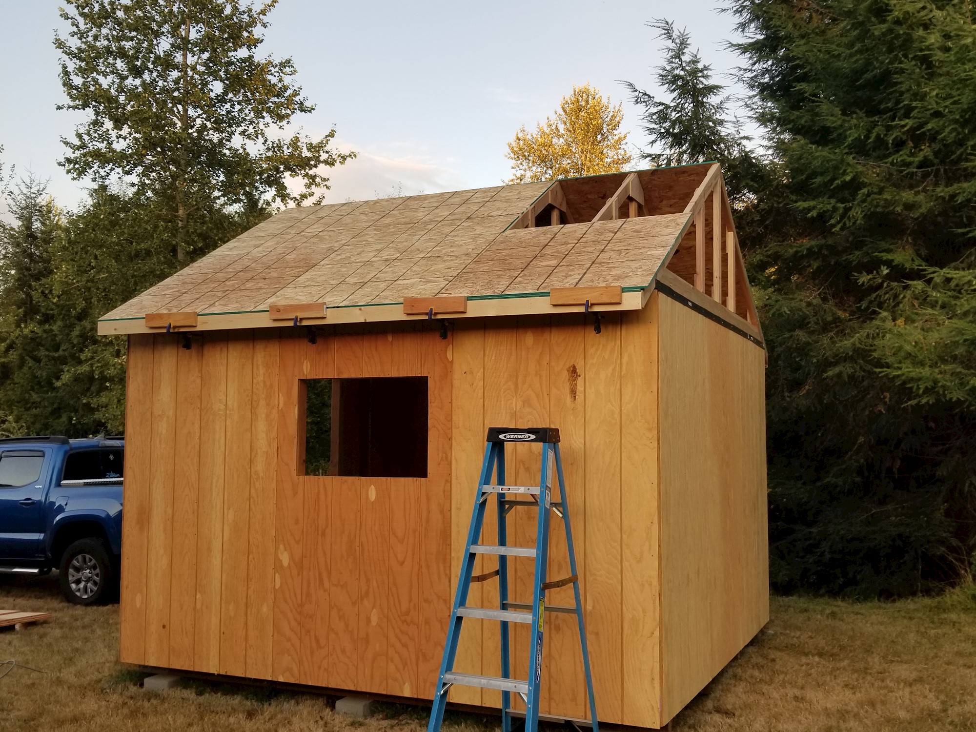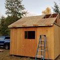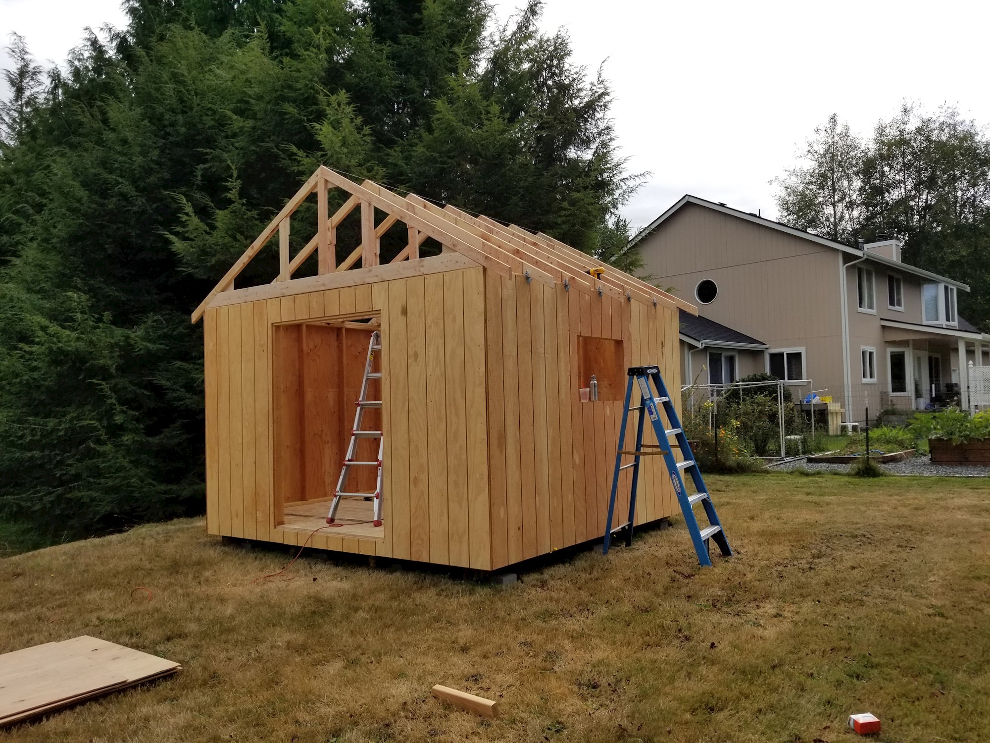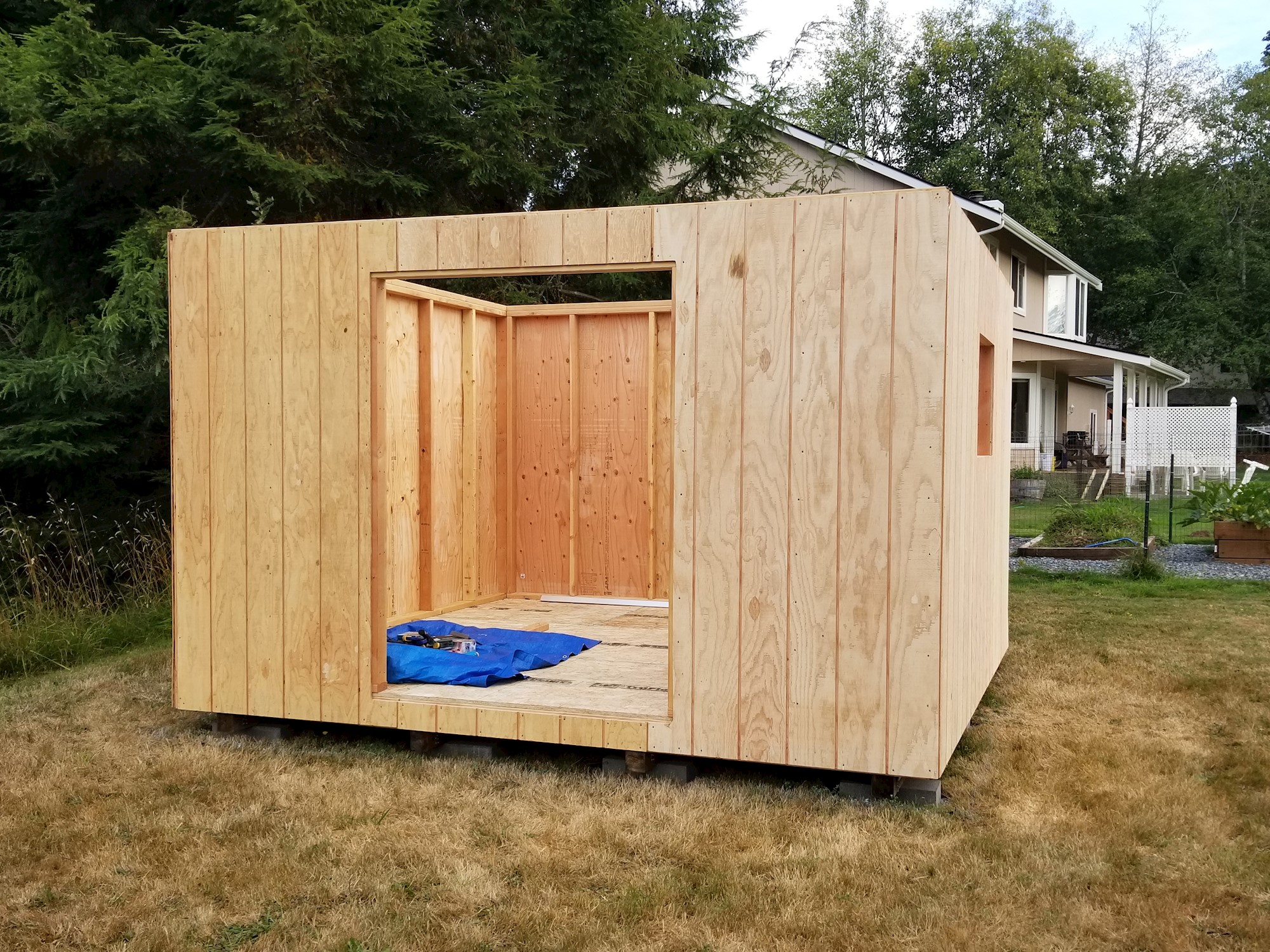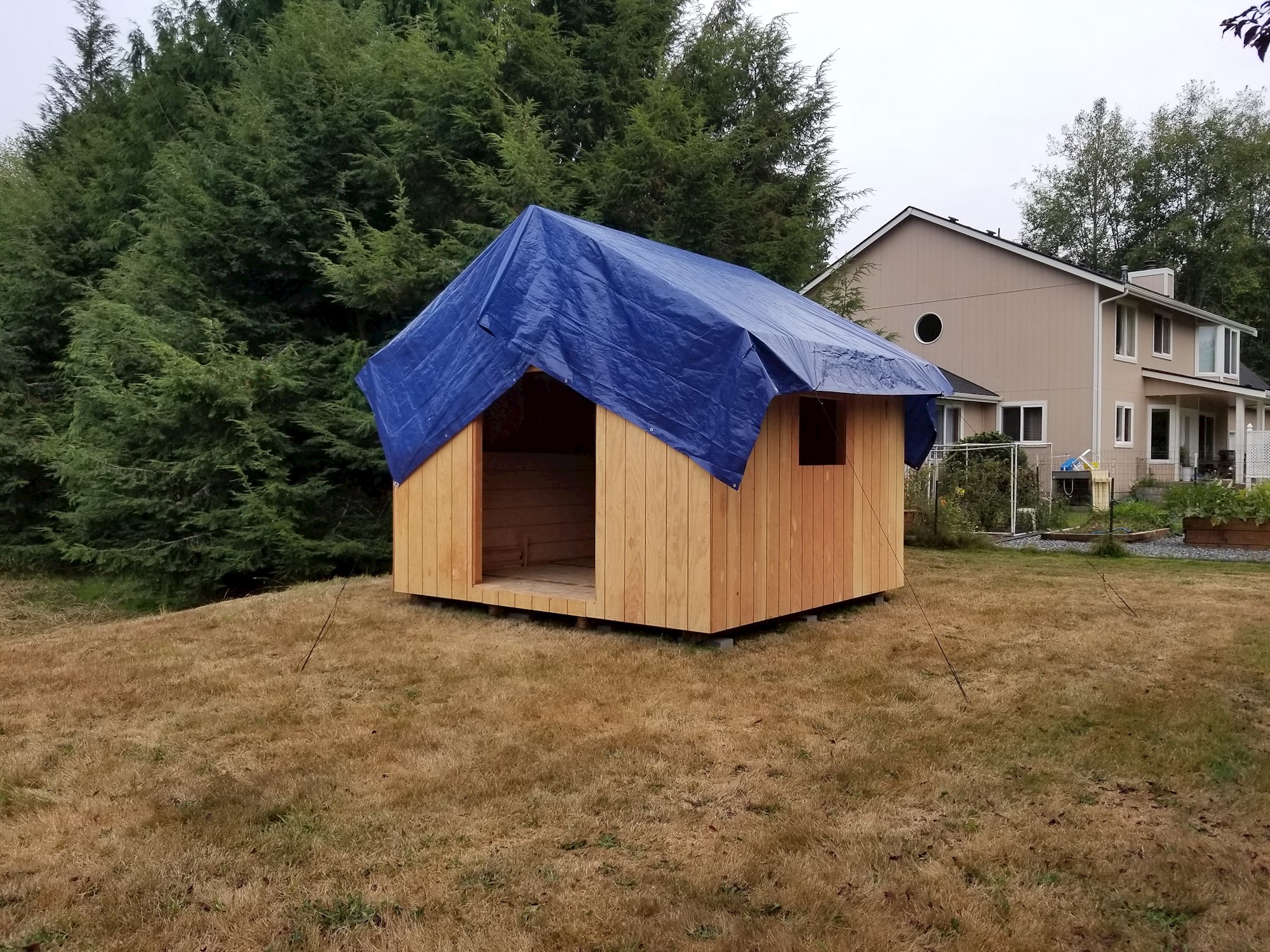 Made massive progress in the first three weeks, and then fall came early. Then it was a matter of waiting days for the rain to abate long enough to get the remaining week-ish of work done, a couple hours at a time. Finally put doors on the thing about 2 months after starting.