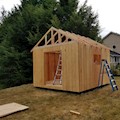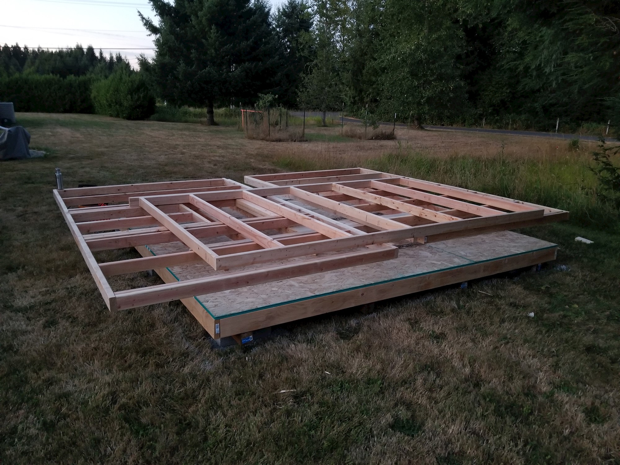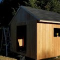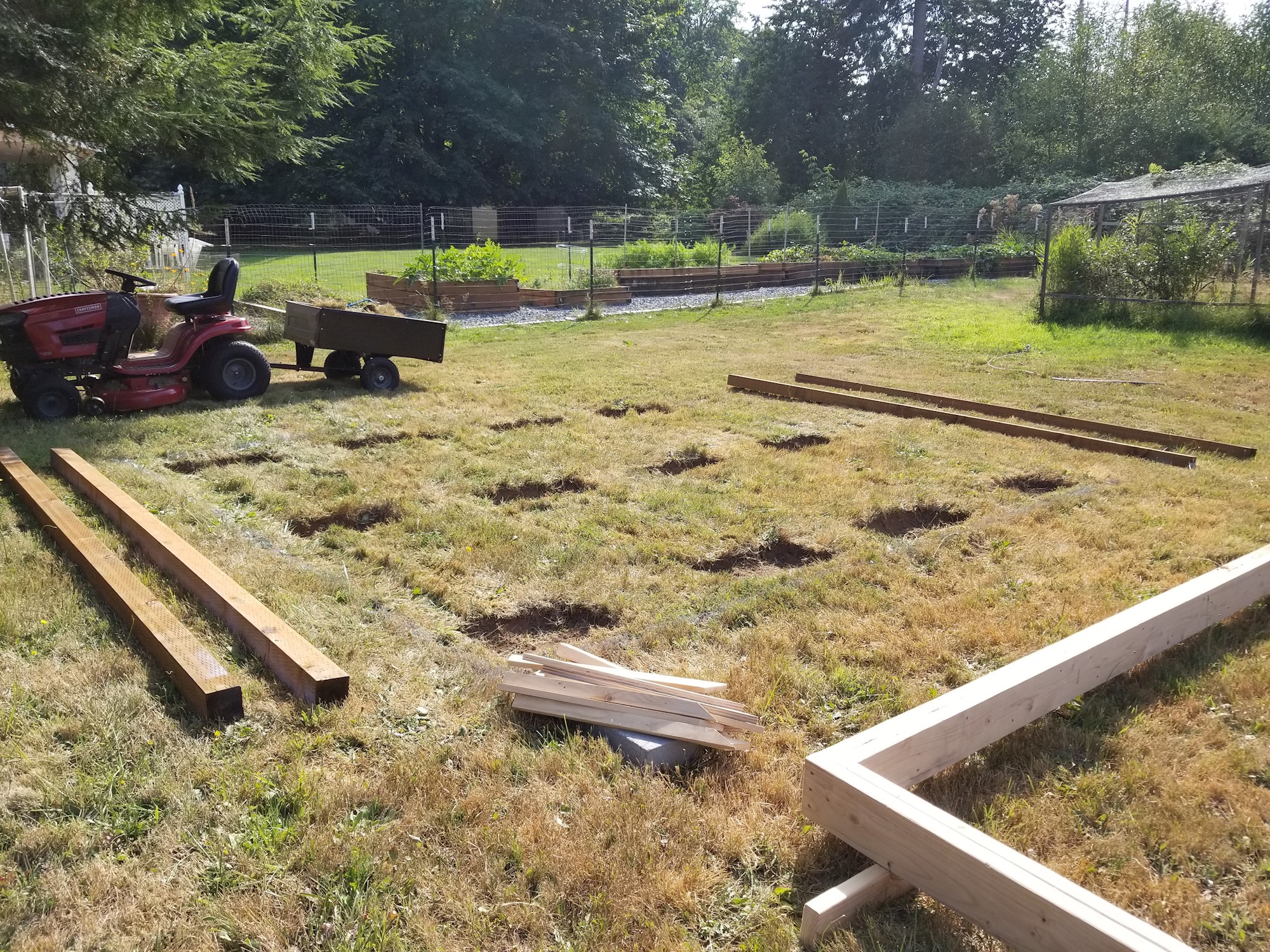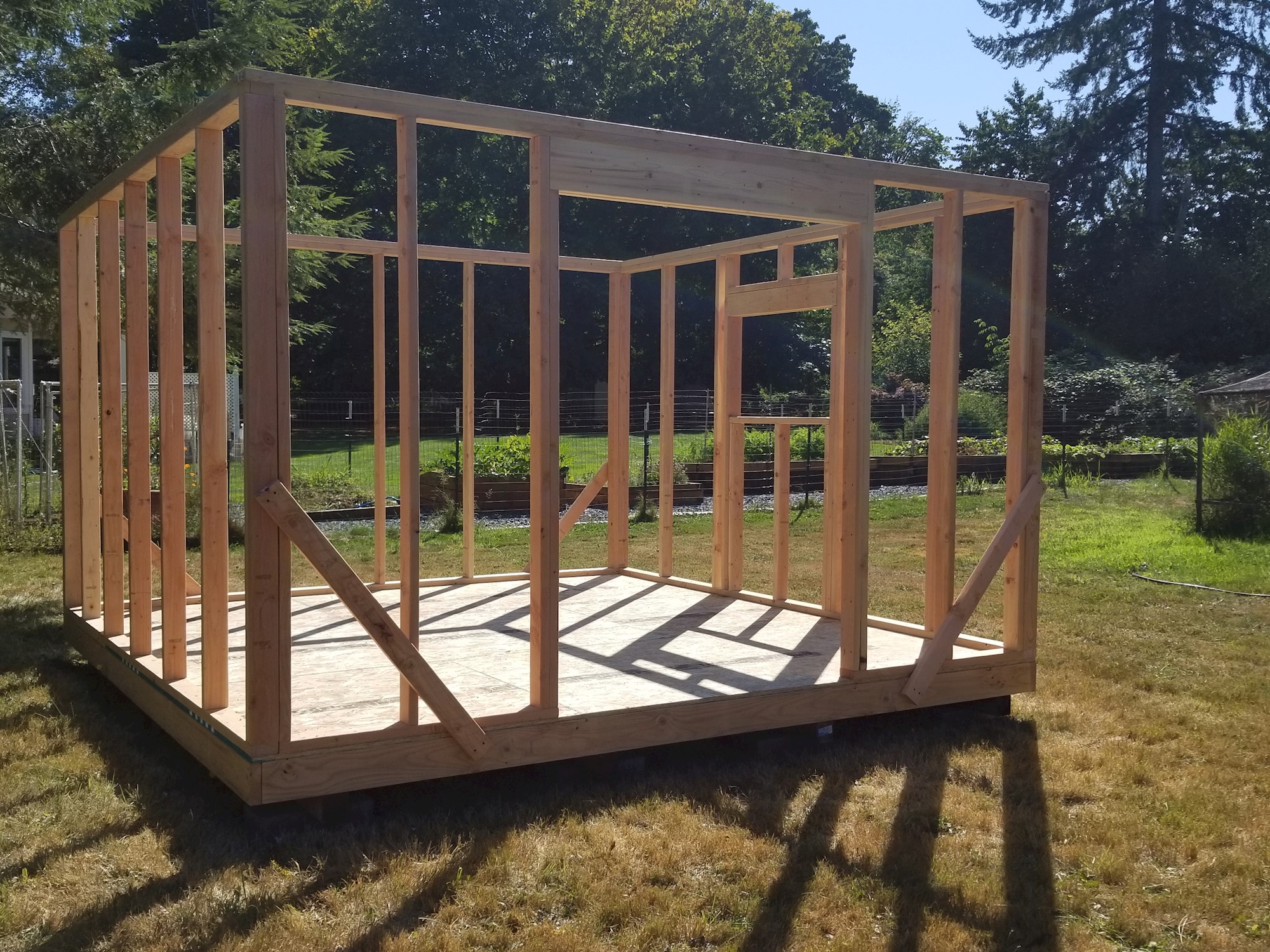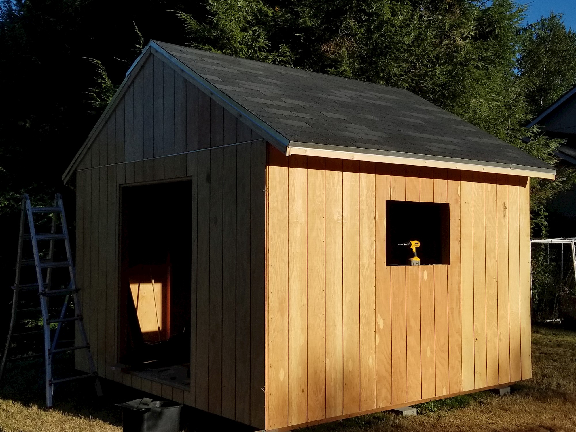 Made massive progress in the first three weeks, and then fall came early. Then it was a matter of waiting days for the rain to abate long enough to get the remaining week-ish of work done, a couple hours at a time. Finally put doors on the thing about 2 months after starting.