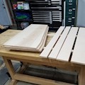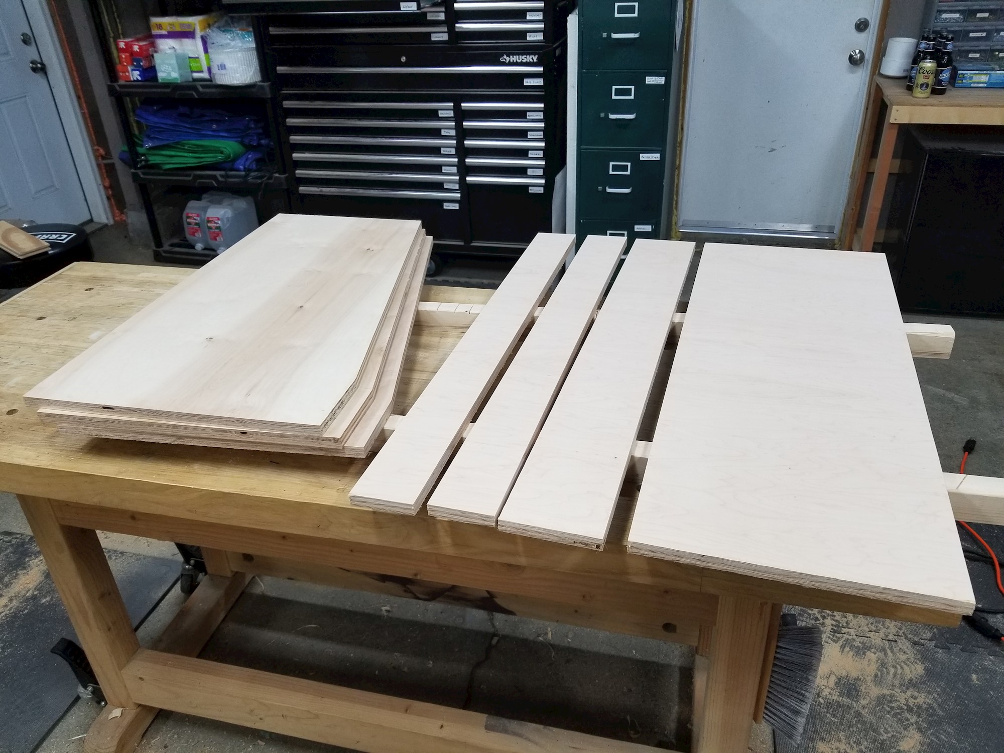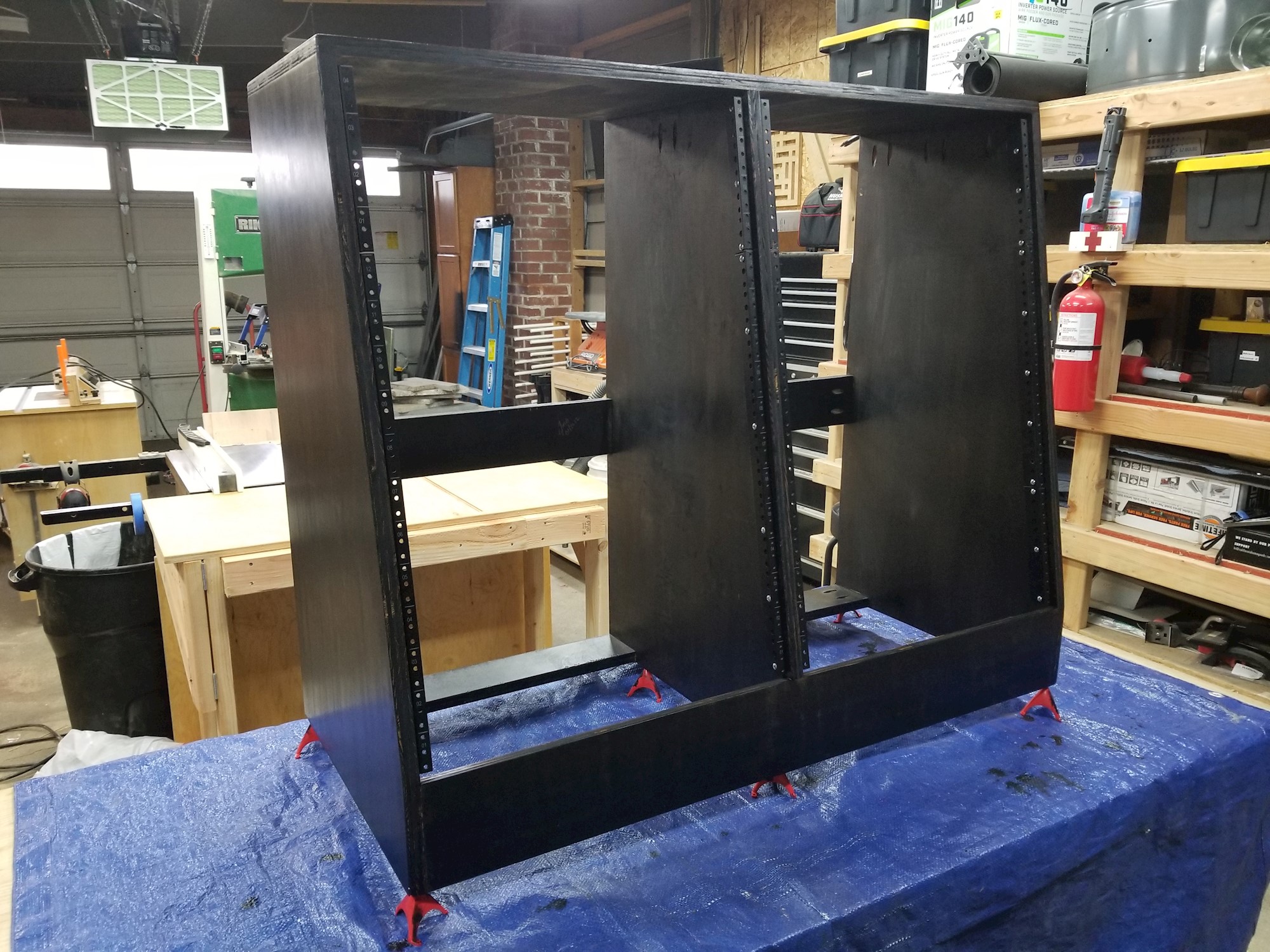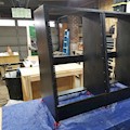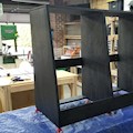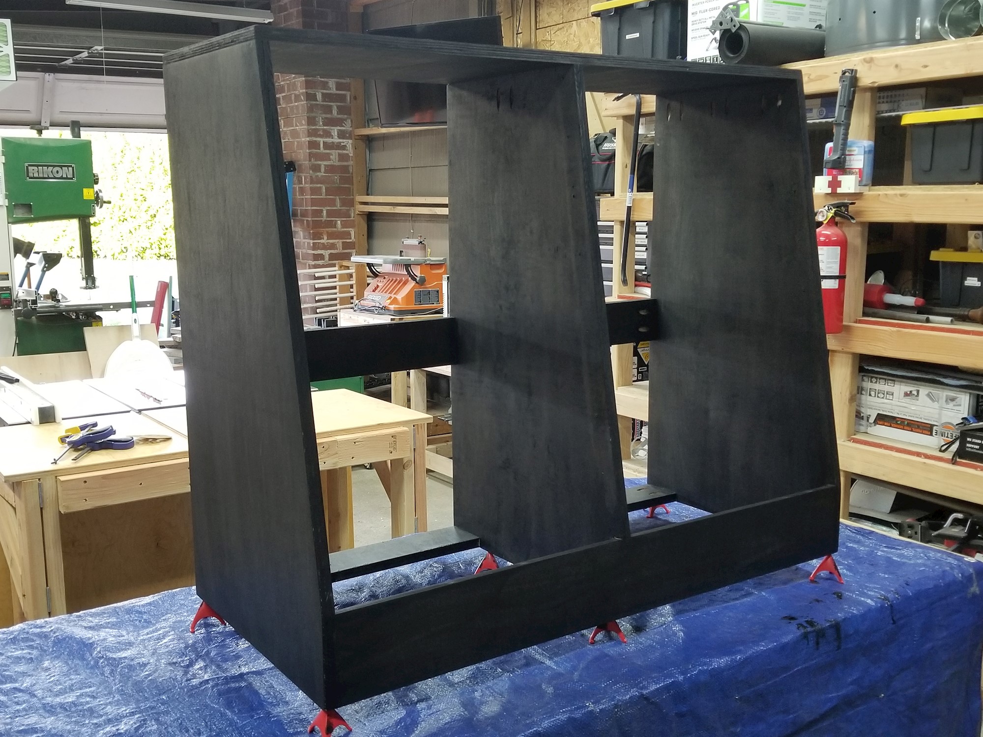 1 sheet of plywood, baby! This also served as an experiment with Minwax black stain (as opposed to the black spray lacquer I used on other studio furniture). The finish is definitely more durable than lacquer, but less repairable. And the first clear coat pulled some of the color out... usually this is barely noticeable, but on black it made it look "aged." Trade-offs.