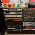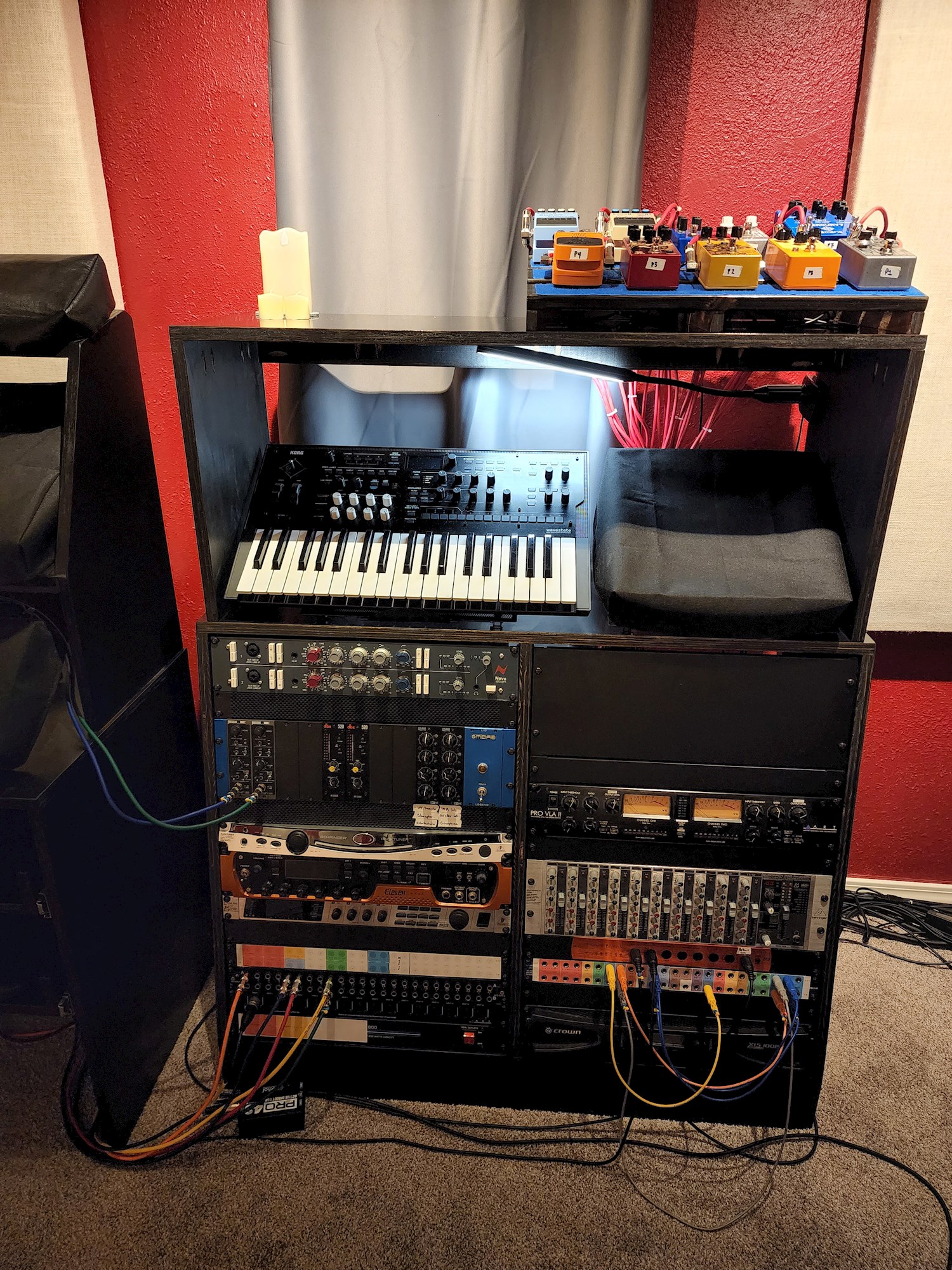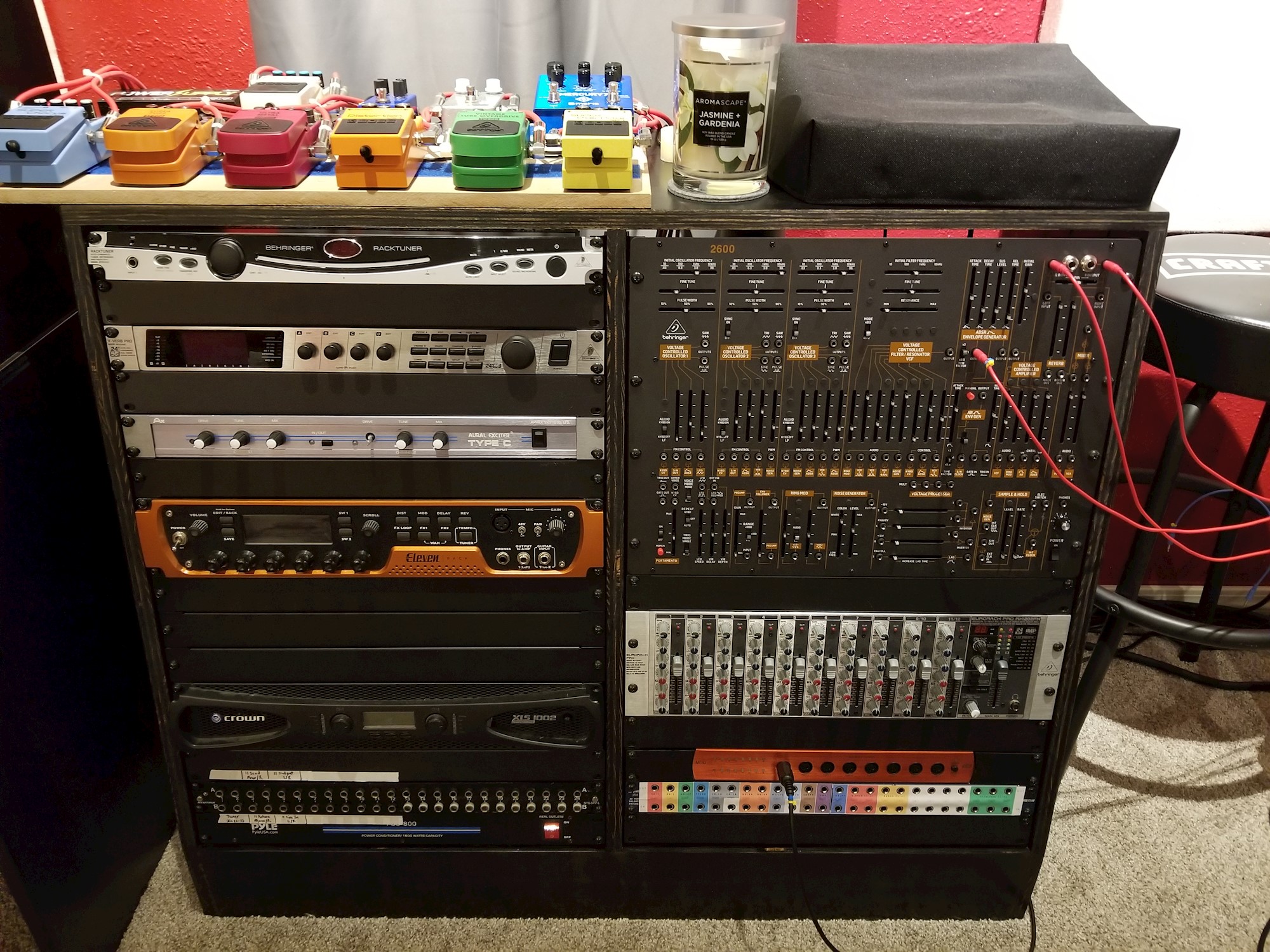 Needed a place to start pulling rack-mount FX units out of my main mixing desk racks (allowing more ventilation for the preamps, compressors, and tubes there). Filled it in with my new 2600 and miscellaneous guitar and Eurorack FX units I've had stored in the closet. The angle matches the racks on my mixing desk. I had 24U of extra rack rails lying around, so I bought enough extra to get to 16U per side.