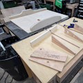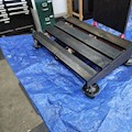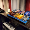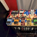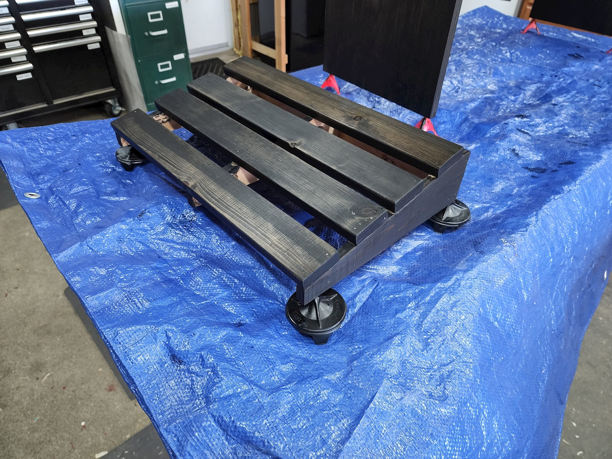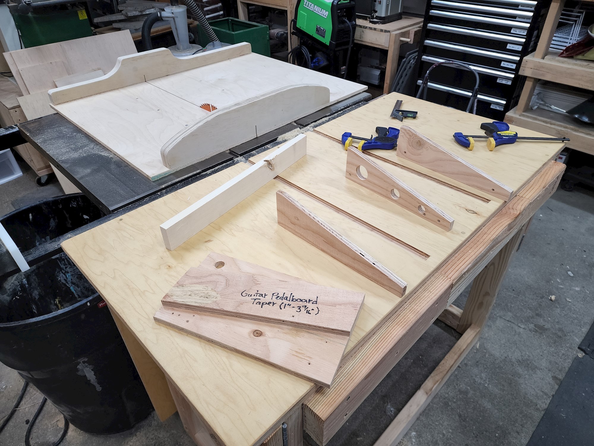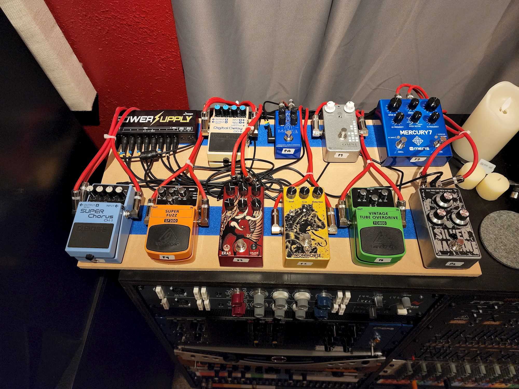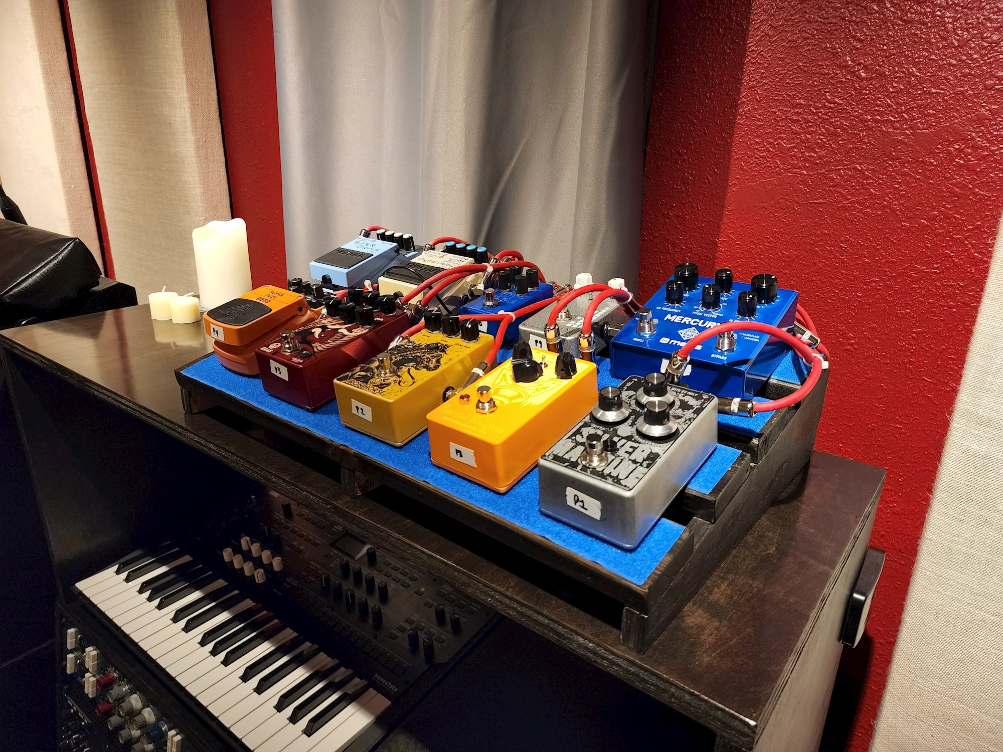 I have an ever-expanding collection of guitar pedals in use as studio effects, wired up through a patchbay and all. I had everything hook-and-loop-fastened to a scrap piece of MDF, which is ugly. The collection has become a mainstay at this point, so it warranted a more color-matched wire-organized approach.