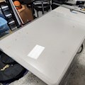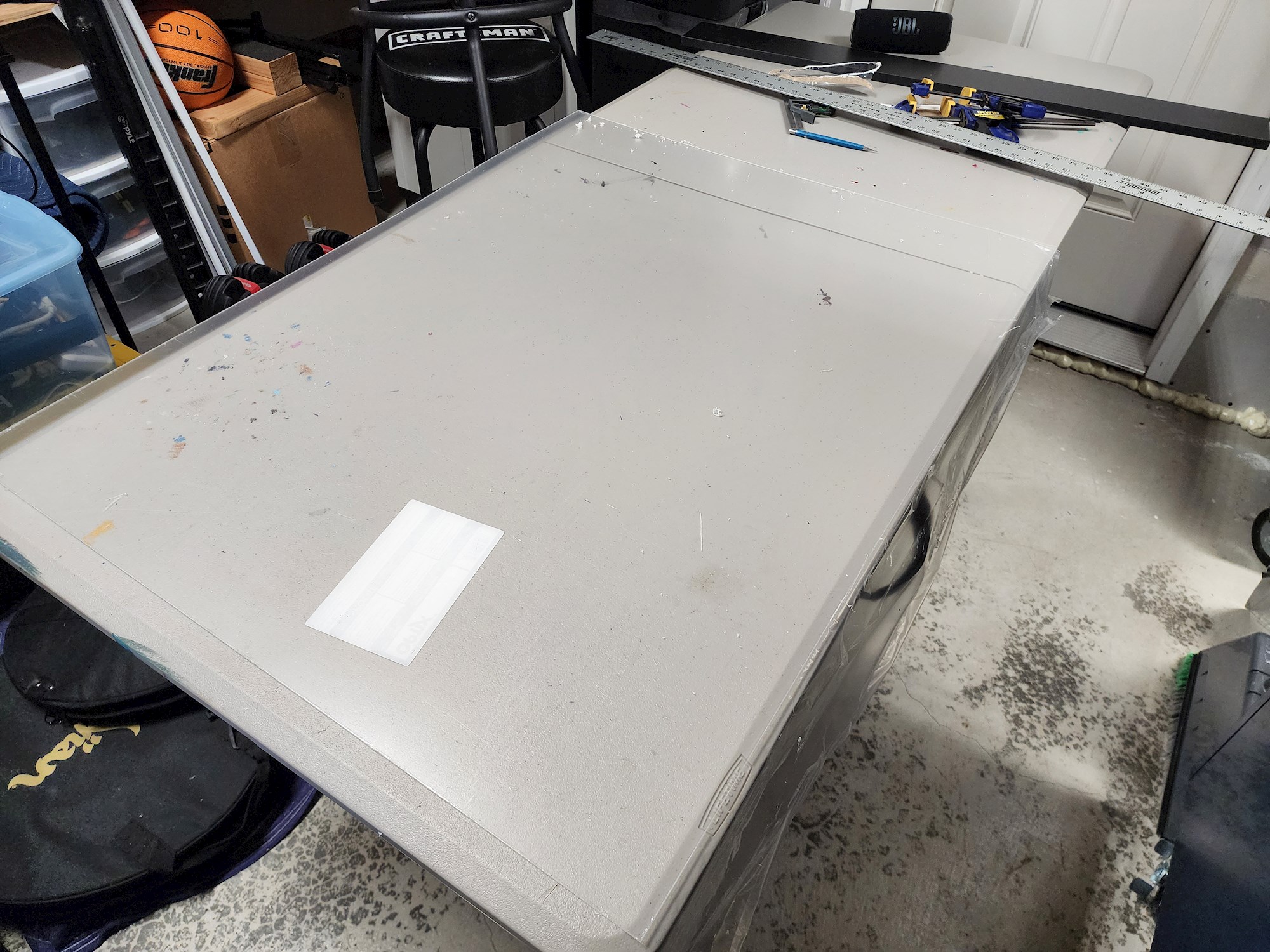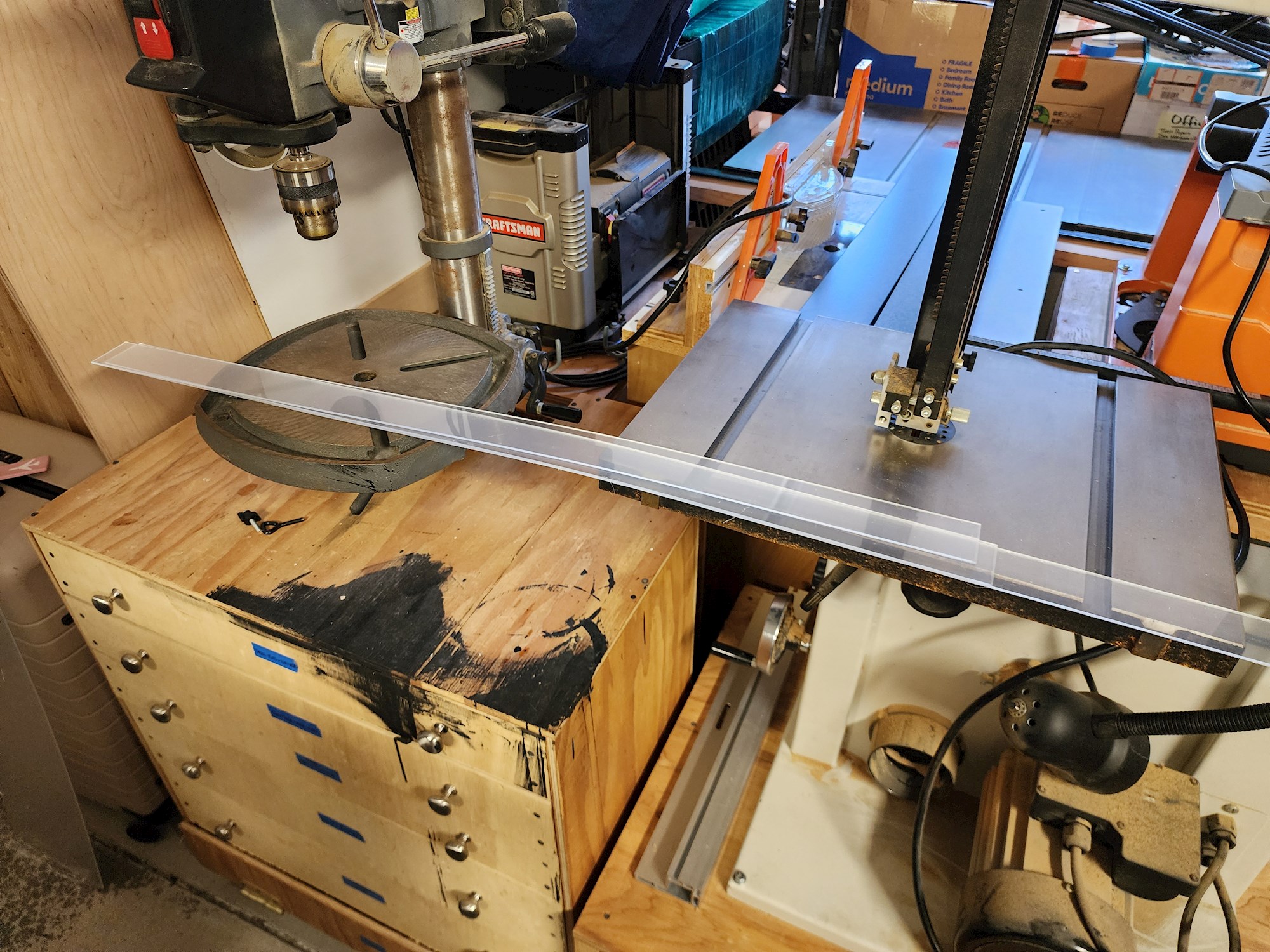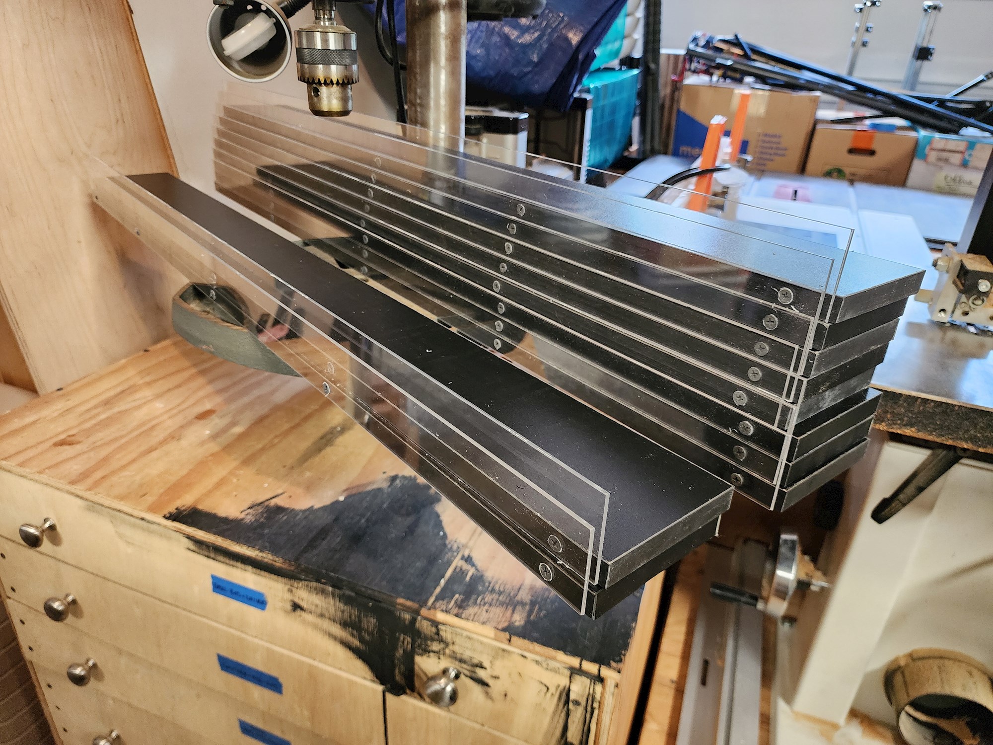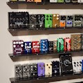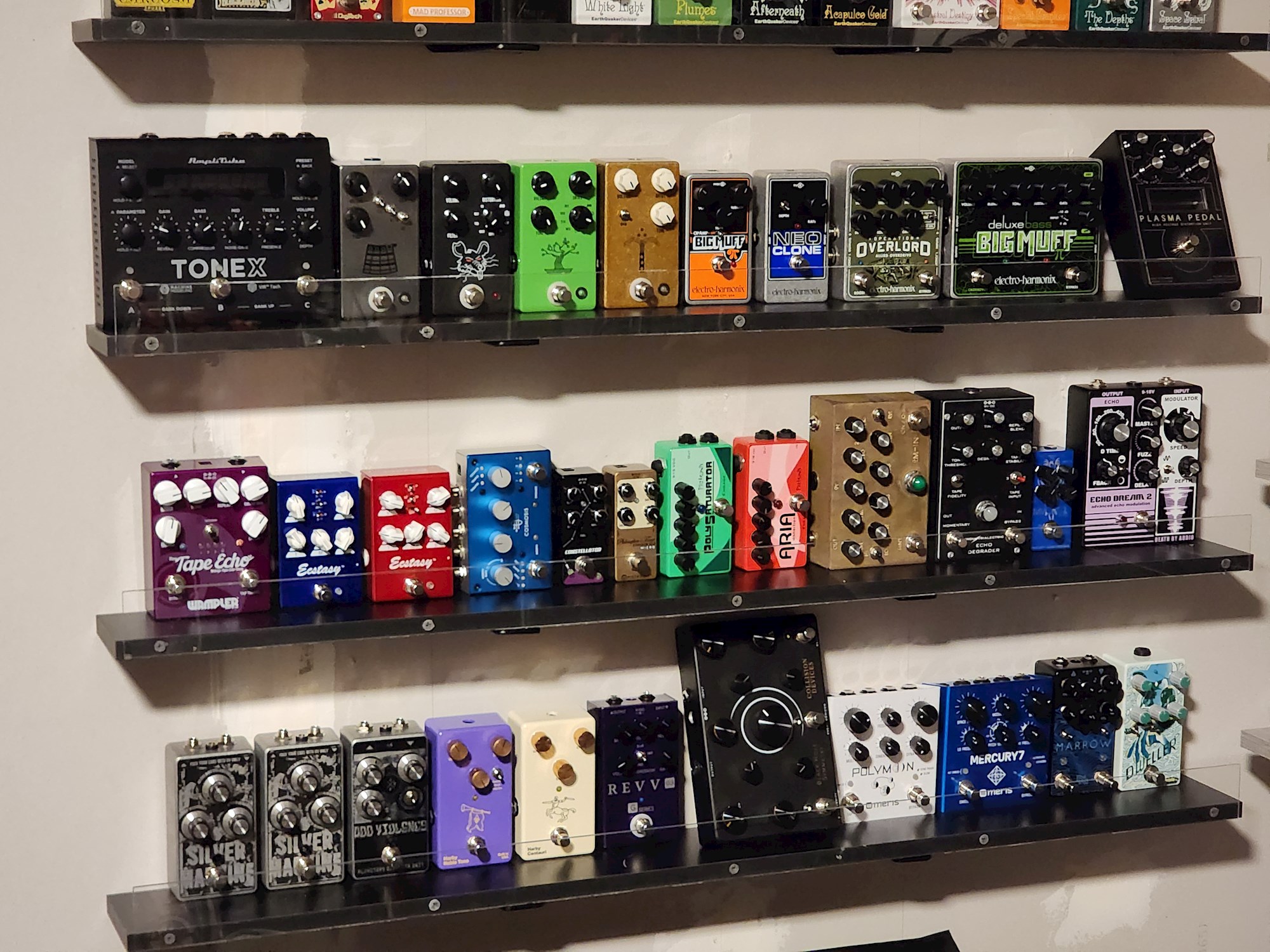 Store-bought 4" wide shelves with clear acrylic lip to prevent pedals from falling forward when something gets bumped.