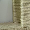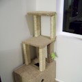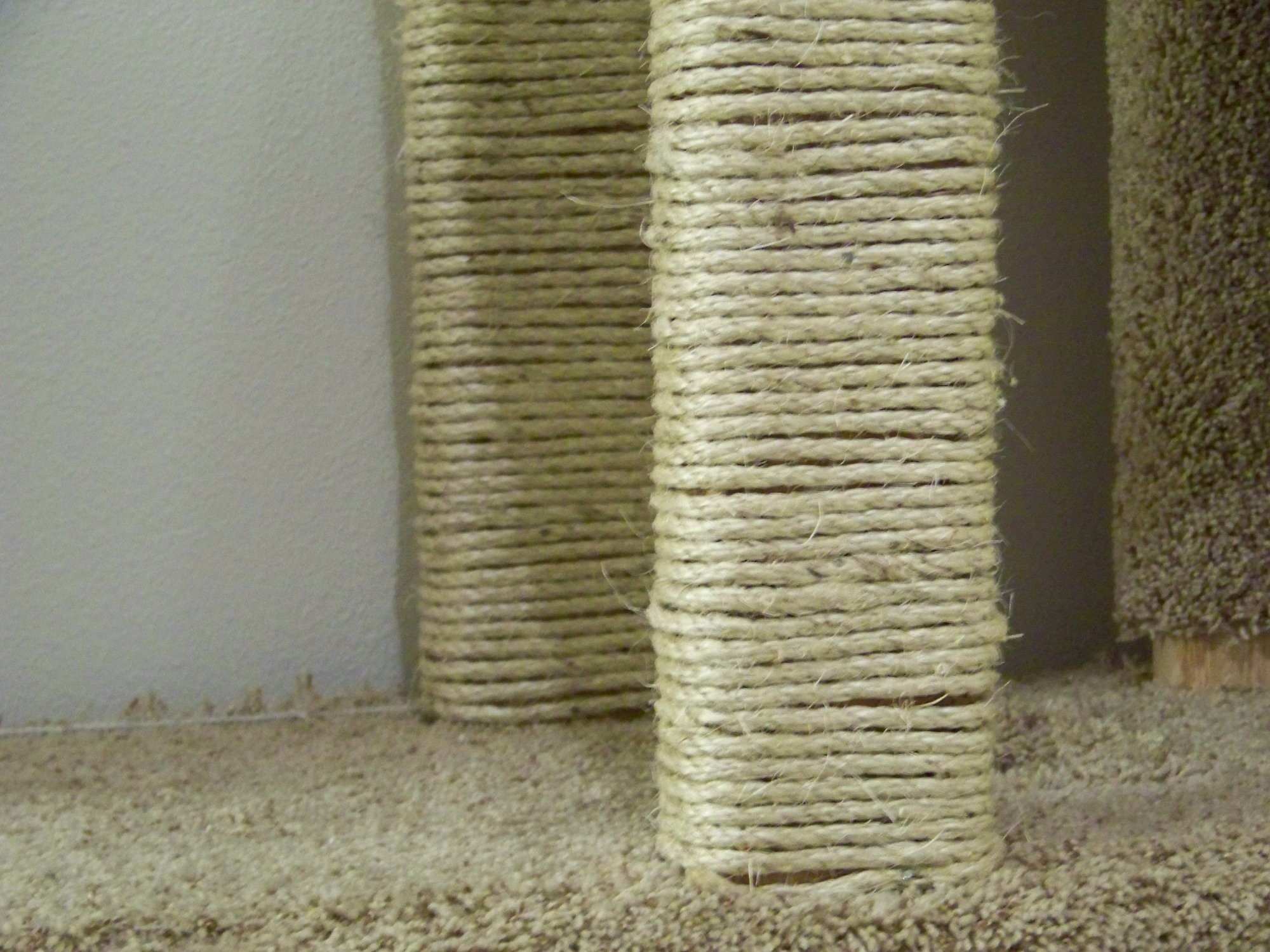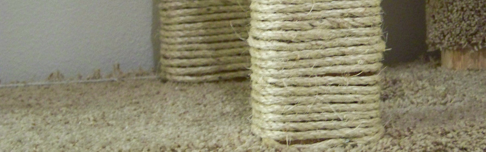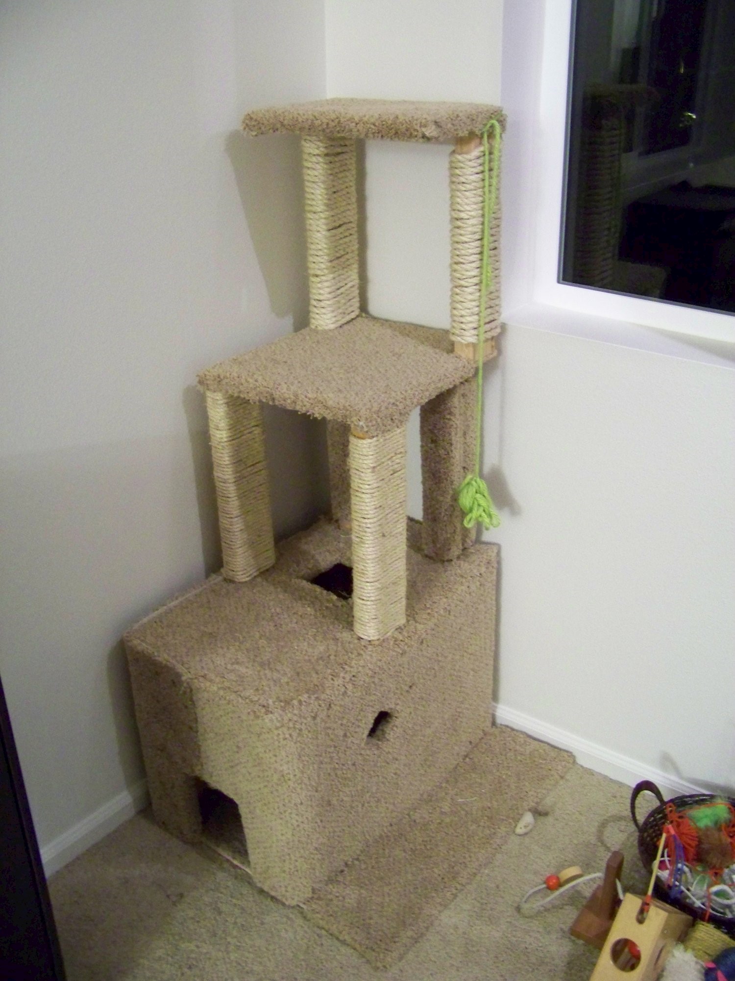 Cat house and scratching center upcycled from discarded construction site materials. OSB, studs, carpet remnants, and sisal rope. No finish.