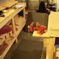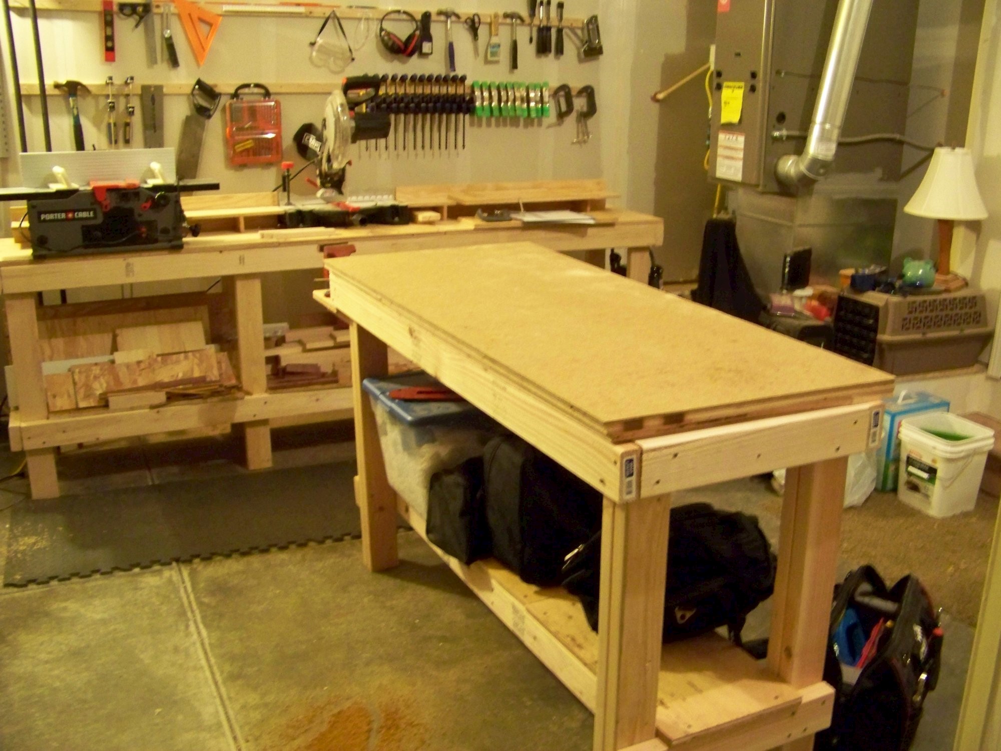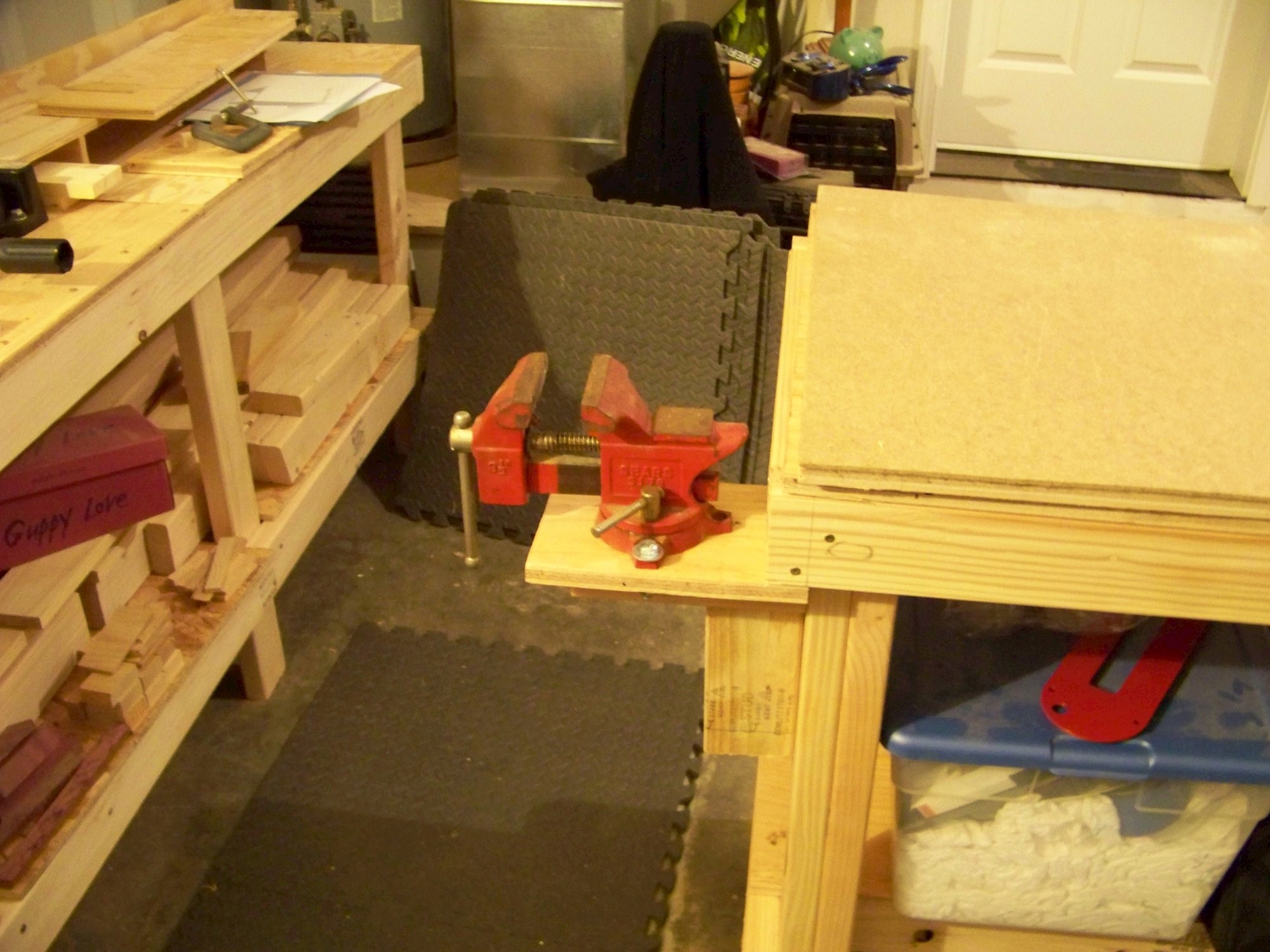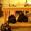 Shop work surface and storage shelf with replaceable top. Fir plywood, HDF hardboard, laminated studs. No finish.