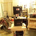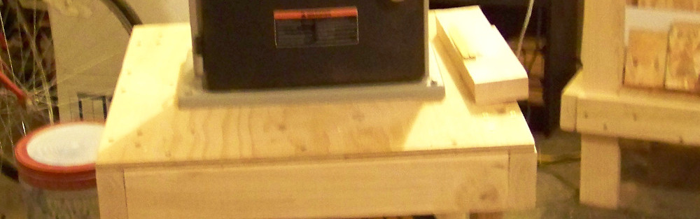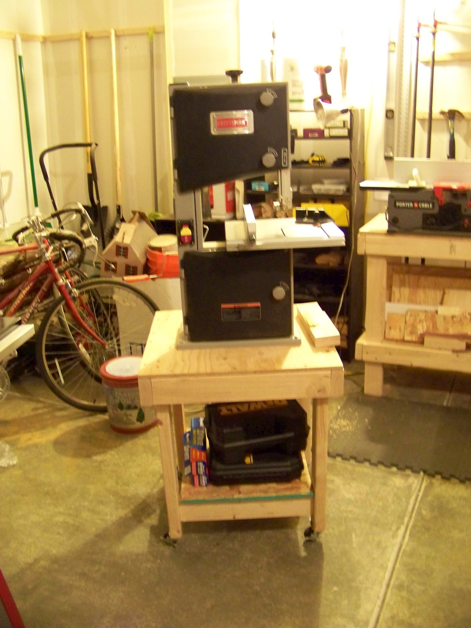 Benchtop bandsaw stand with integrated storage and mobility. Studs, plywood, OSB, and small casters. No finish.