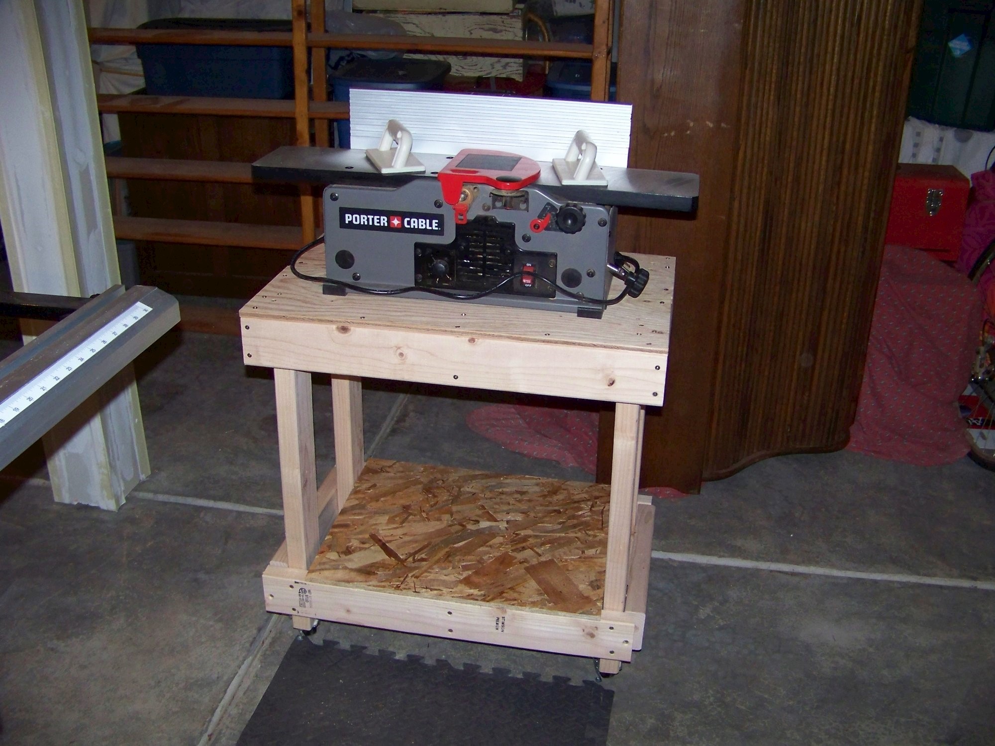 Benchtop jointer stand with integrated storage and mobility. Studs, plywood, OSB, and casters. No finish.