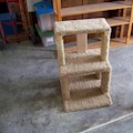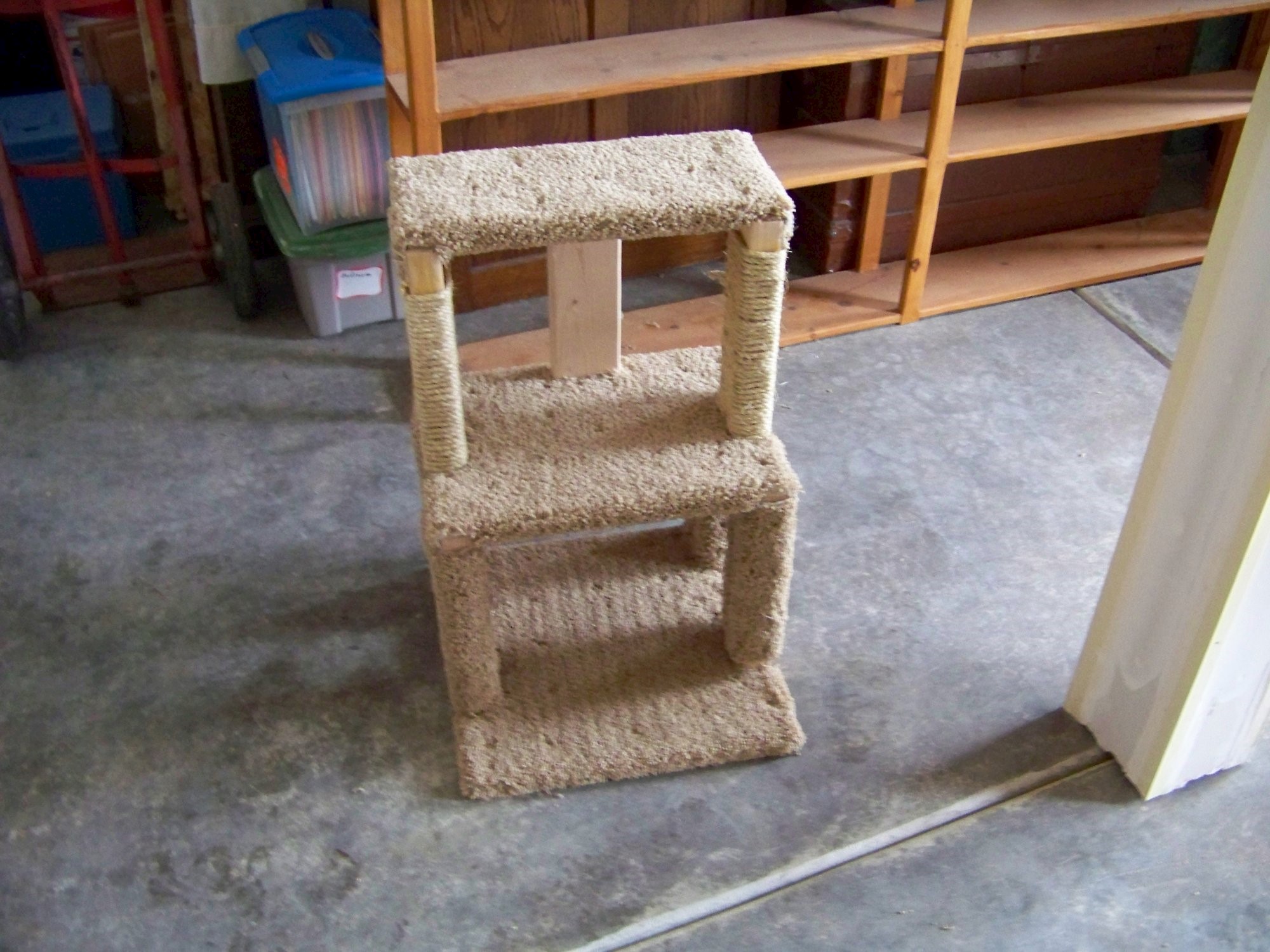 Cat shelves and scratching post from leftover materials, given as a gift to my mom. Studs, OSB, carpet remnants, and sisal rope. No finish.